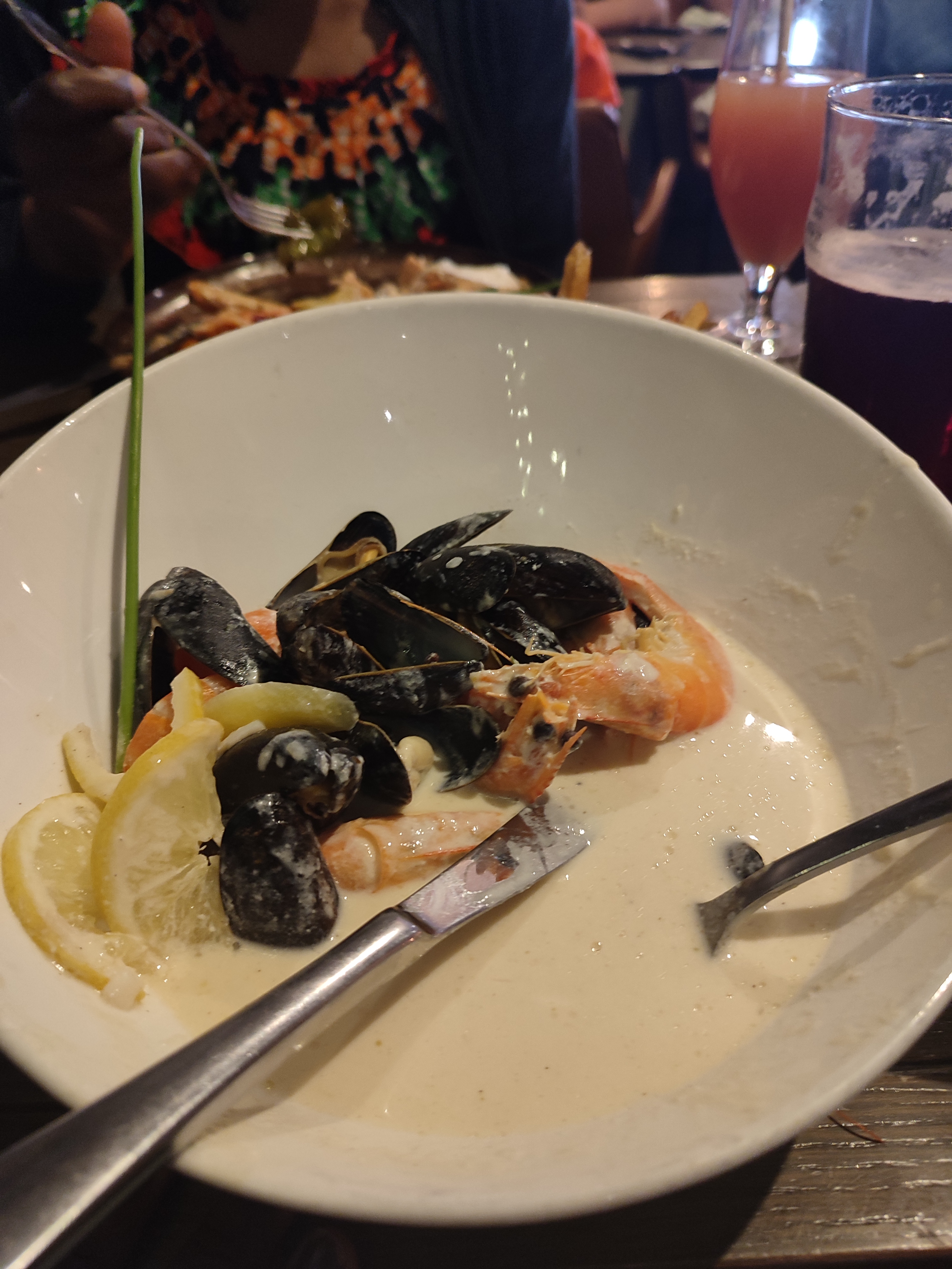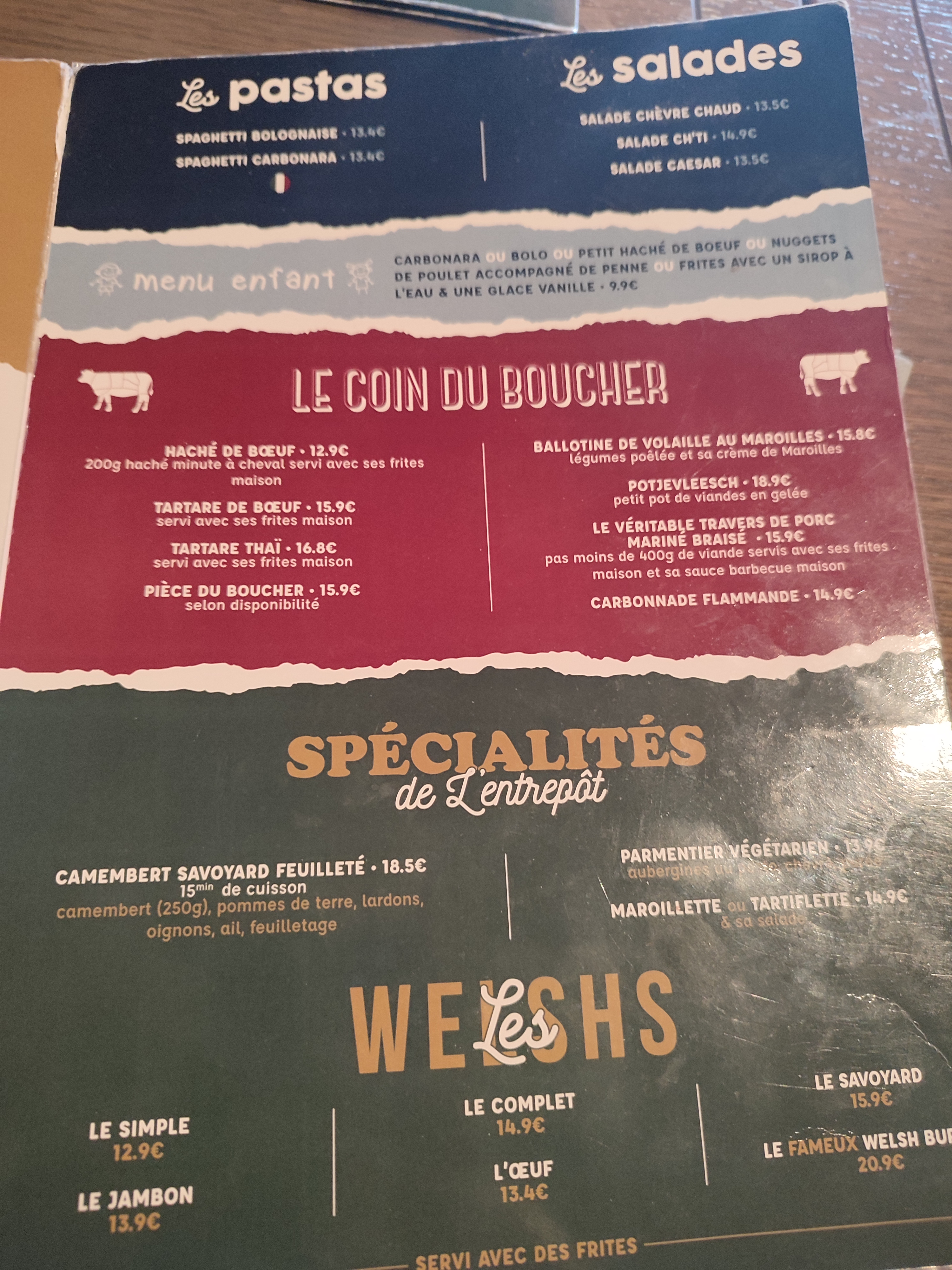 Hésitant entre l'entrepôt et un autre, je me décide à pousser cette porte, accueil très sympathique, service rapide... Une carte simple et efficace Je me laisse tenter par les moules au Maroilles, et la petite déception sur l'intitulé...je sentais plus la crème que ce fromage typique du Nord, venant de Normandie, où nous avons la même recette de moules au camembert où l'on s'en vraiment le goût). Le dessert, le tiramisu praliné... manquant clairement de praliné Ça n'empêche que l'on voit que tt est fait maison et que la qualité y est 🙂