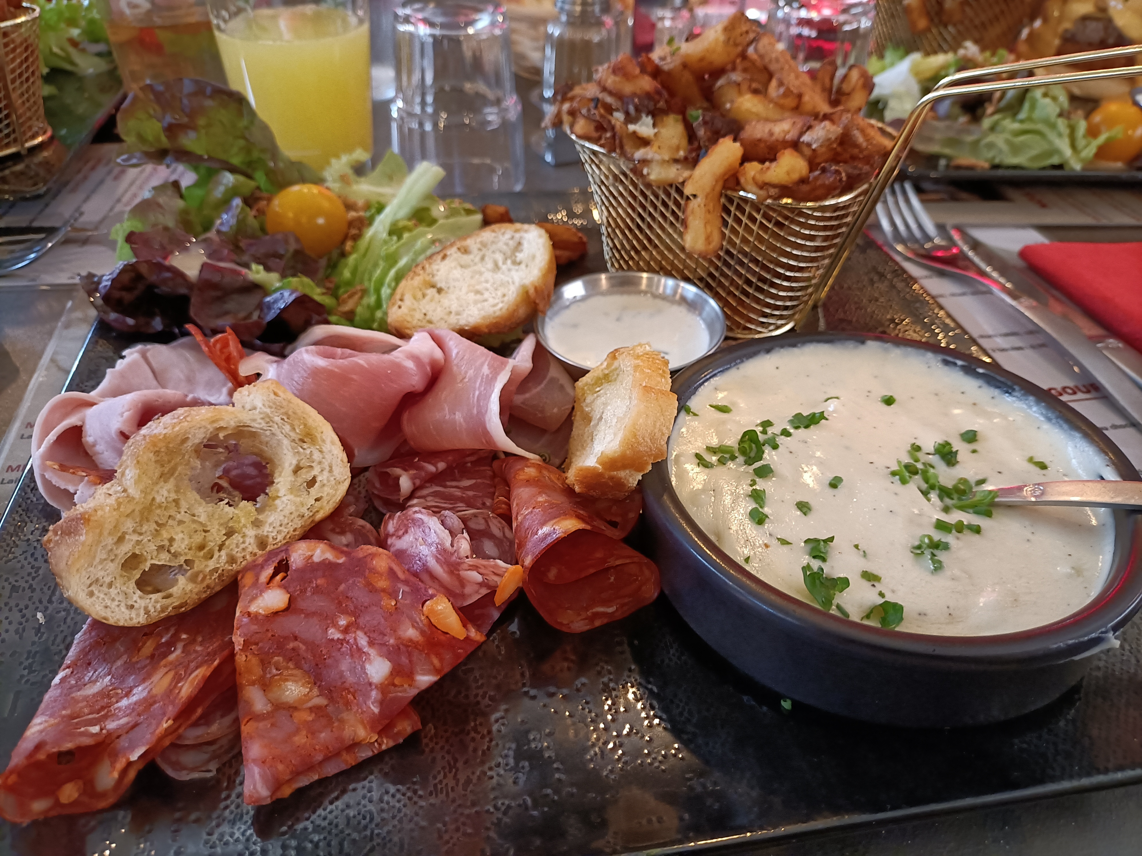 Nous sommes venu manger le 8 mai étant ancien restaurateurs Mon epouse a pris une Fondue au saint nectaire avec charcuterie salade frites maisons vraiment très bonnes La pieces du boucher. Alors la j'ai été agréablement surpris Entre la tendresse et une cuisson demander bleue qui a été parfaitement réalisée Un riz aux curry excellent Notre neveux un big montain qu'il a trouver très bon Les crèmes brûlé était faite maison je peux reconnaître une crème en brique d'une maison Et la je peux le confirmé Une assiette de fromage Avec un saint nectaire chavignol et bleue d'Auvergne accompagné d'une petite salade Excellent