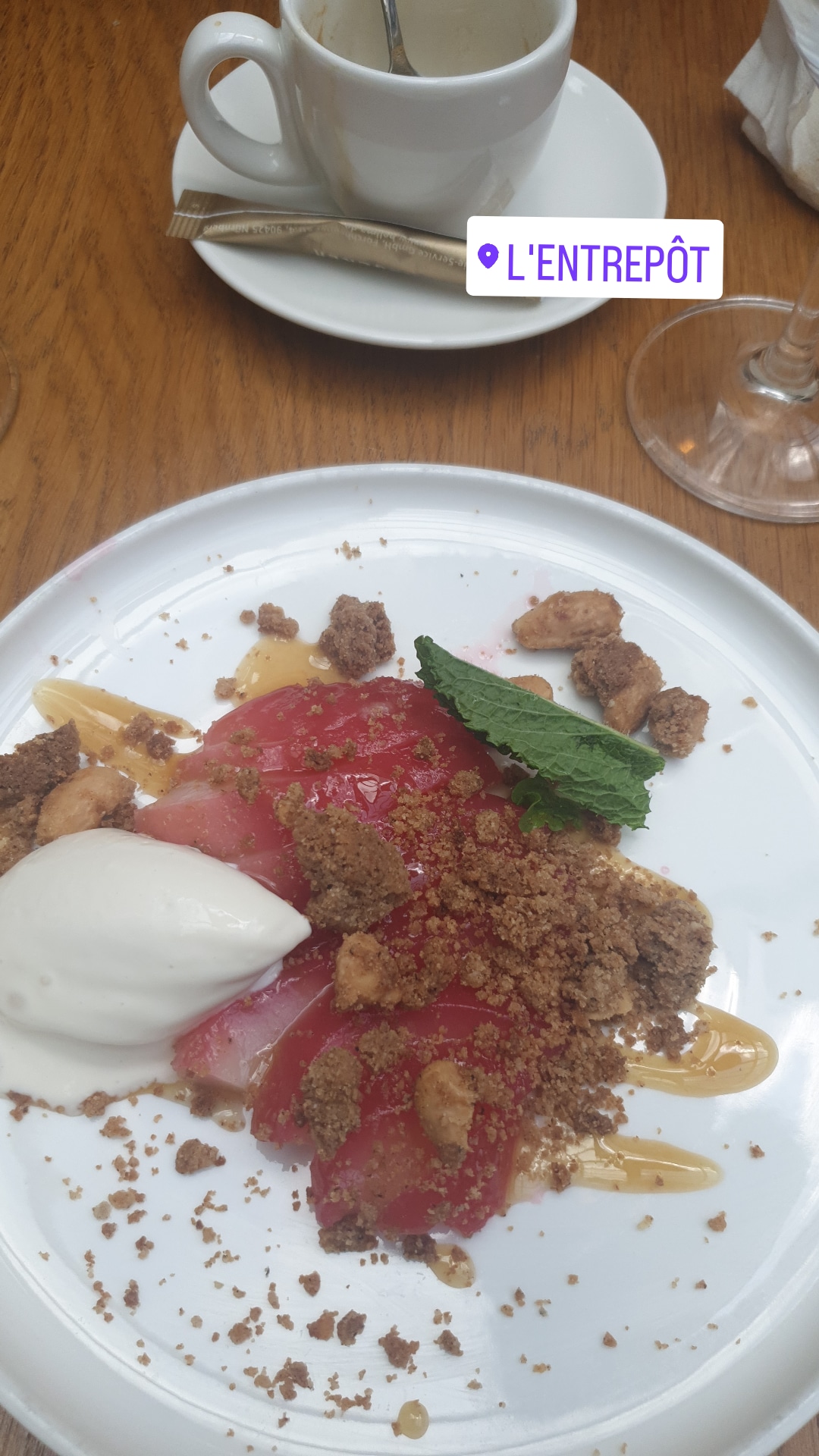 Les entrées ne m’ont pas beaucoup inspiré: tartare de bœuf en entrée, bof ! En revanche, les ris de veau étaient excellents; la purée qui l’accompagnait aussi mais en bien trop petite quantité. Pas fan en revanche de l’association avec la sucrine. Dessert: crumble de prunes excellent