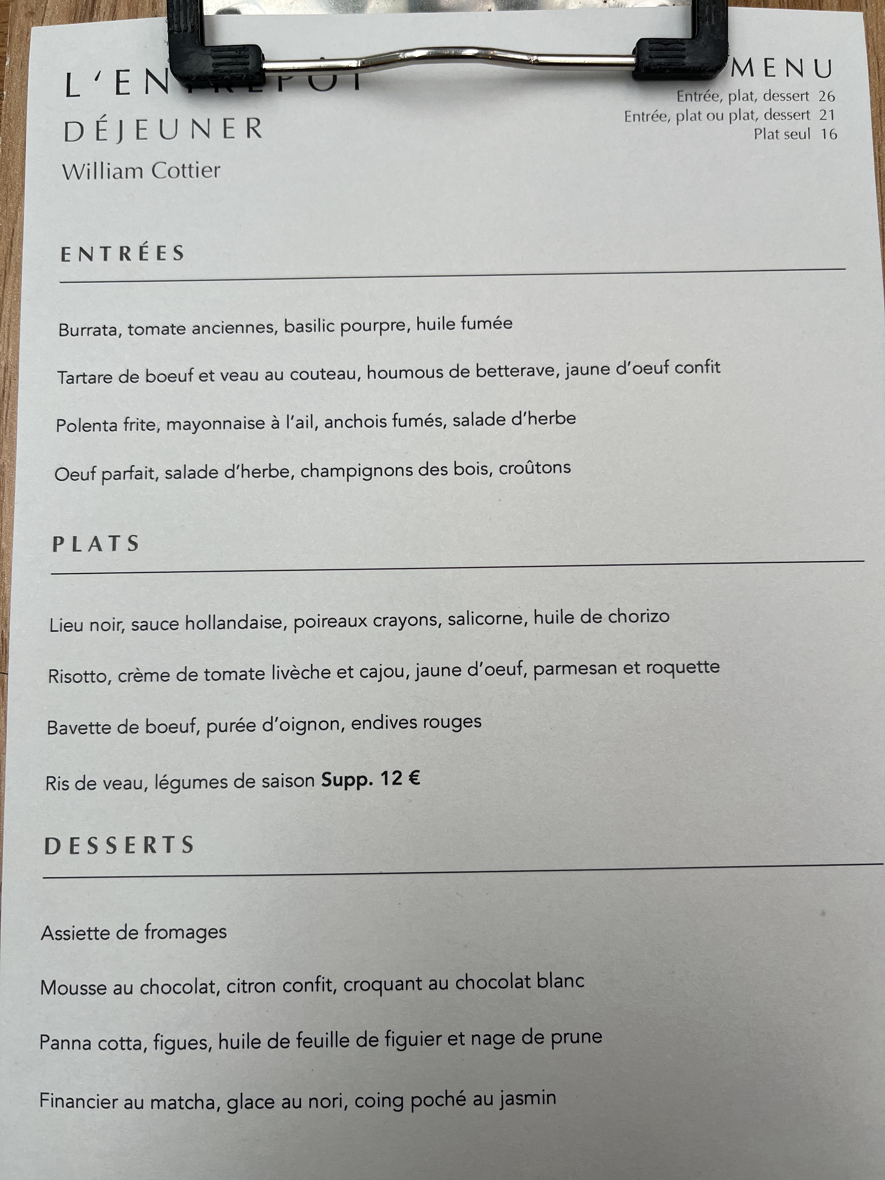 L'Entrepôt propose une carte très attractive et raffinée, et comme toujours, l'expérience est totalement positive. Le sommelier prodigue de très intéressants conseils sans ostentation. Les plats sont délicats, savoureux, à bonne température et bien dressés. Le service est attentionné, efficace et discret. Et le cadre, toujours aussi agréable. LA bonne adresse du quartier Pernety !