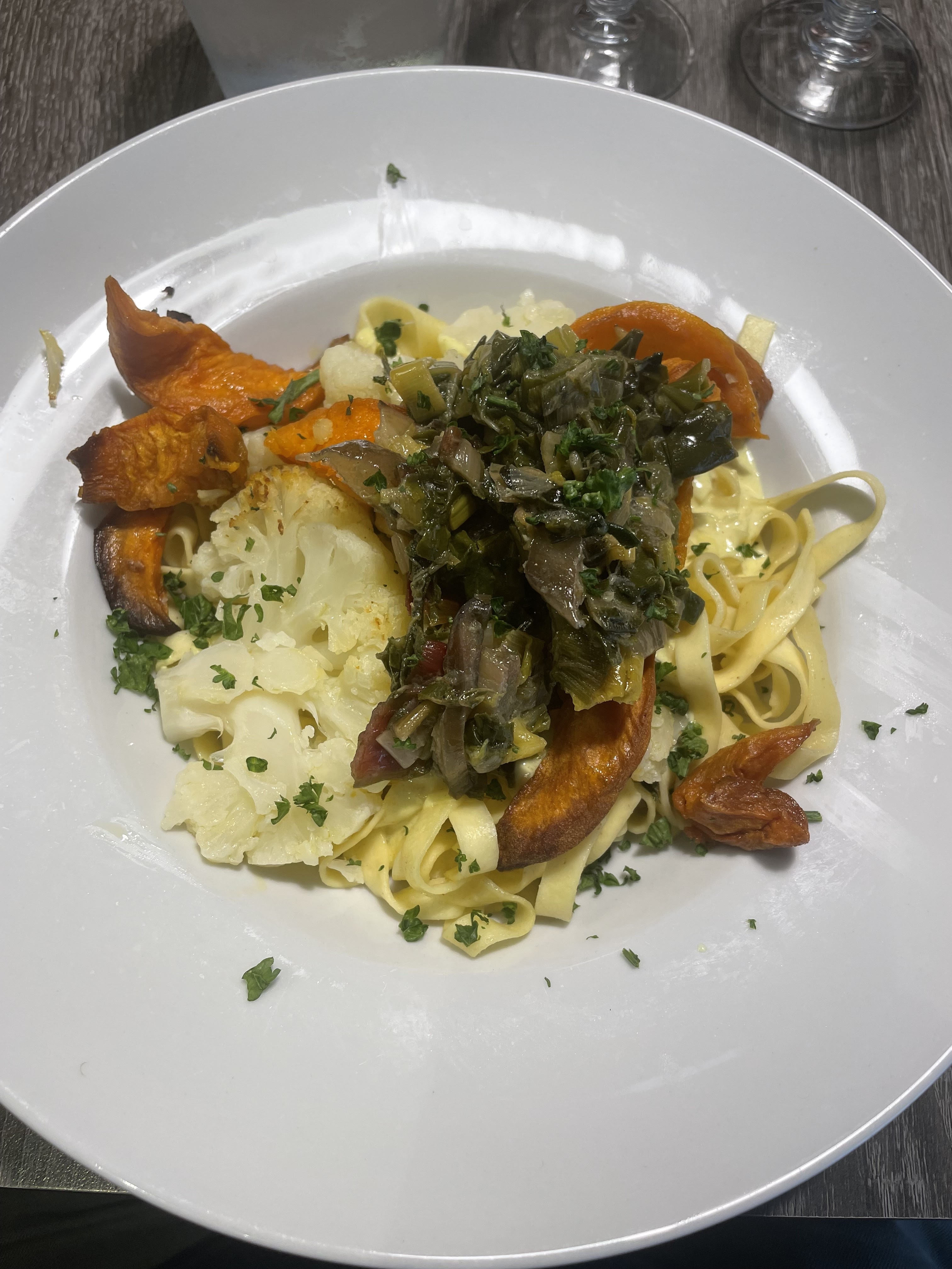 Restaurant étonnant ! De belles présentations, des plats atypiques mais vraiment très bons ! Je me suis régalé d’un entrée-plat-dessert a 18€ ! Velouté de céleri fantastique 👌🏼 Tagliatelle de légumes (fondu de poireaux, chou-fleur, patates douces…) Photos pour illustrer !