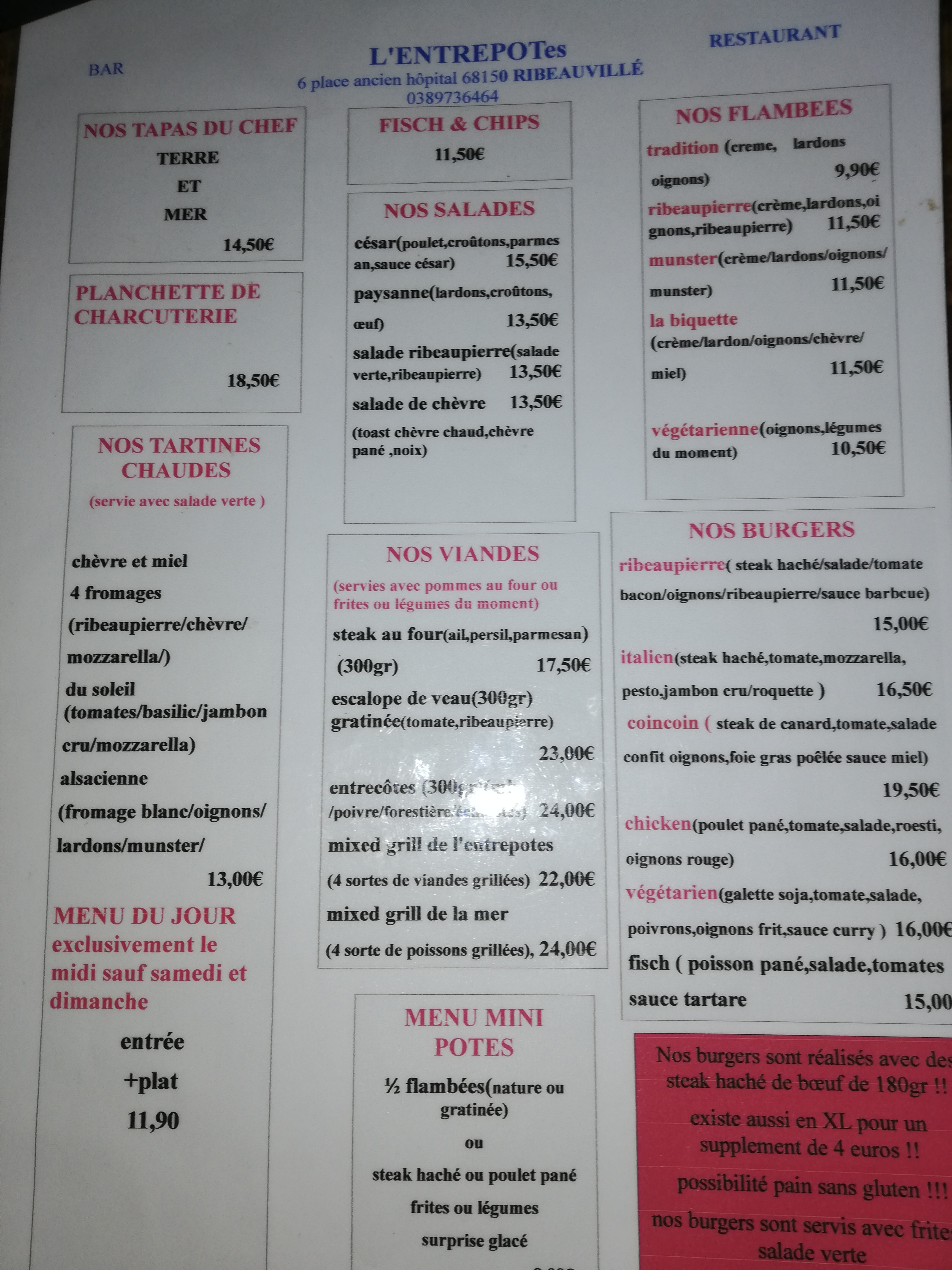 Petit séjour à Ribeauvillé on s'est arrêté à L'entrepotes pour les avis et le nom qui est juste extra , pas déçu de l'ambiance et service impeccable, produit frais et de qualité. Environ 30€ par personne boisson , plat dessert. Je recommande 😊.