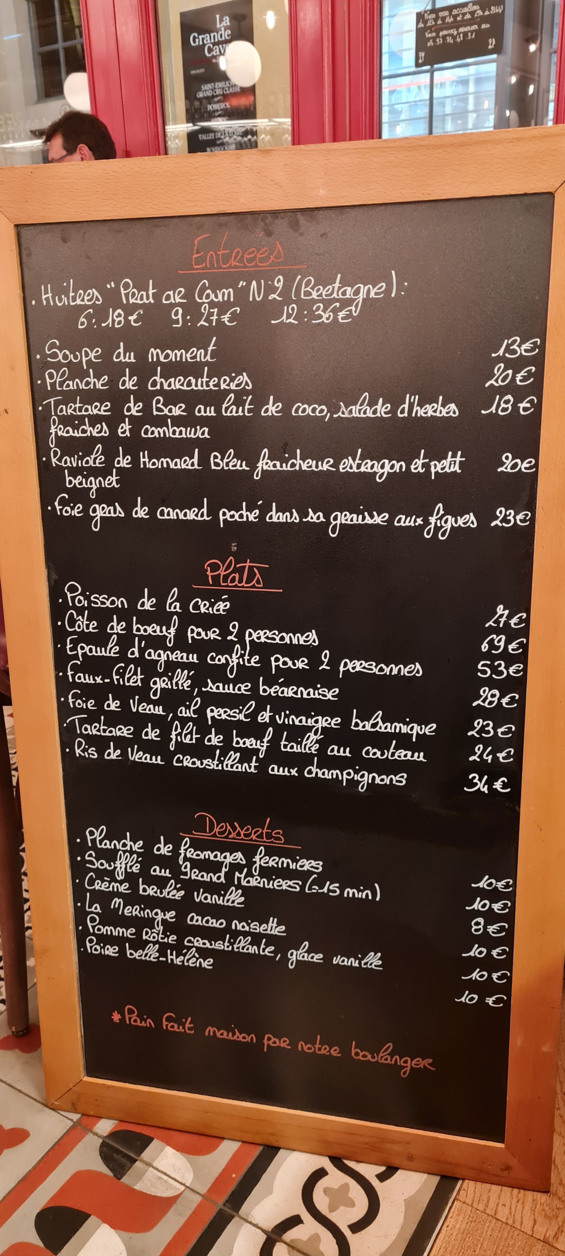Excellent dîner à St Emilion. Nous avons été reçus chaleureusement et étions à l'aise. La serveuse nous a aidé à choisir le vin qu'il nous convenait et l'autre serveur était d'une grande vigilance et de sympathie. La côte de bœuf pour 2 était fondante. La carte de vins est infinie. Je recommande vivement.