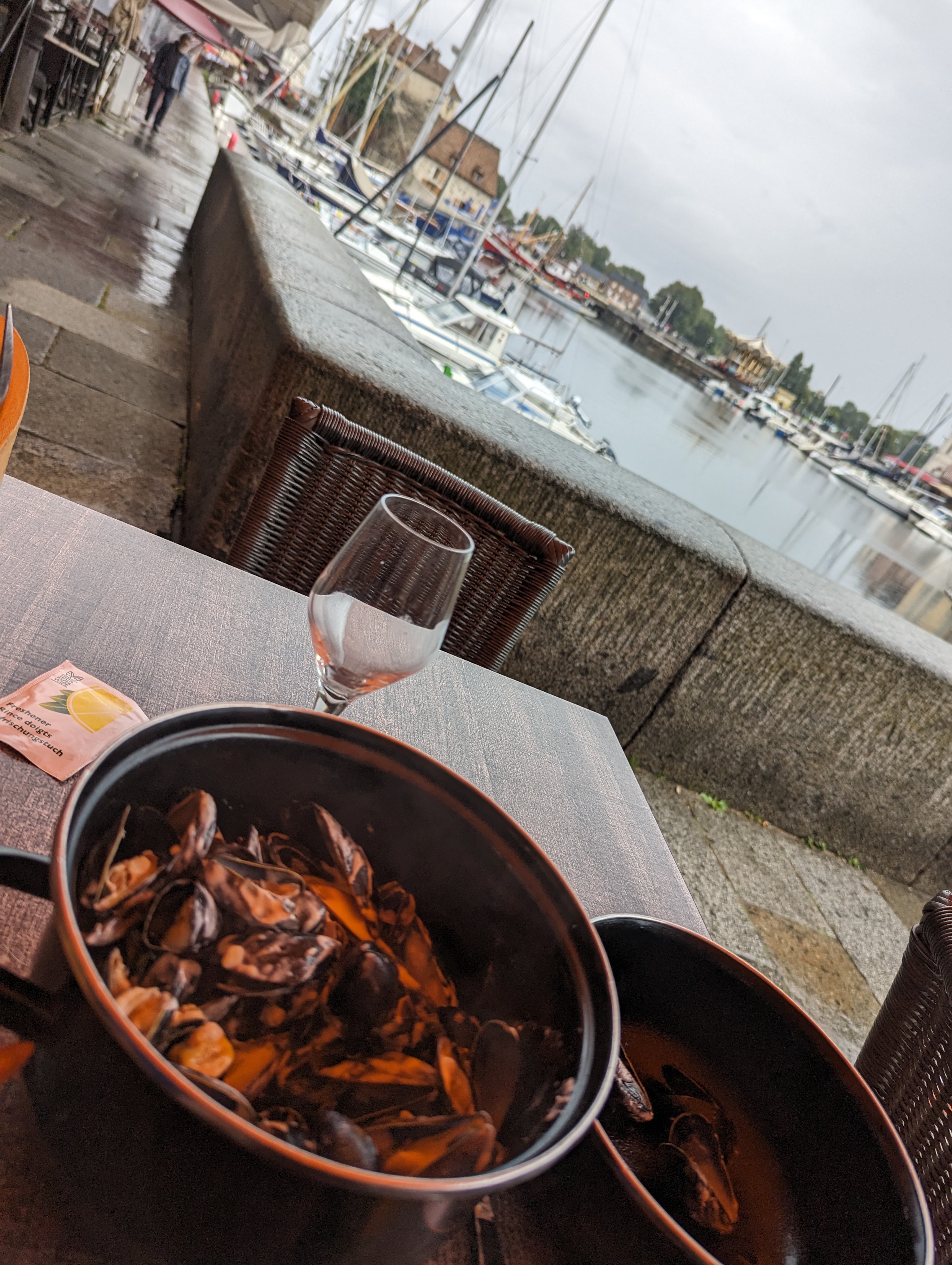 A FUIIIIR !!!!! Restaurant très bien situé MAIS A FUIIIR (même en dernier recours).. Le décor ne fait malheureusement pas tout, ou du moins il participe à réduire les pots cassés.. Personnels très irrespectueux, ne sont pas à l'écoute de leur clientèle, n'apprécient pas les demandes complémentaires au repas (cendrier, couverts propres, serviettes en papier,...). 1h30 d'attente pour être servi : ce temps d'attente a été contesté par le serveur.. heureusement pour nous nos photos ont pu prouver notre bonne foi! Pour combler ce déjeuner au soleil : en plat principal nous avons pris des moules frites afin de savourer les plats de la région.. malheureusement une réelle déception ! Moules TRES sèches sans goût, sans sauce avec des coquilles vides.. Nous reviendrons à Honfleur mais certainement pas chez eux :) A FUIR!! PS : Petit point positif à retenir malgré tout : le coca cola était bon :)