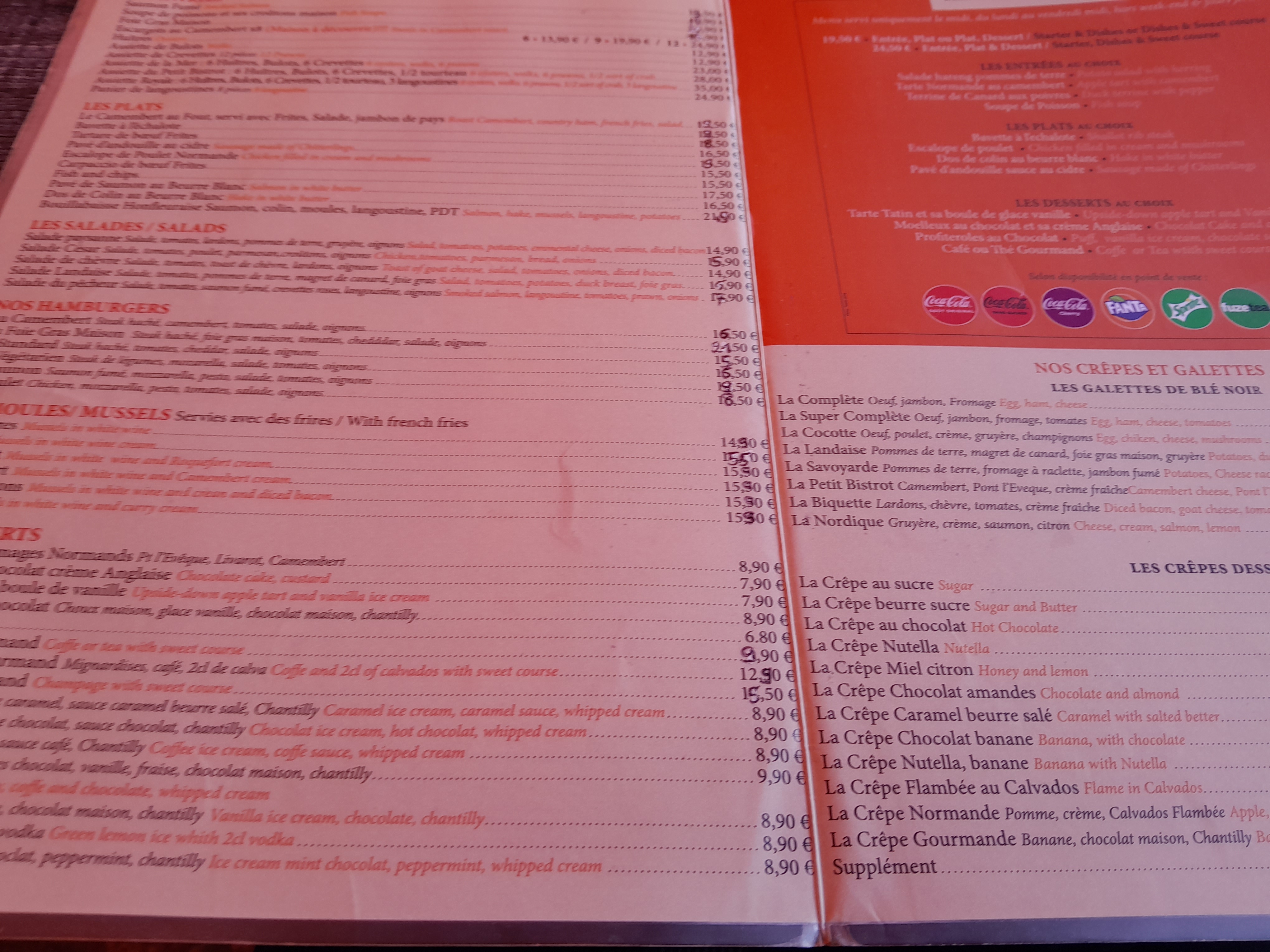 Tres bon acceuil , personnel agreable . Repas bien passer personnelleent j’ai pris des moules marinieres bonnes , mon mari a pris une salade du pecheur tres content de sa salade . En revanche en dessert pris une crepe nutella et la grosse deception pas de gout et presentation vraiment pas top je ne trouve pas ca pro .