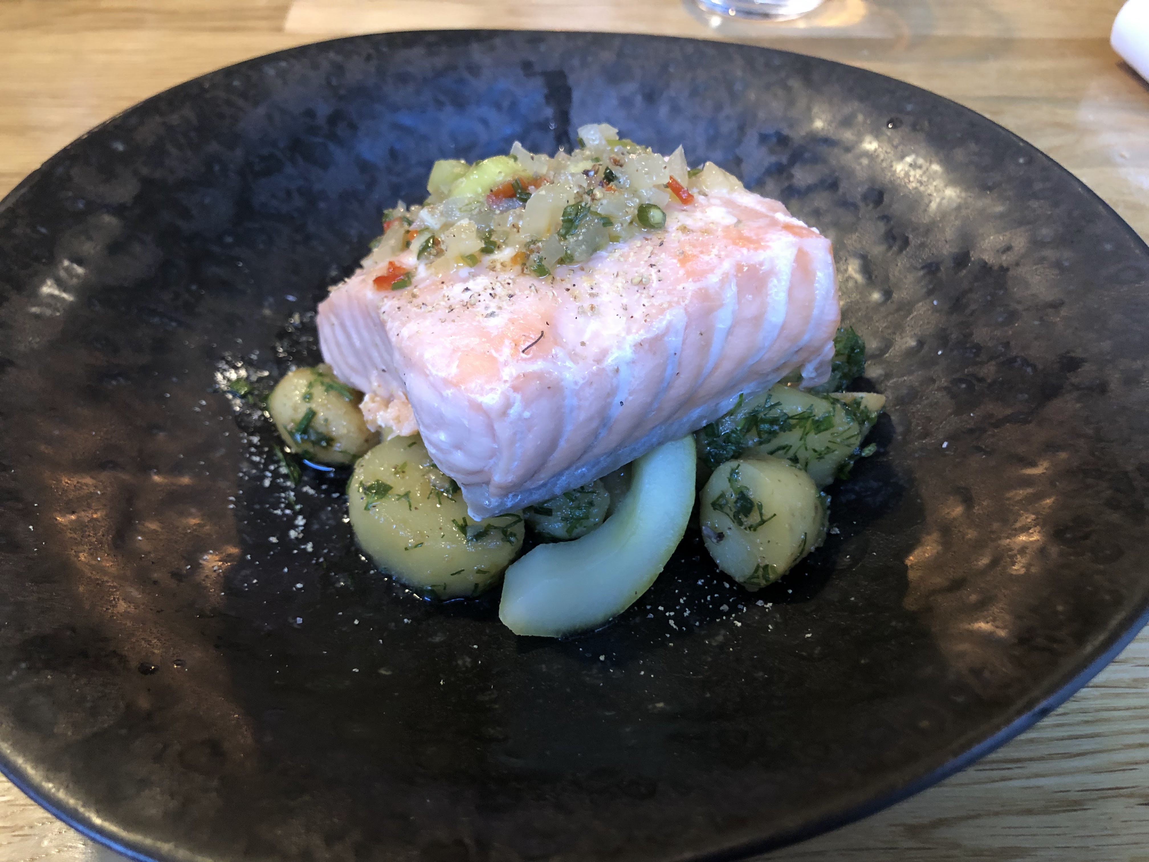 Une très belle carte qui change régulièrement au bon rapport qualité/prix avec ici l’aubergine/ricotta, le saumon/pommes de terres/piment vierge et le sable pêche de vigne. Le service est excellent et le conseil œnologique expert.