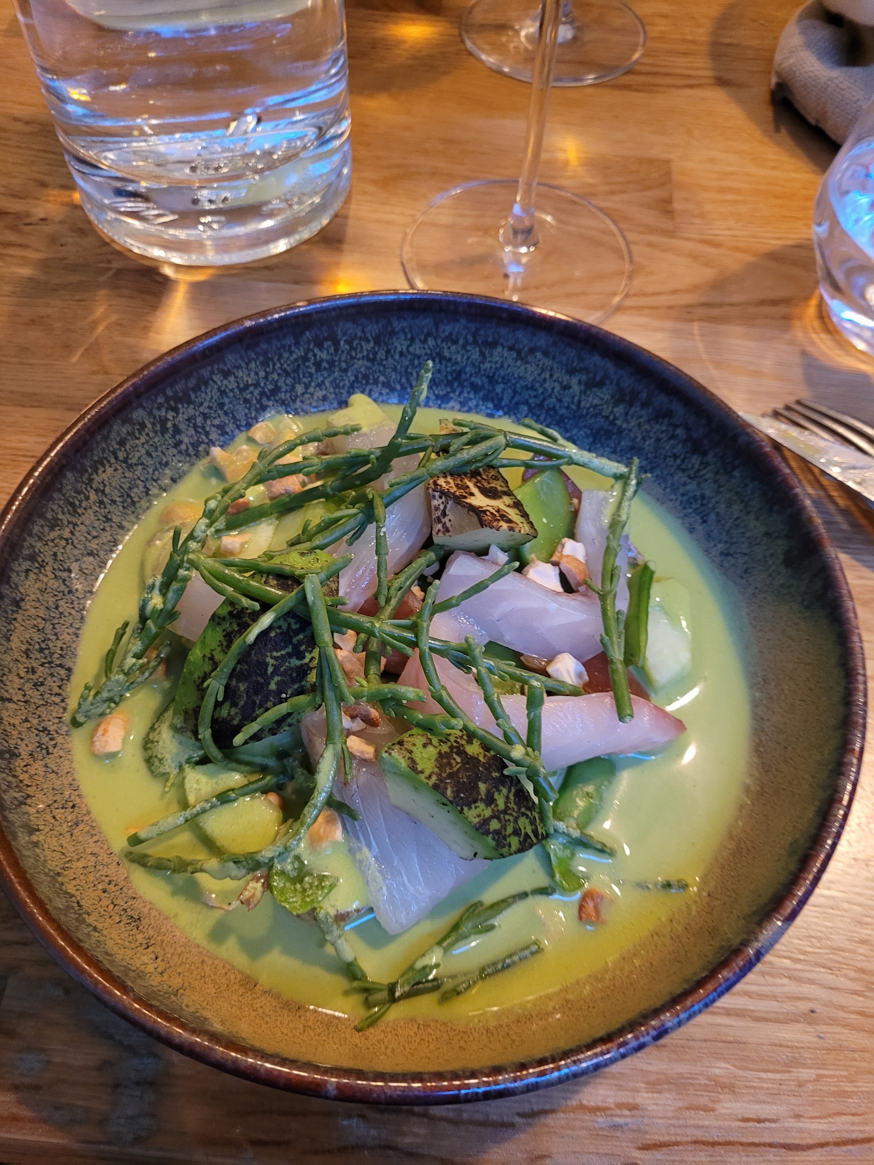 L'accueil et le service étaient incroyablement sympathiques, tant de la part de la réception que des chefs - qui cuisinent directement au bar et font un très bon travail étant donné qu'ils ne sont que deux. J'ai pris le menu dégustation de 6 plats et j'ai été très satisfait de tous les plats et époustouflé par un couple. Dans l’ensemble, la cuisine était fantastique, avec une combinaison intéressante de saveurs et une construction réfléchie des plats. Certains plats comportaient quelques éléments légèrement décevants, mais il fallait s'y attendre de la part d'un restaurant qui n'a été repris que récemment par son nouveau chef cuisinier - à la fin de l'année dernière. En résumé, pour la taille du restaurant et le prix, ce fut un excellent repas et une expérience fantastique. Dégustation 6 plats et 2 verres de vin - 58 € plus service