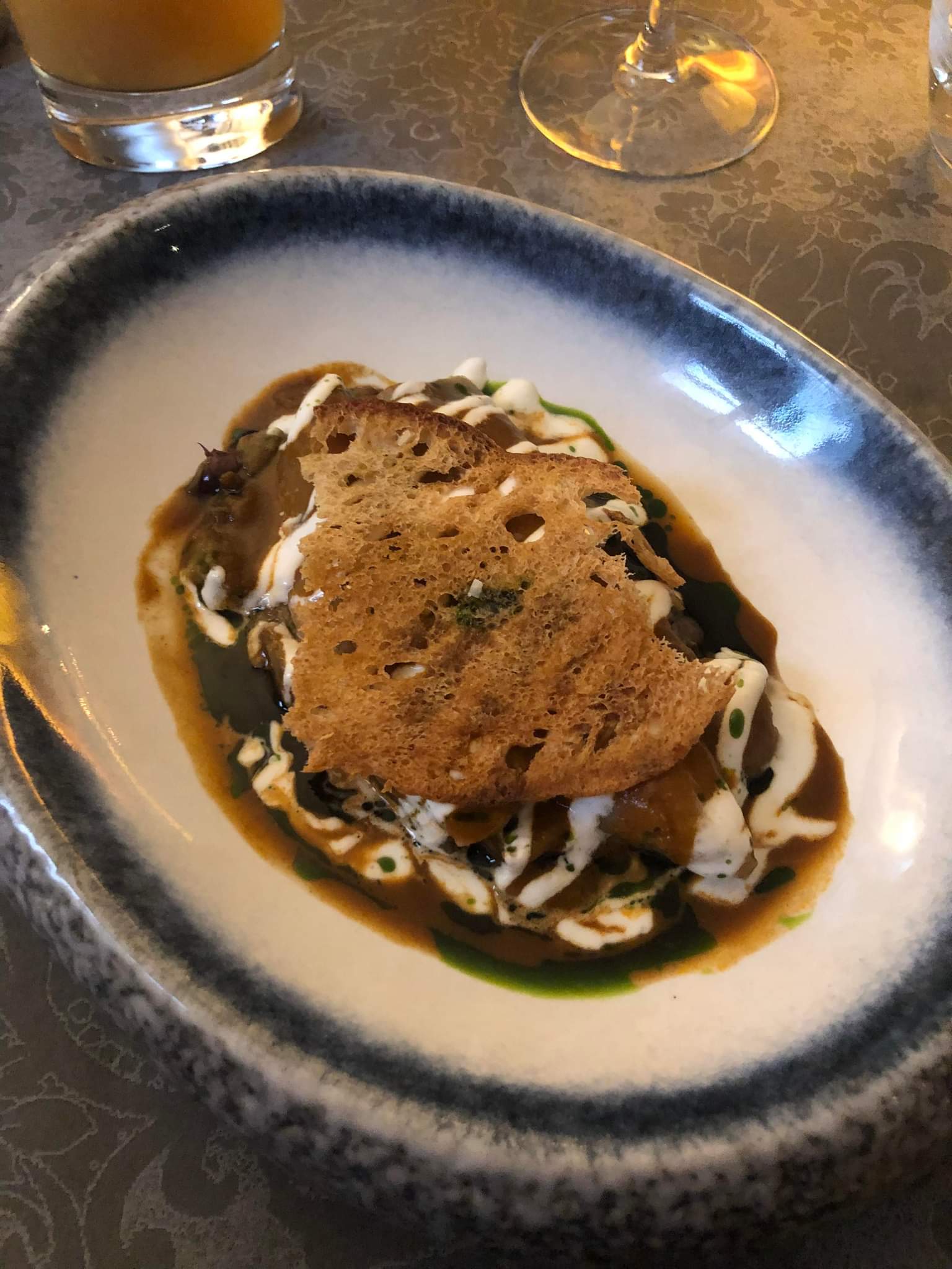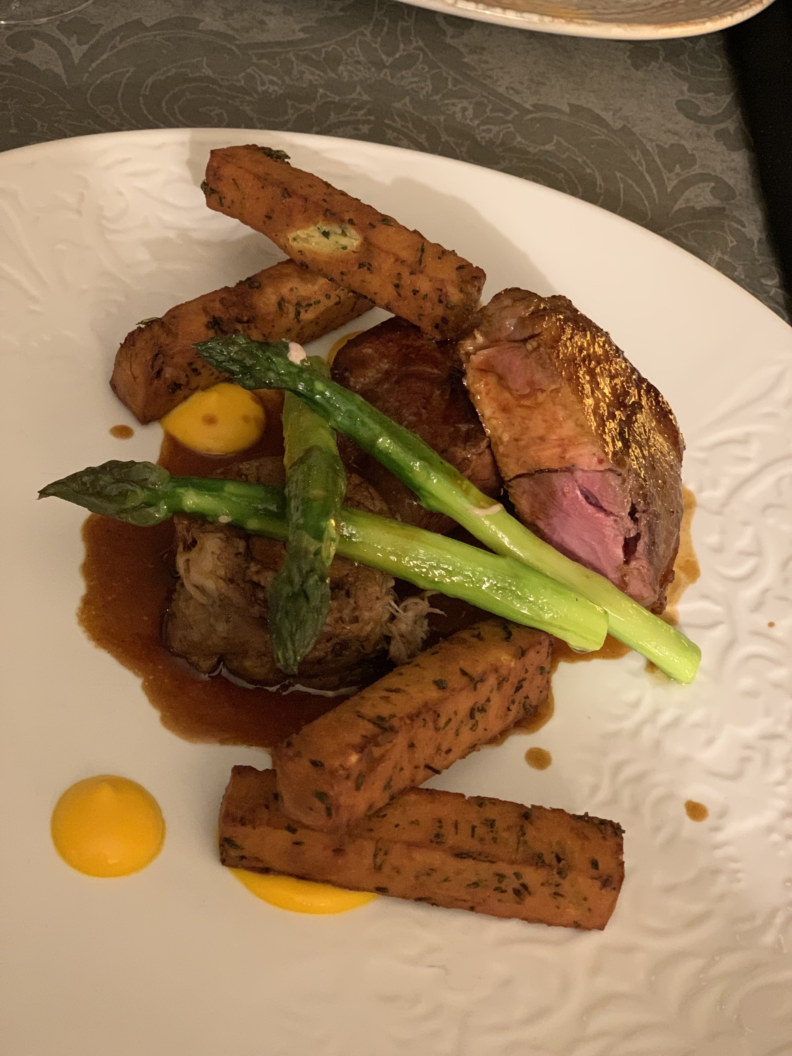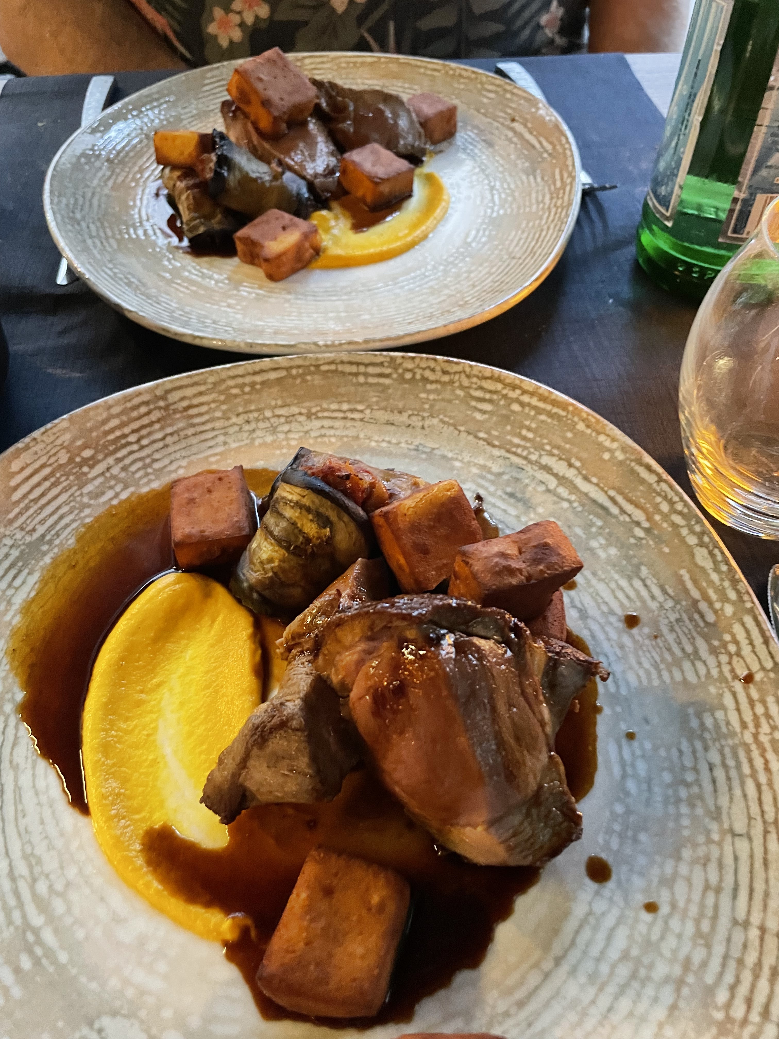 Excellente entrée d'aubergine/burrata, avec l'aubergine succulente, délicate à la manière d'un poisson luxueusement poché. Accompagné d'un excellent rosé du Lubéron. Suivi d'un fantastique morceau d'Angus, cuit à la perfection et accompagné d'une somptueuse sauce aux pruneaux caramélisés, d'une purée de courgettes et d'une tapenade d'olives noires de Nyons. Ça vaut le détour.