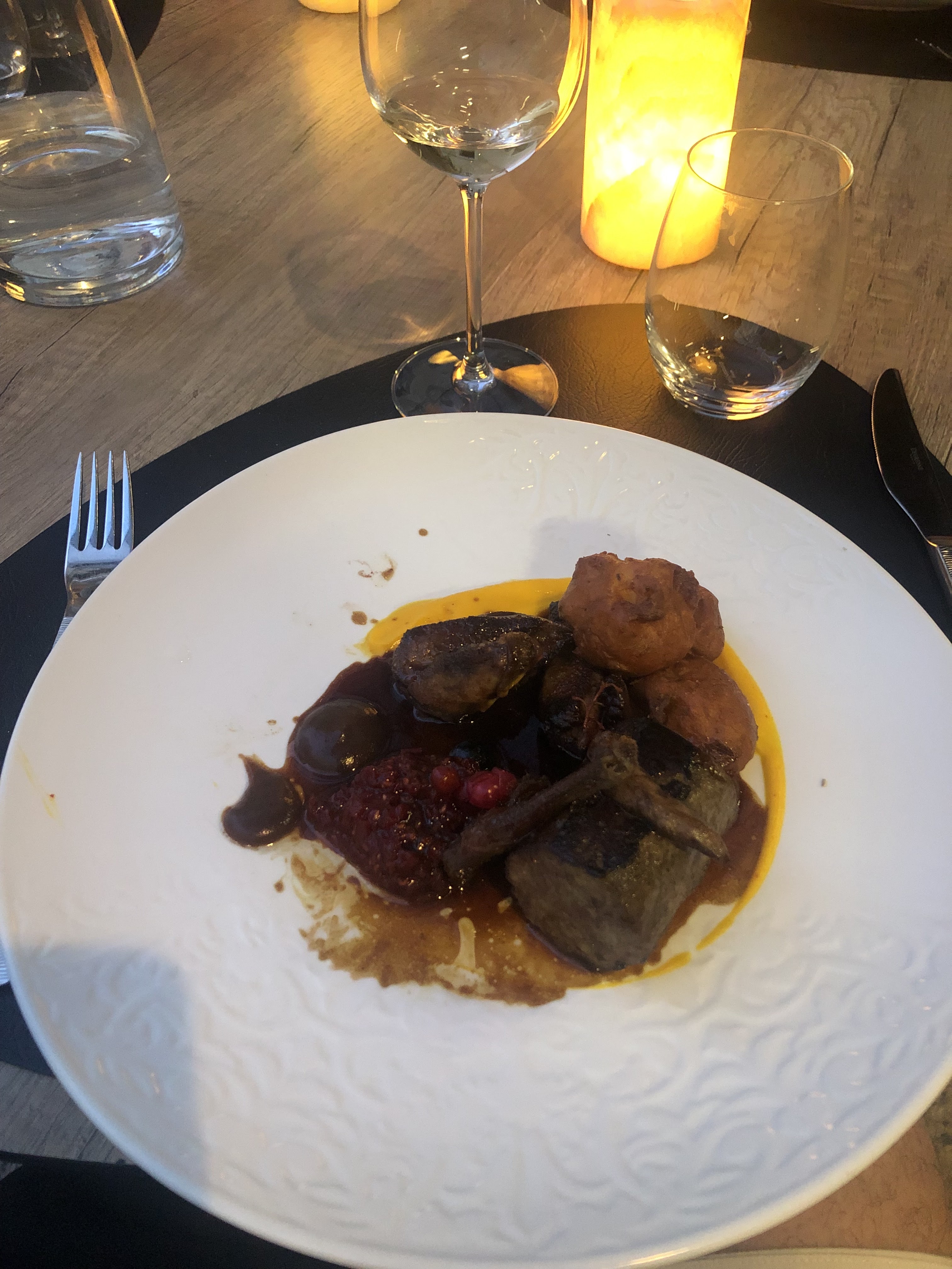 Très bel endroit, petit mais calme et cosy. Les repas sont très bons, l'entrée, le plat et le dessert sont délicieux. Poulet, foie gras Poisson avec une succulente sauce Entremets au chocolat Vous ne serez pas déçu