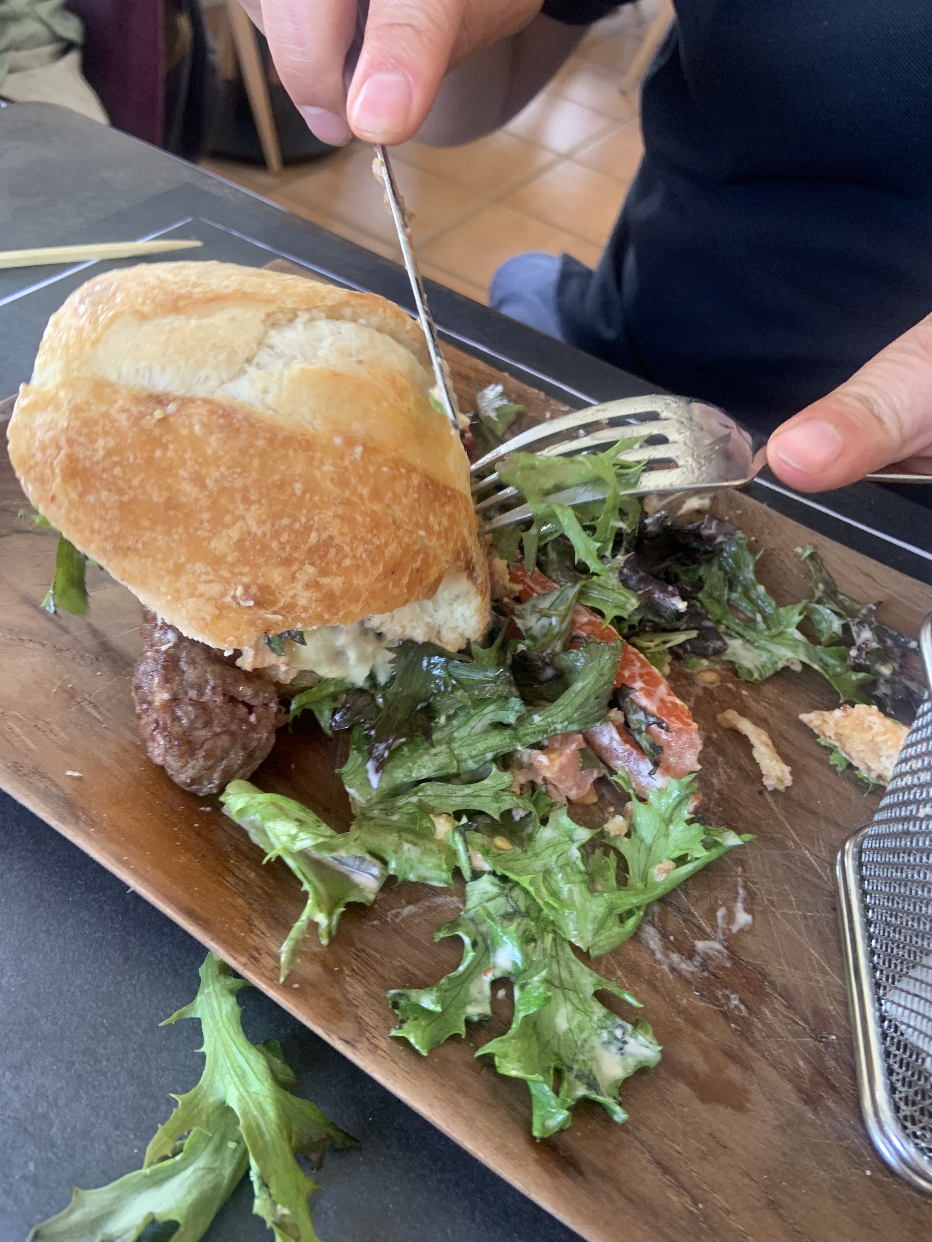Nous avons pris un burger et une salade de truite. Tout était bon et copieux. Les prix des boissons sont un peu haut. Service par le jeune homme très bien.