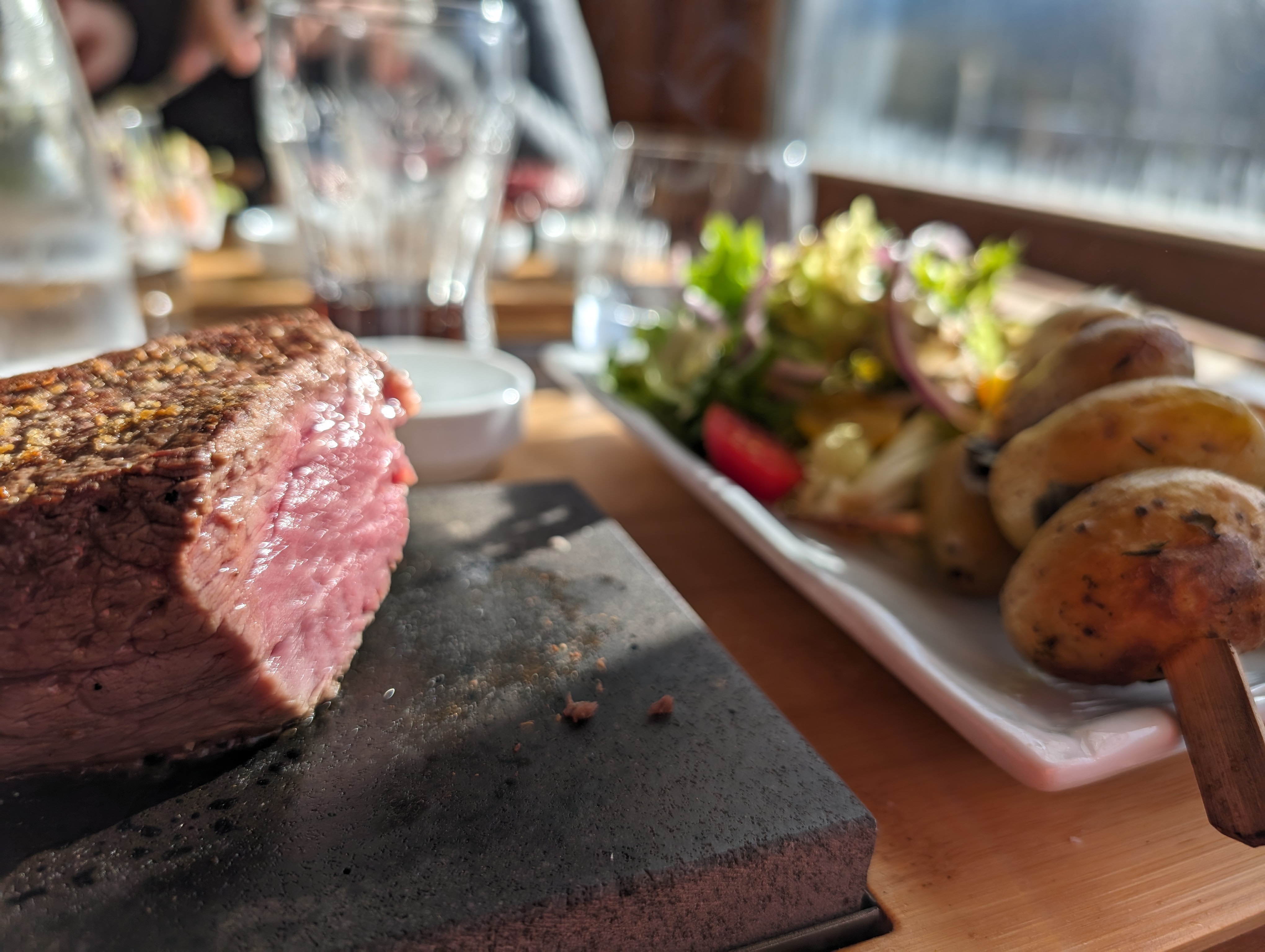 Un service, sympathique et à l'écoute. Le bœuf service sur pierre chaude et excellemment tendre, un repas copieux avec des produits régionaux au top. Je conseil vivement
