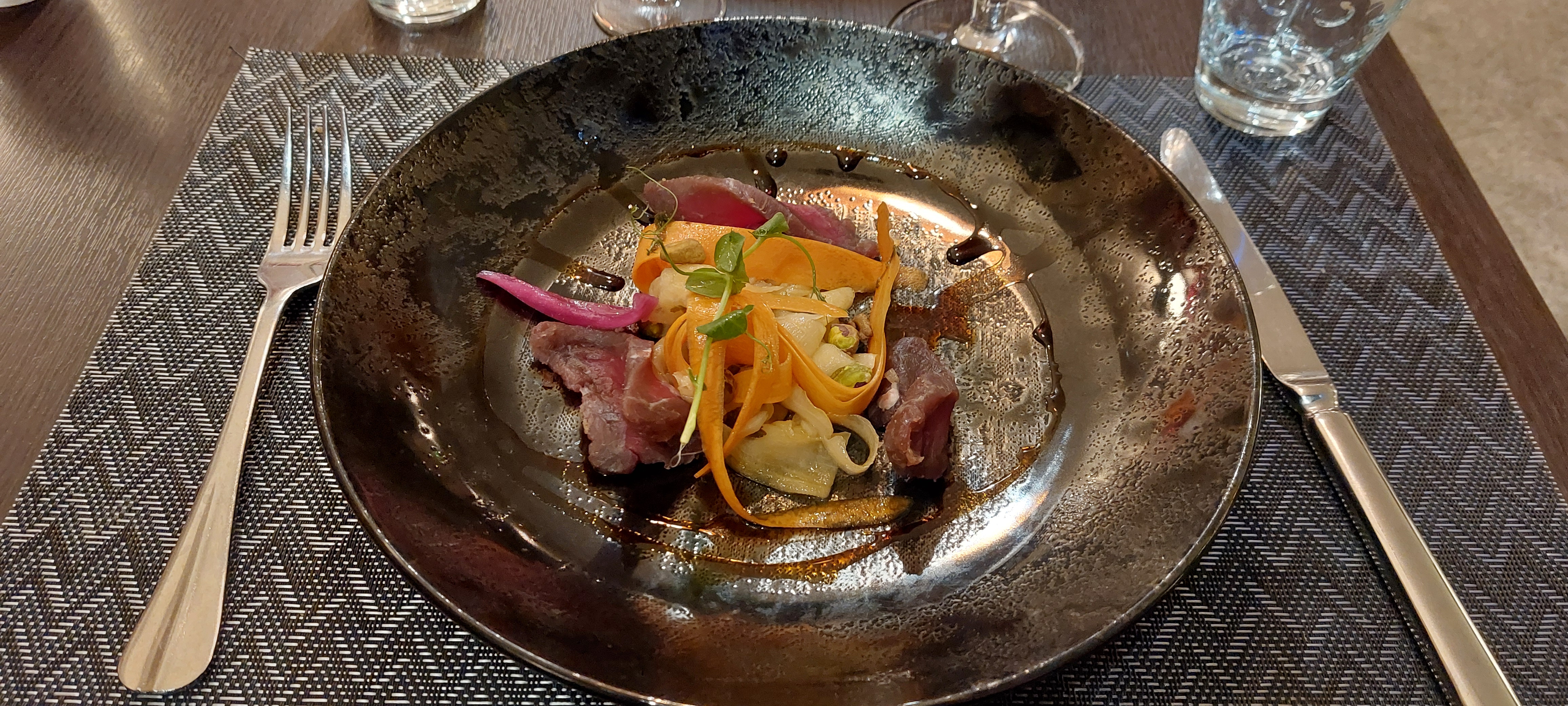 Nous sommes allés dans ce restaurant suite aux conseil de notre hôtel. Un peu déçu que le service soit très très rapide car nous aurions aimé avoir le temps de prendre tranquillement notre apéritif au lieu qu'on nous amène les plats juste 5 minutes après avoir eu les boissons. De plus mon verre de vin blanc demandé pour accompagner le plat, a été apporté en même temps que l'apéritif. Je trouve cela un peu dommage. En revanche en ce qui concerne les plats je recommande à 100% ! Plats gastronomique très très bons, ainsi que pour les desserts !