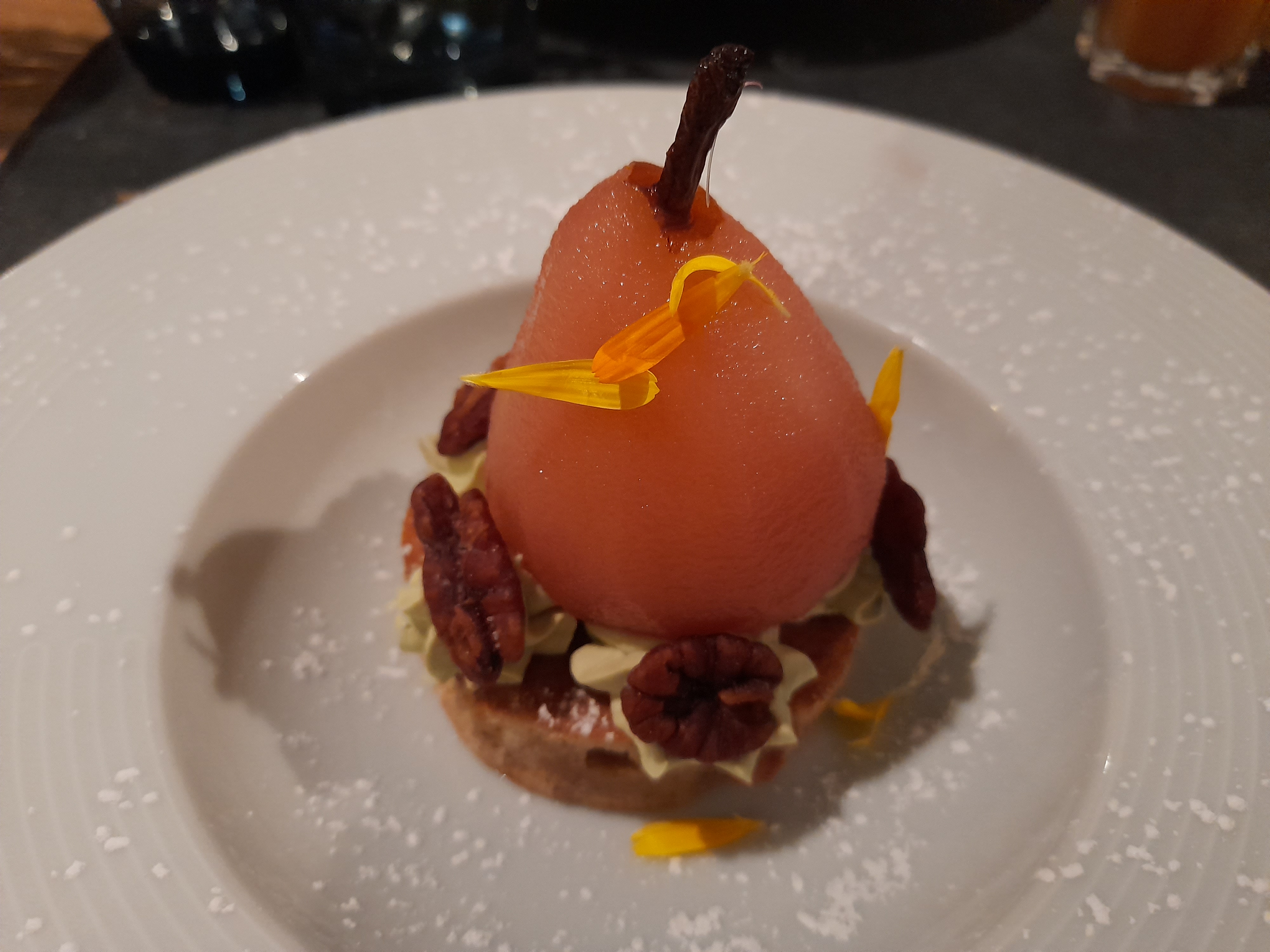 Nous avons fait confiance au chef et à son inspiration pour nous concocter un menu carte blanche en 5 plats et ça commence très bien par 2 entrées réussies avec notamment une association miettes de crabe céleri appréciée puis un dos de merlu à la juste cuisson suivi d un paleron de veau tout à fait fondant et puis …. Dessert : Patatras la poire pochée dure comme la pierre. Aucun de nous 4 n a pu la manger et le gâteau qui l accompagnait guère fameux. Pas de réaction de la serveuse à qui je fais part du manque d inspiration du chef sur ce coup. Dommage de finir sur cette impression! Tout avait pourtant bien commencé… à noter un service aussi un service sympathique et efficace. On aurait aimé un petit mea culpa . Ça peut arriver à tout le monde de se louper.