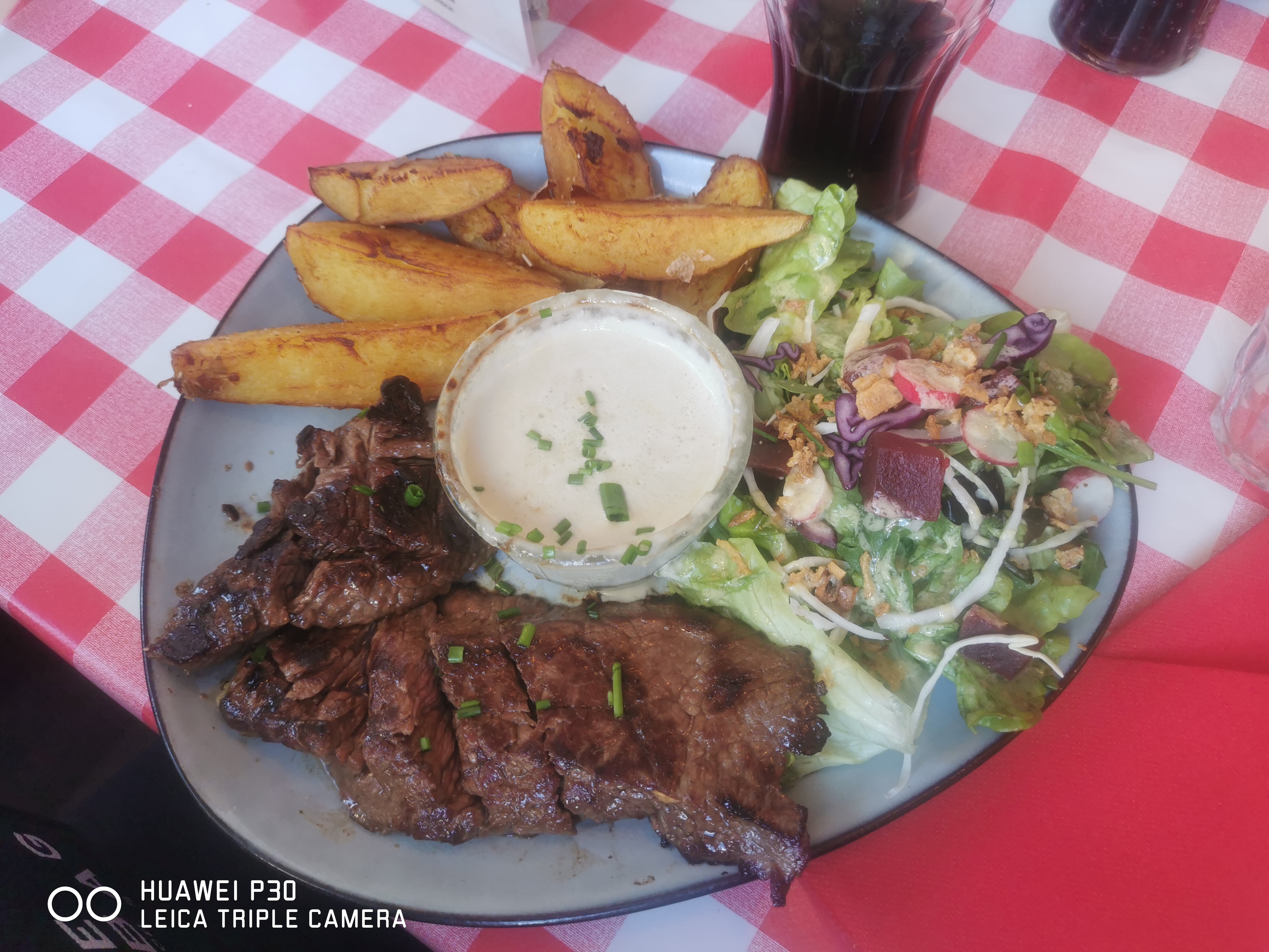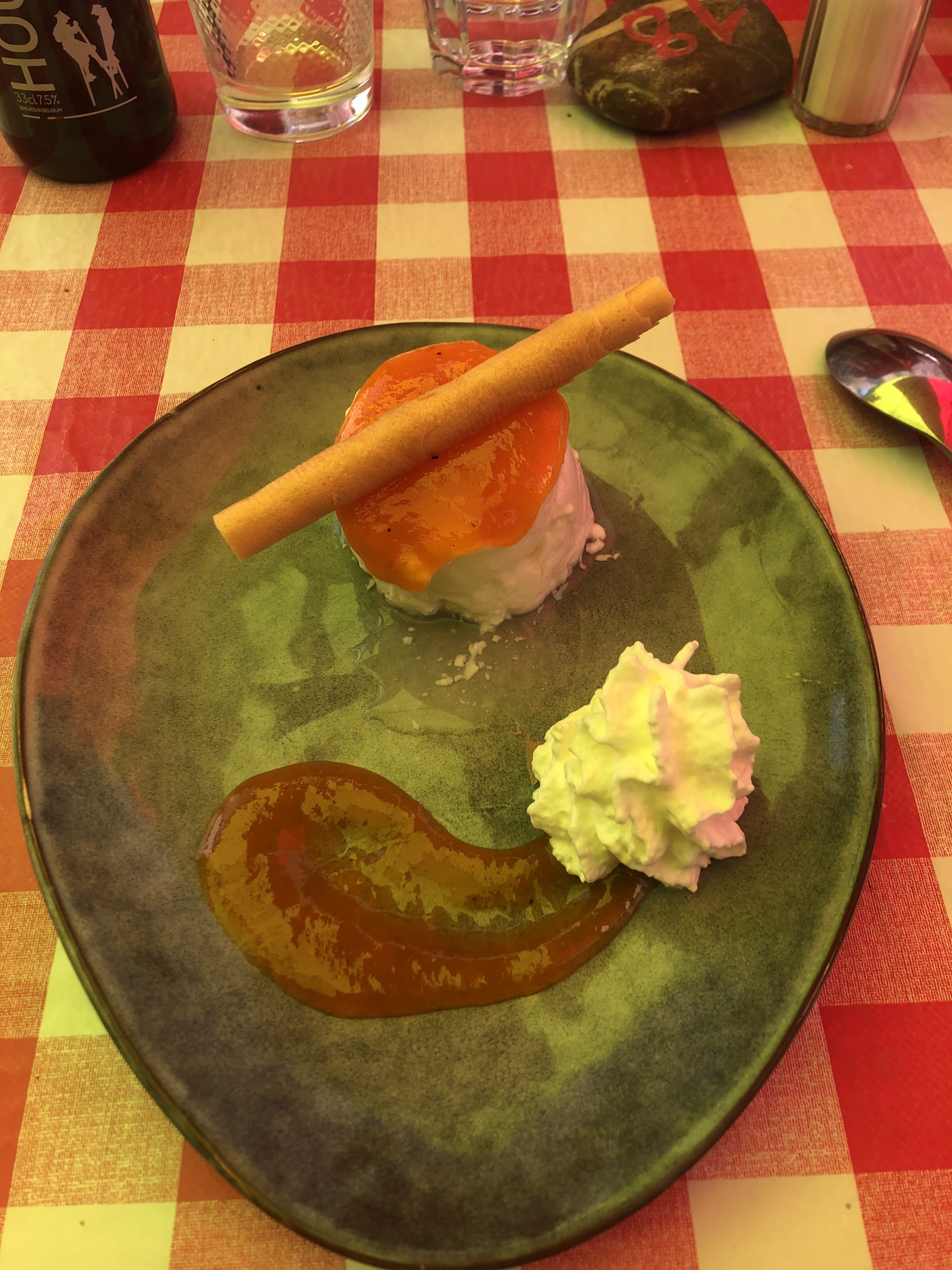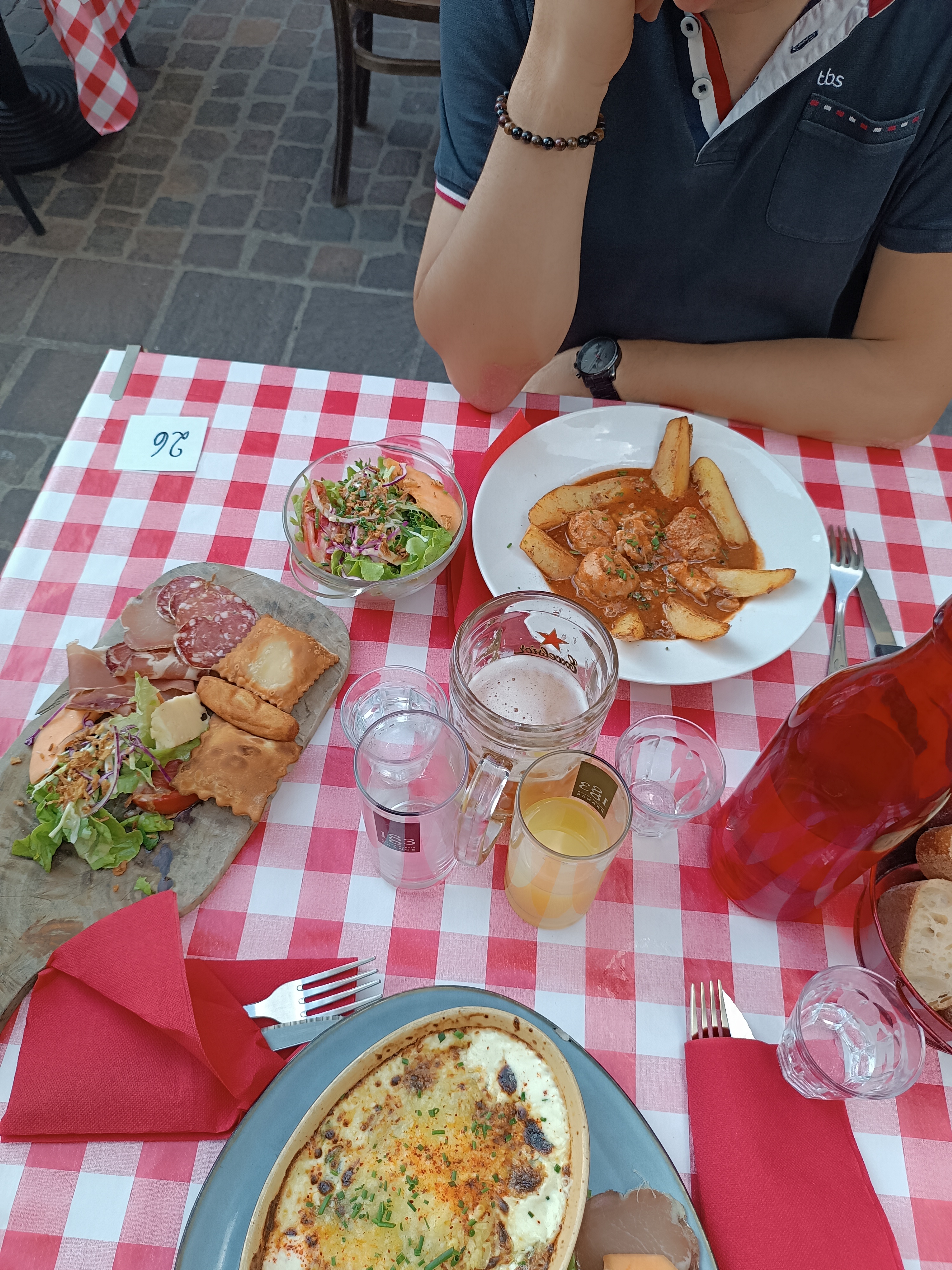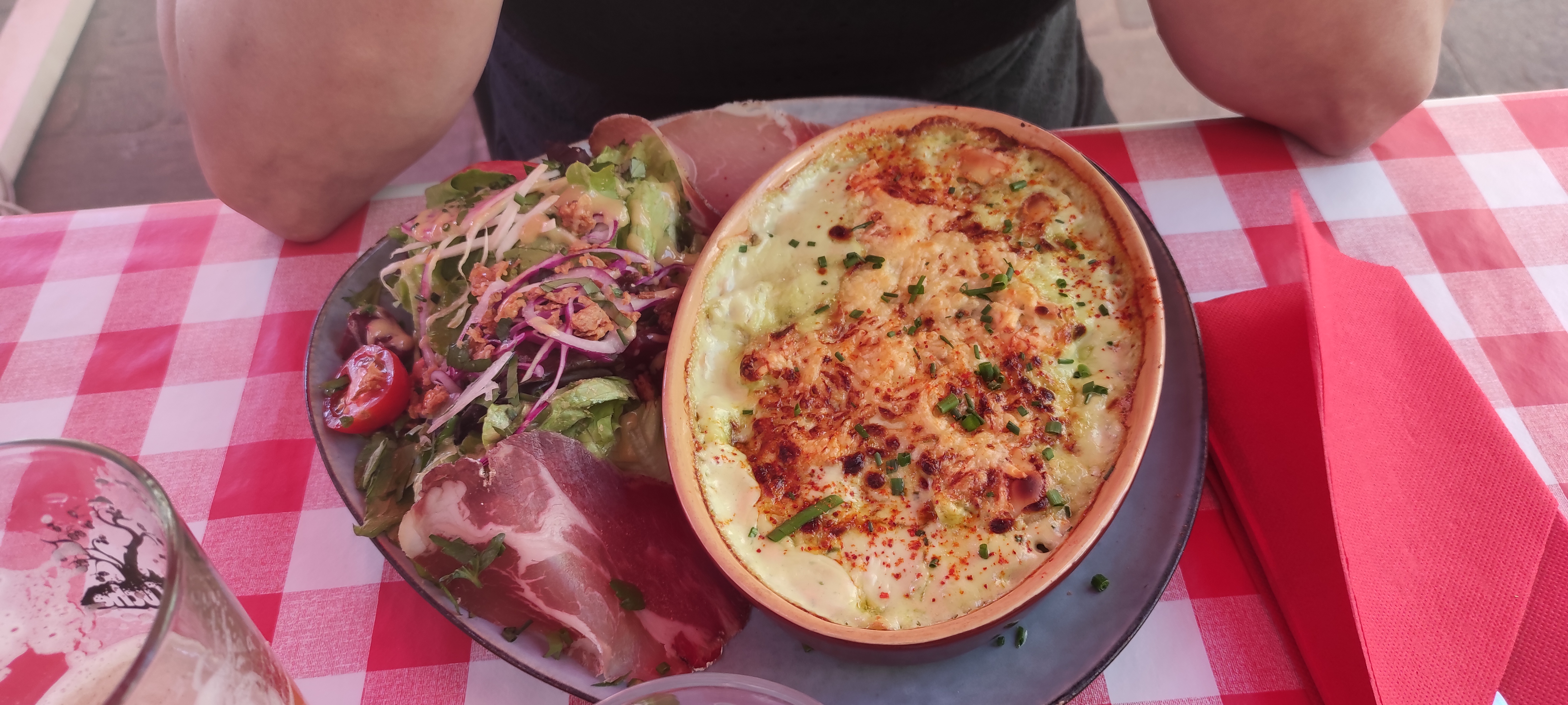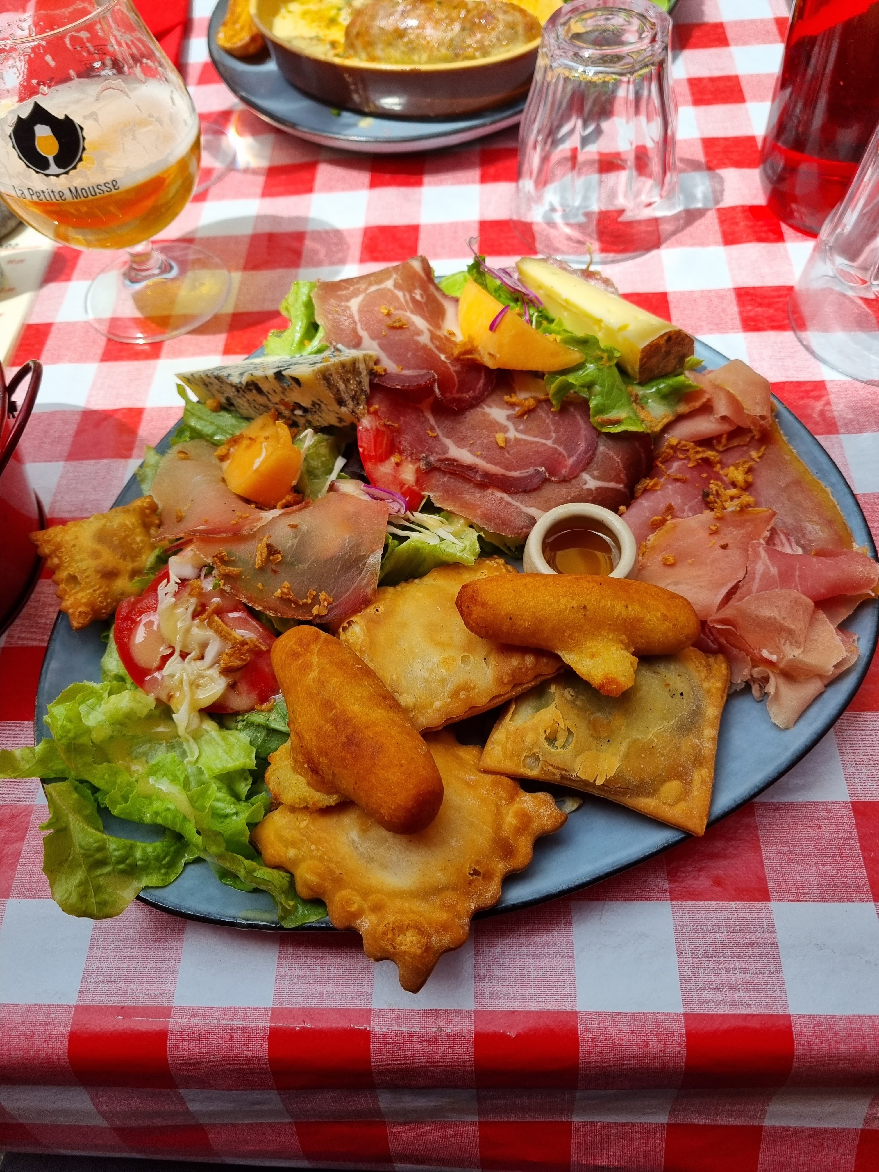 La terrasse avec ses nappes vichy façon bistrot attire mon œil. Une dizaine de plats régionaux à la carte du jour. Excellente sélection de bières. Arrivés à 5 nous sommes rapidement attablés et l’apéro est commandé malgré le monde (jour du marché local). 5 plats différents et chacun est satisfait.