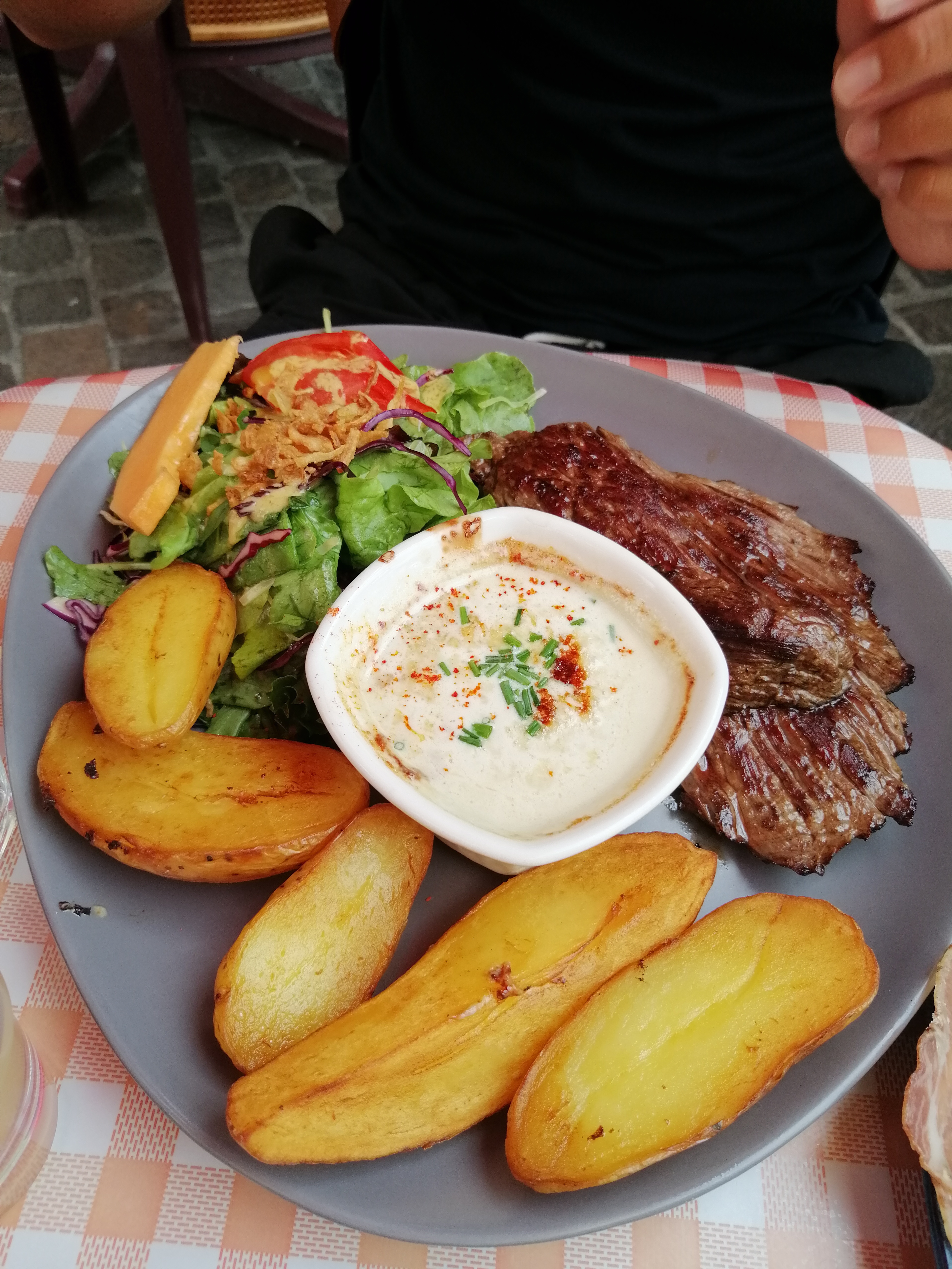 Très bon, très bien! La terrasse étant pleine nous avons pu manger à l'intérieur (avec la clim pour notre grand bonheur). Le personnel est très agréable, le service est très bien on ne se sent pas pressé. Il y a du choix au menu et les assiettes sont copieuse. Nous nous sommes régalés.