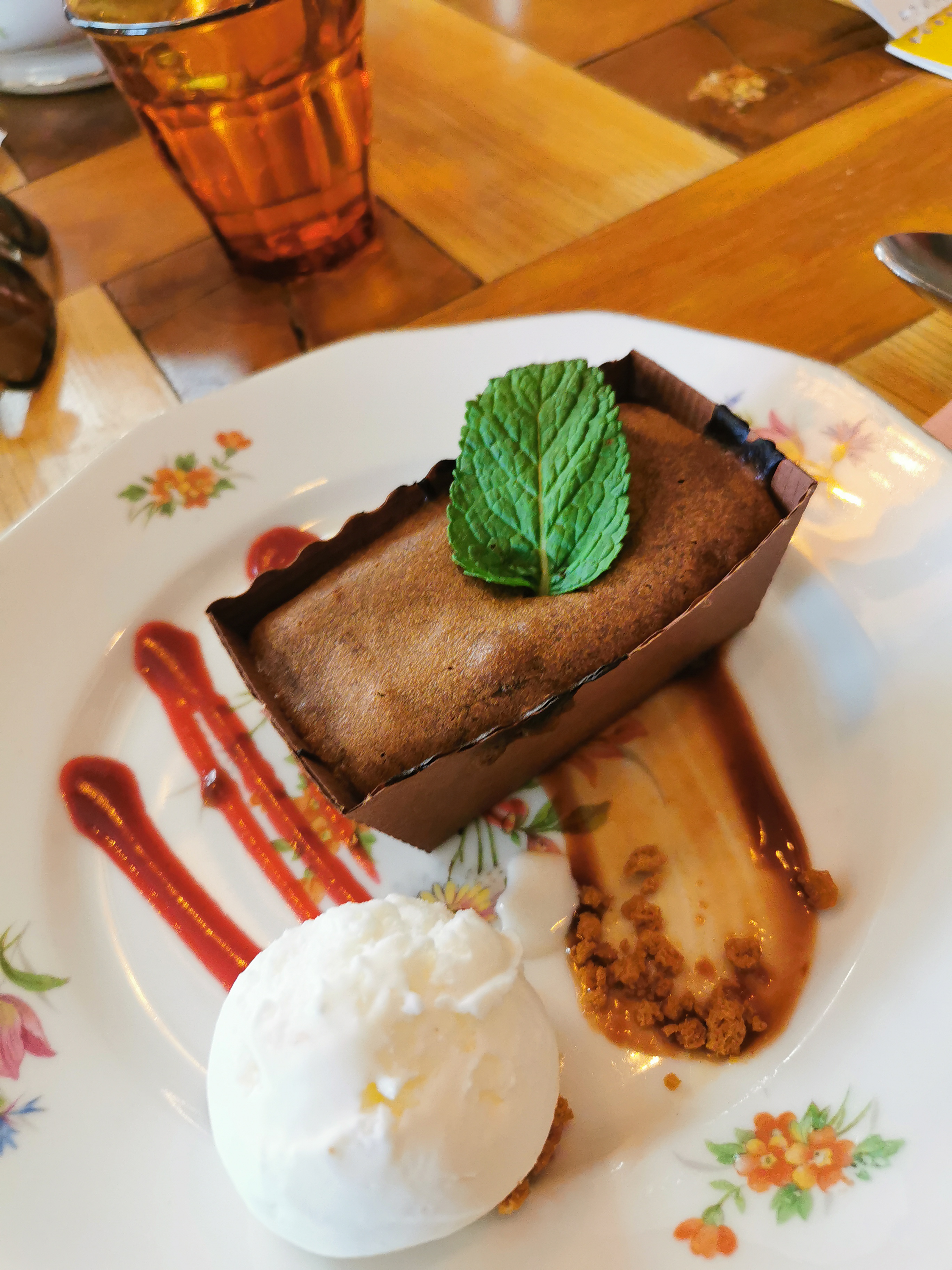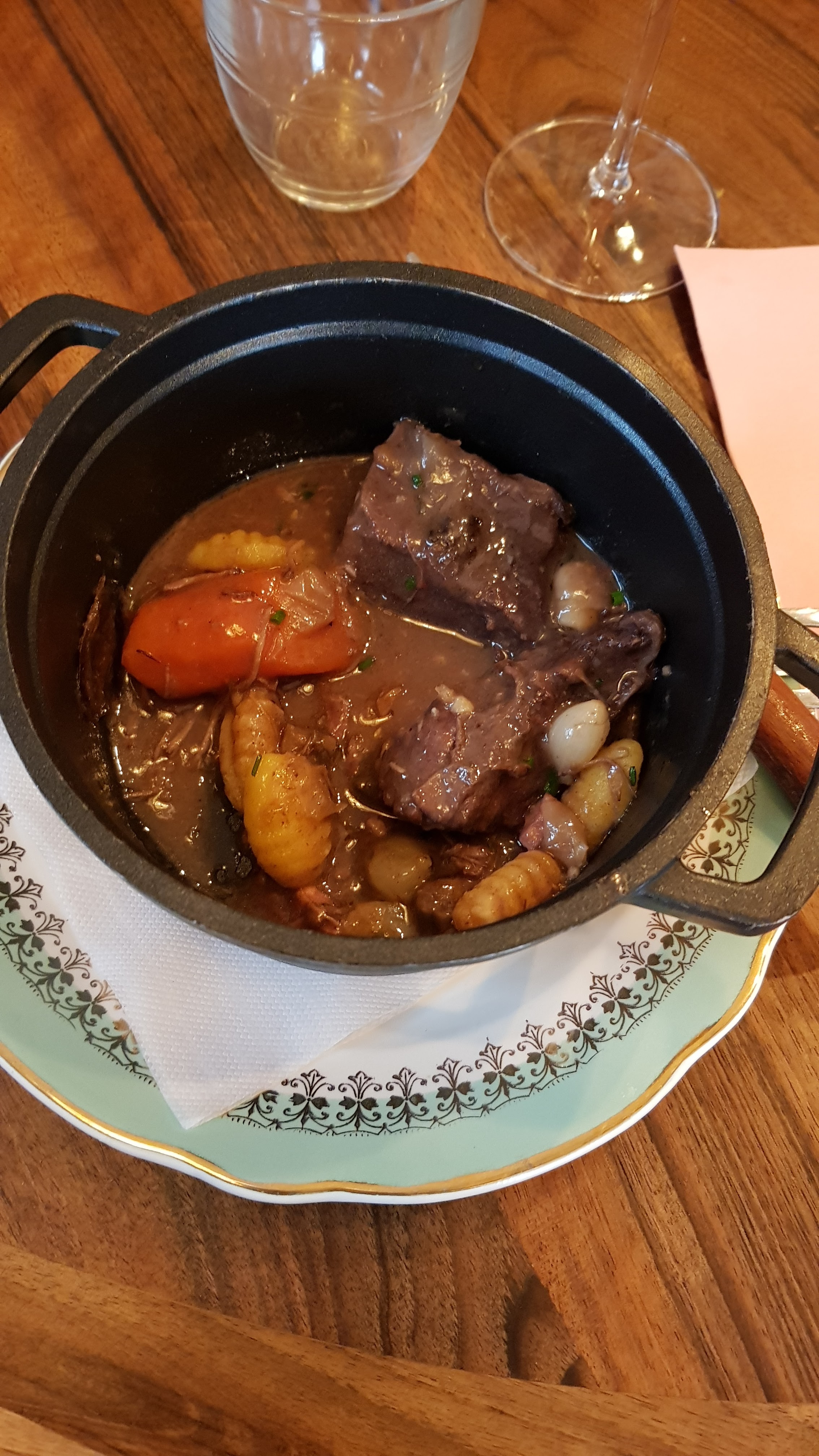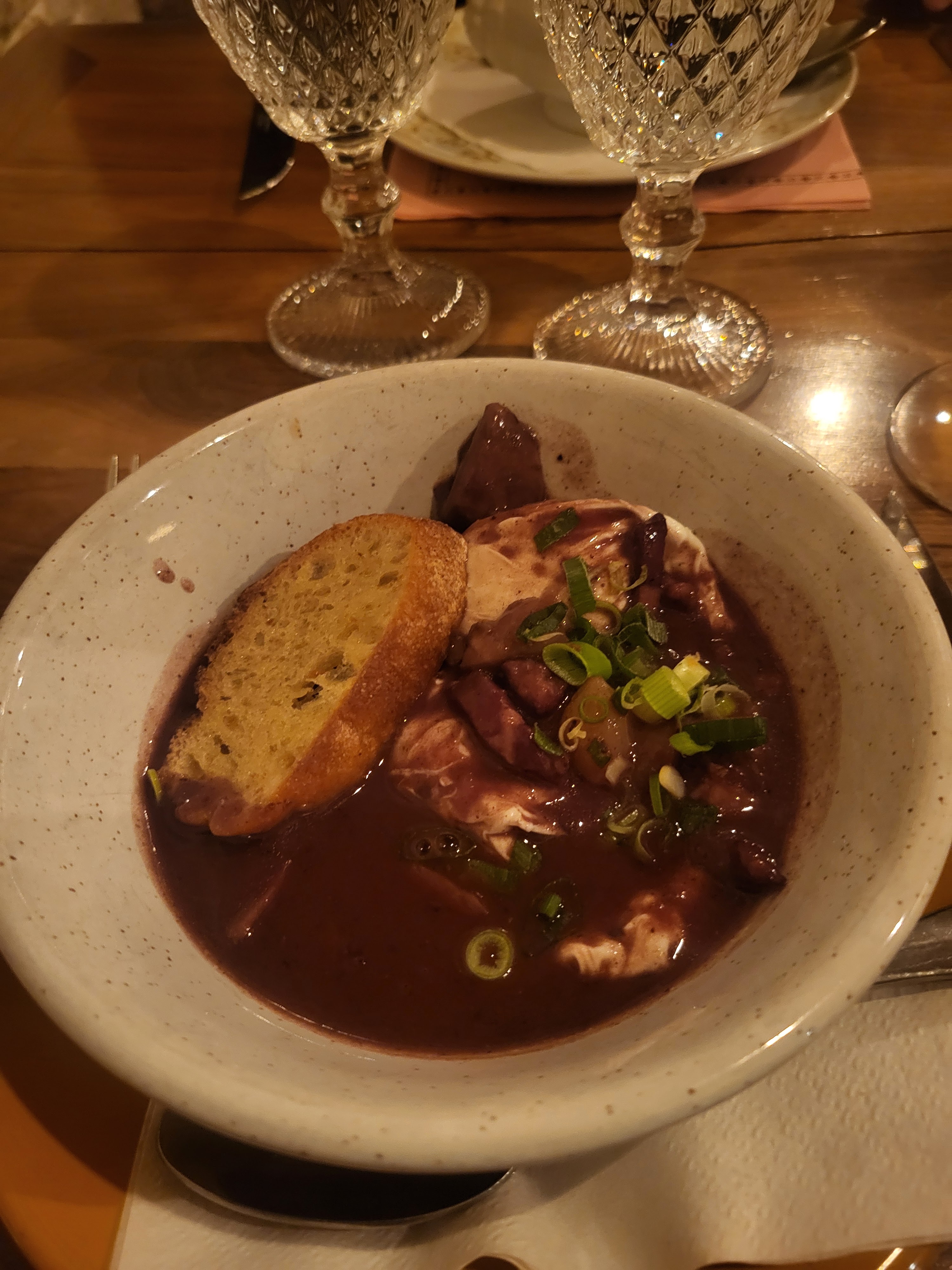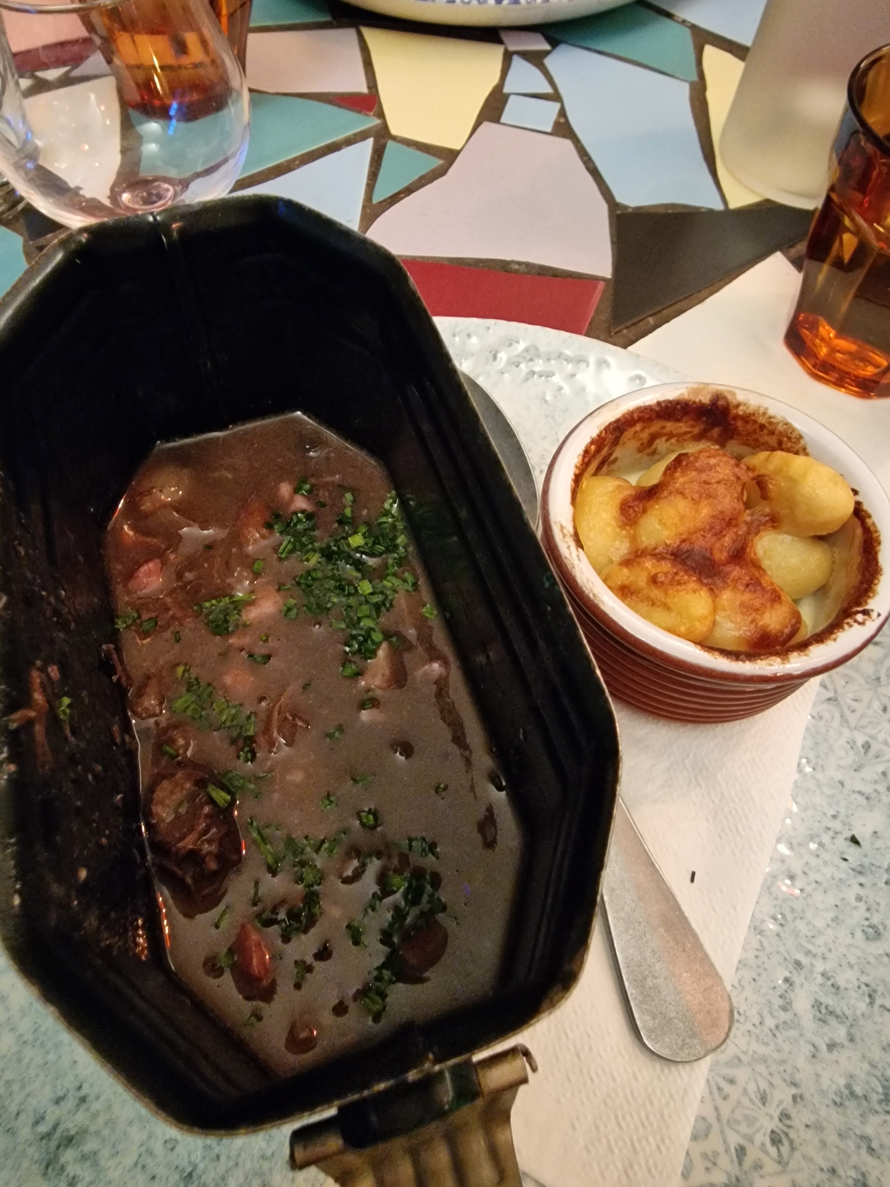 Déco très sympa. Le personnel très aimable. Les spécialités bourguignonnes et les desserts étaient excellents mais la joue de bœuf pas top , la viande était très dure . Les glaçons dans le porto n'étaient pas nécessaires.