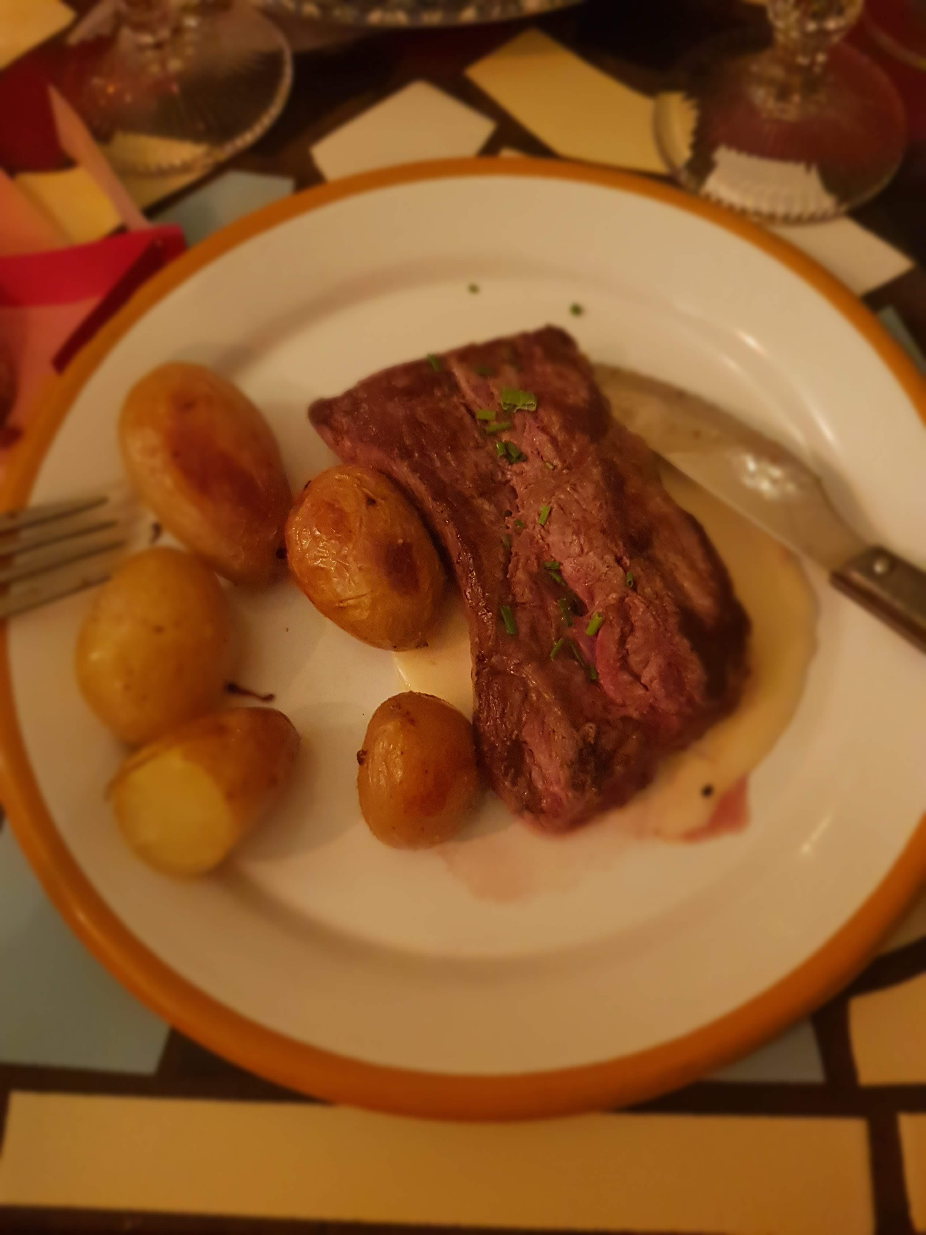Bel endroit pour le dîner. Les serveuses sont très sympathiques, les boissons et la nourriture sont arrivées très rapidement, même s'il y avait beaucoup de monde. Je voulais le steak moyen et c'était parfaitement moyen. Mon partenaire a pris le hamburger, qu'il a également trouvé excellent. Les frites en particulier étaient super bonnes. Un point en moins car les plats étaient servis assez froids, ce qui m'a semblé dommage.