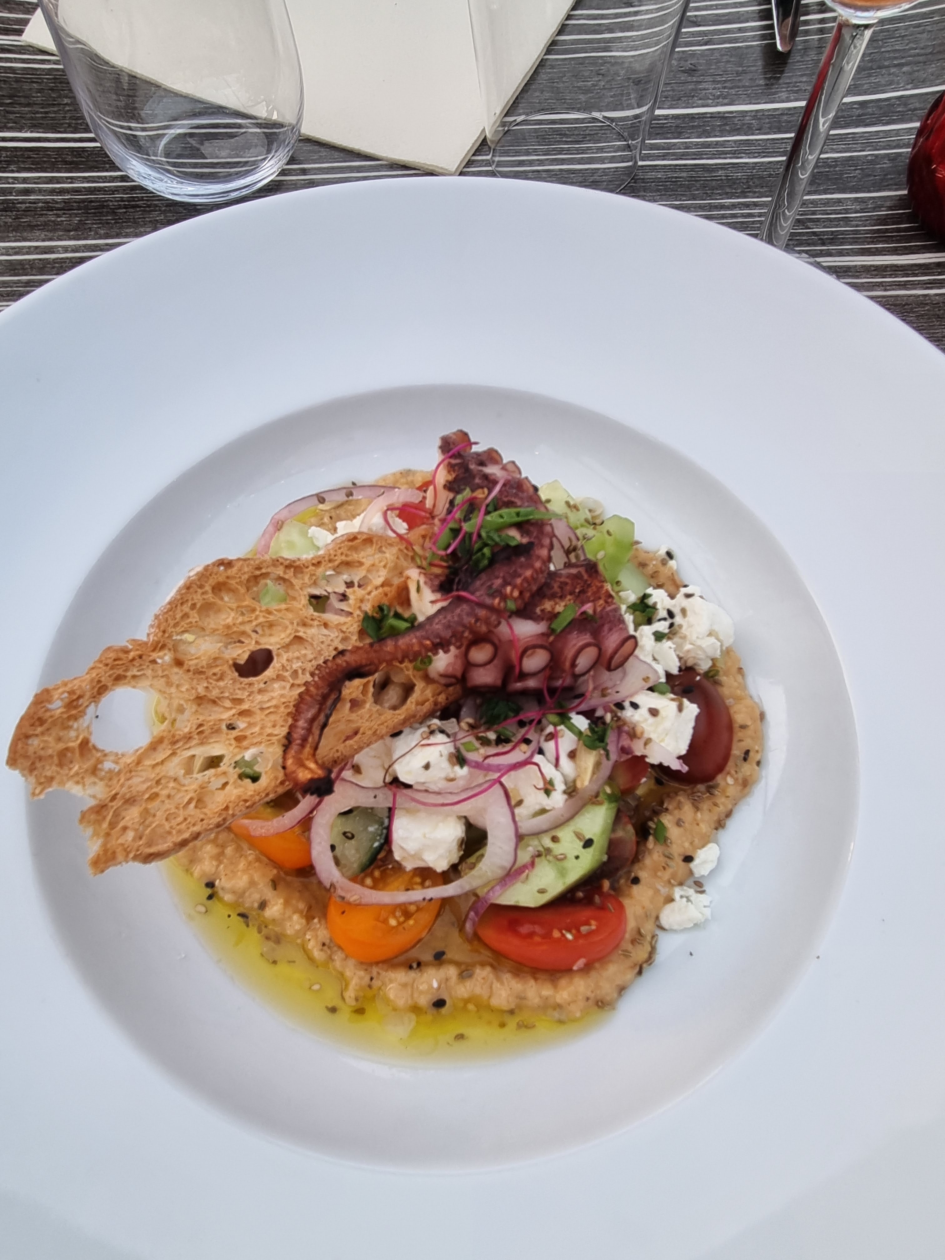 Super déjeuner. Le poulpe grillé? était superbe, il était accompagné d'une délicieuse sauce, d'aubergines grillées à l'humus. Les nouilles spéciales au bœuf grillé étaient étonnamment délicieuses - une infusion un peu asiatique. Désert - chocolat très bon. Ils nous ont donné du kumquat frais. Le service était très bon.