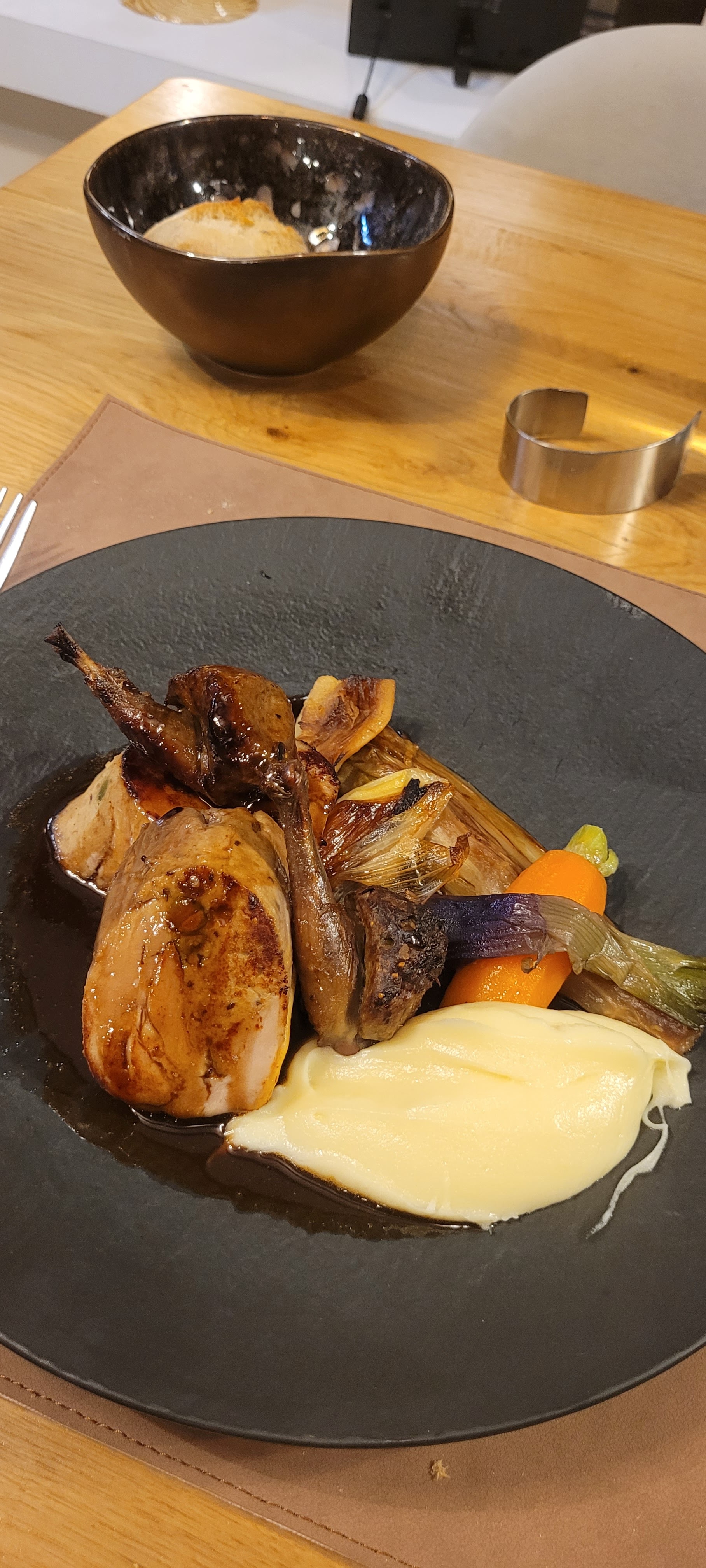 Une seconde soirée qui nous a ravi tout autant que la première. Une expérience gastronomique de premier ordre. Une nouvelle carte raffinée et subtile. Ingrédients nobles sublimés par des combinaisons audacieuses de saveurs. Présentations esthétiques dans un cadre élégant. Service professionnel, de bon conseil et sympathique. Un sans faute et un moment de pur bonheur, merci pour cet excellent repas. Cathy et Bernard (Côté de veau mâturée).