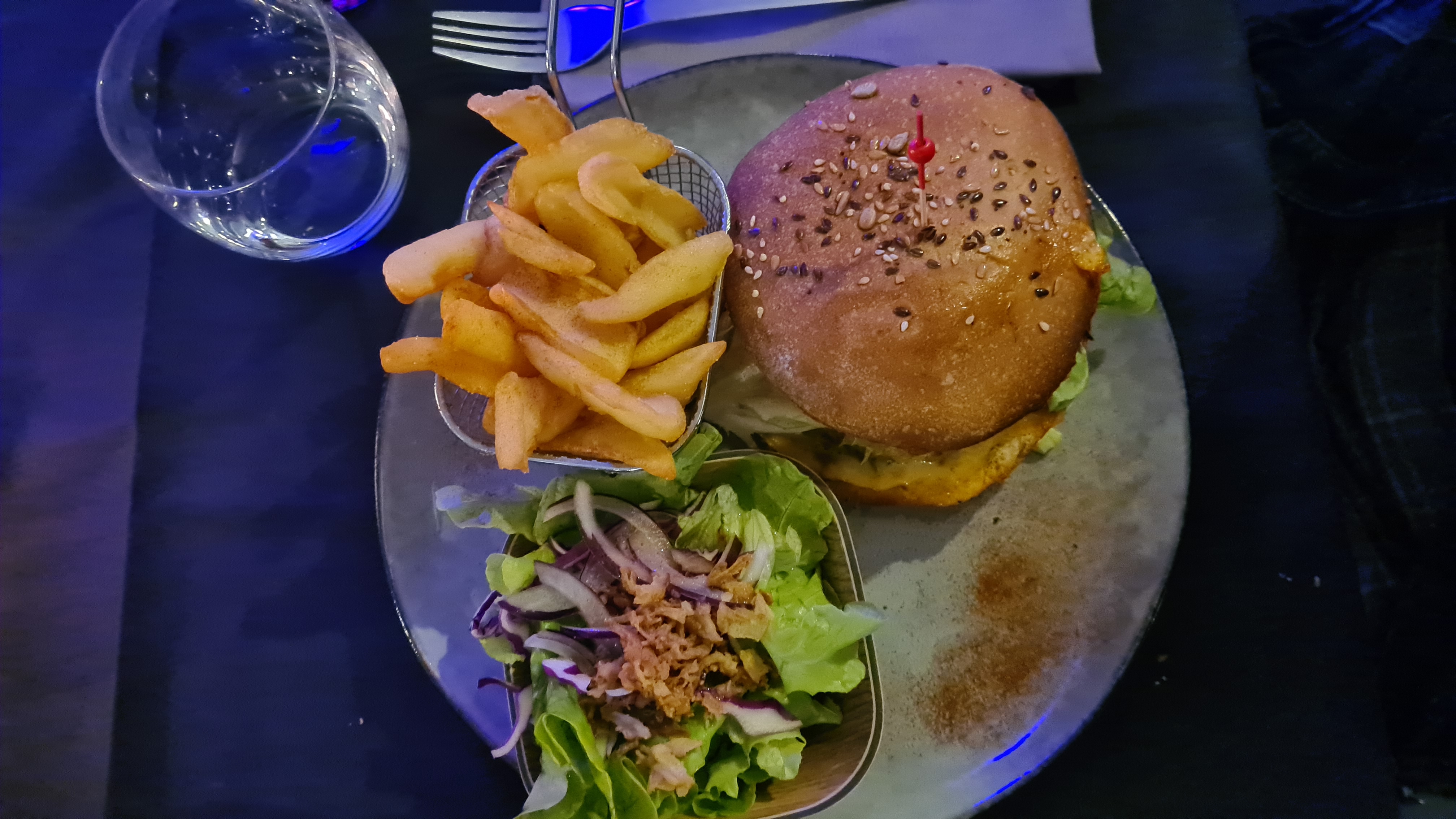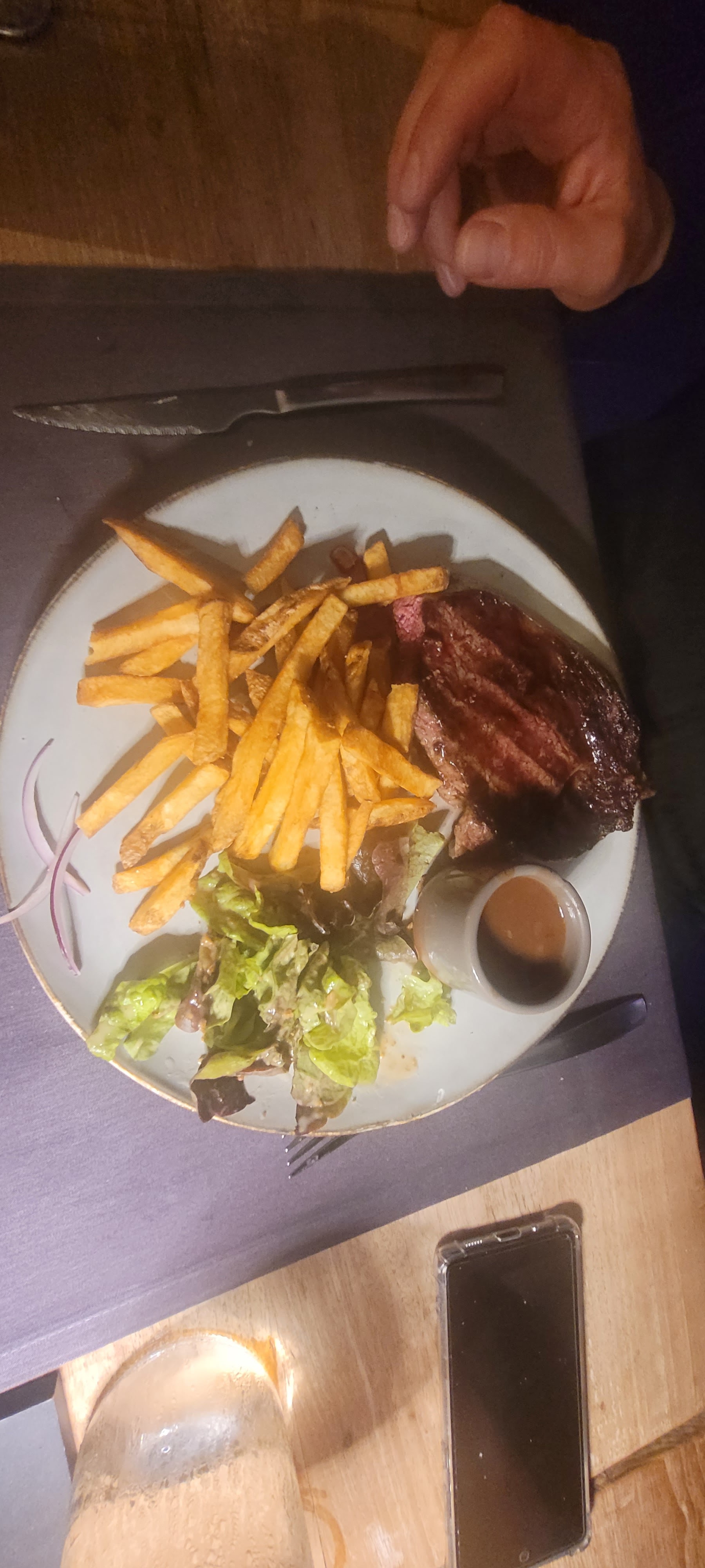 Lieu correct sans plus 🤔 Intérieur trop sombre mur peint en noir carte présentée sur fond noir marron ! prix en bleu turquoise ! 😱 c’est illisible le soir ! 😤 éclairage bien trop faible ! Ampoules 💡 à filaments 🤗 juste un effet de mode Menu Rien d’ extraordinaire apéro cher pour quelques centilitres ! 😩 Gros profit sur une bouteille de plus servi sans amuse gueule ! Faut - il donc venir avec nos chips olive 🫒 et cacahuètes 🤔 pour avaler notre apéritif ? pourtant ça s’appelle la convivialité ‘ triste époque ! de plus le les plats arrivent avant même que nous ayons fini l’apéro 😫 Repas 🥘 trop chiche 🫣 on a l’impression que c’est servi au grammes près 🙄 me suis pas étouffée avec ce mini panier de frites 🍟 il devait bien y avoir 1 pomme de terre et demi dedans et encore pas des GROSSES 🤗 Personnel aimable souriant attentif. Prix correct sans plus 🙄