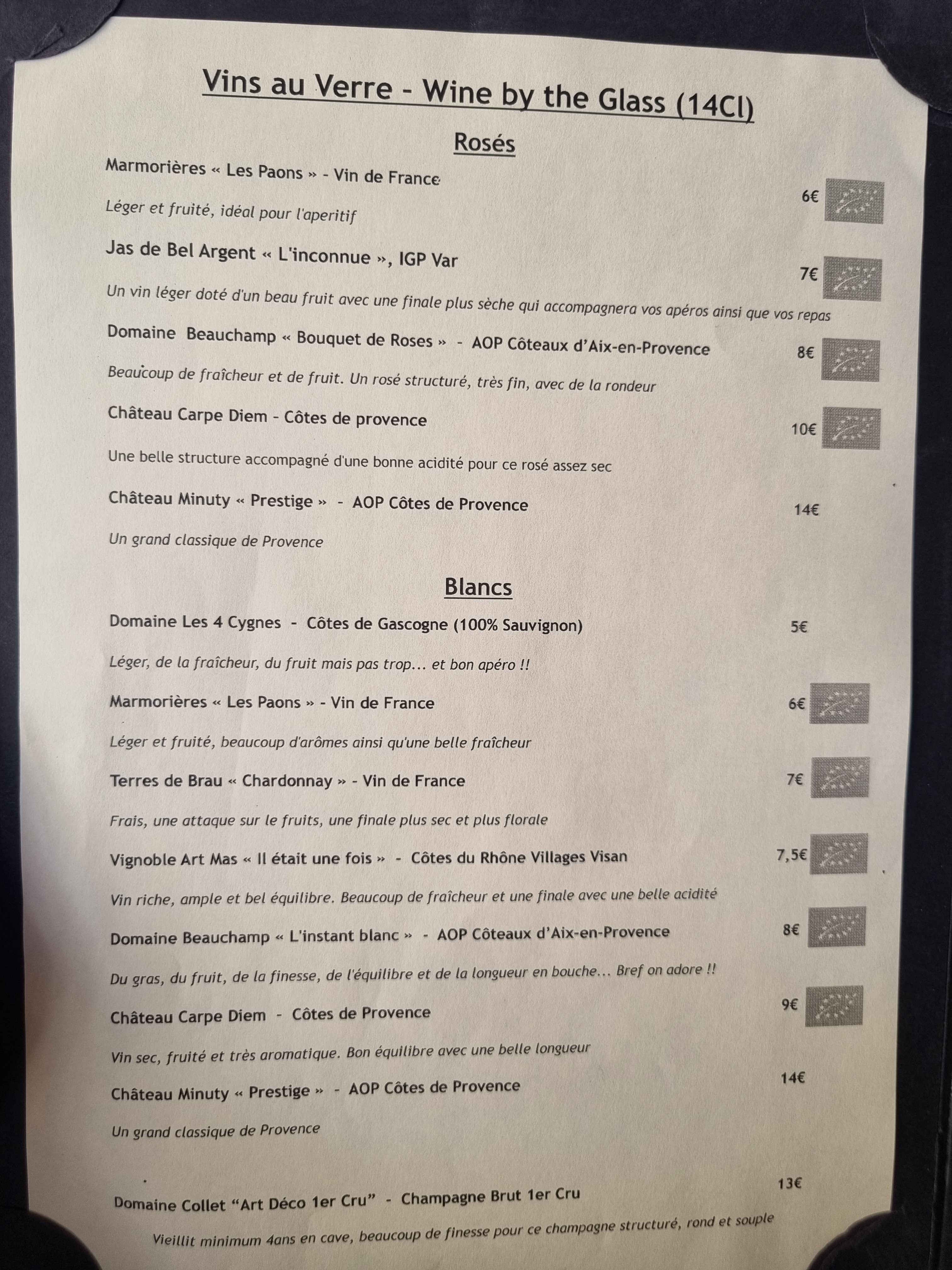 Une carte simple, signe de fraîcheur des produits. Une charcuterie ibérique a tomber, un triple crème de Normandie exceptionnel et un accueil simple et amical sans chichis propre à Cannes. Belle découverte et un retour évident.