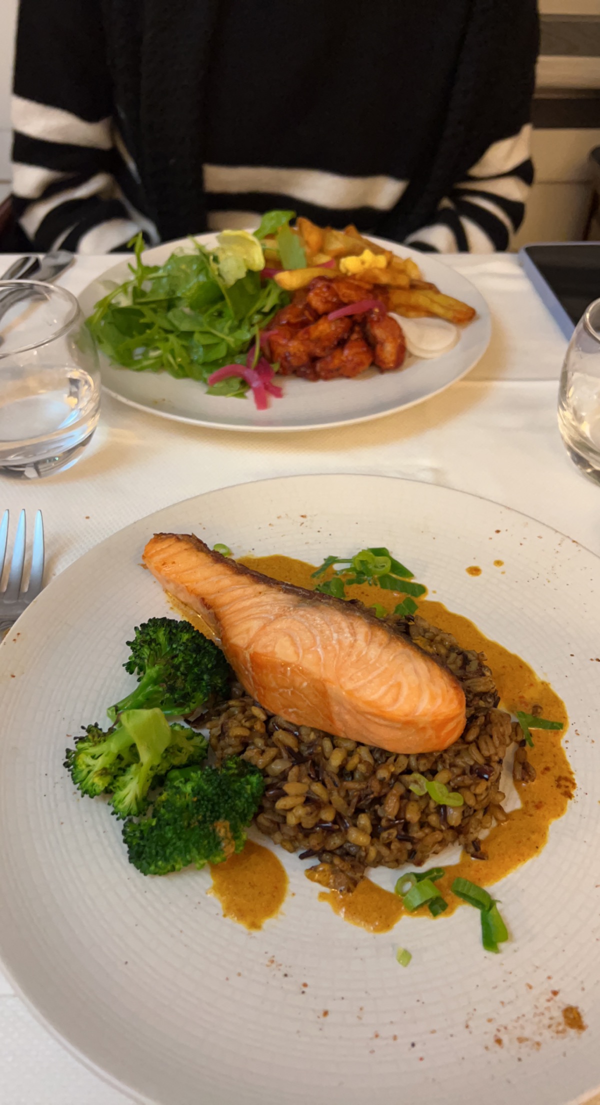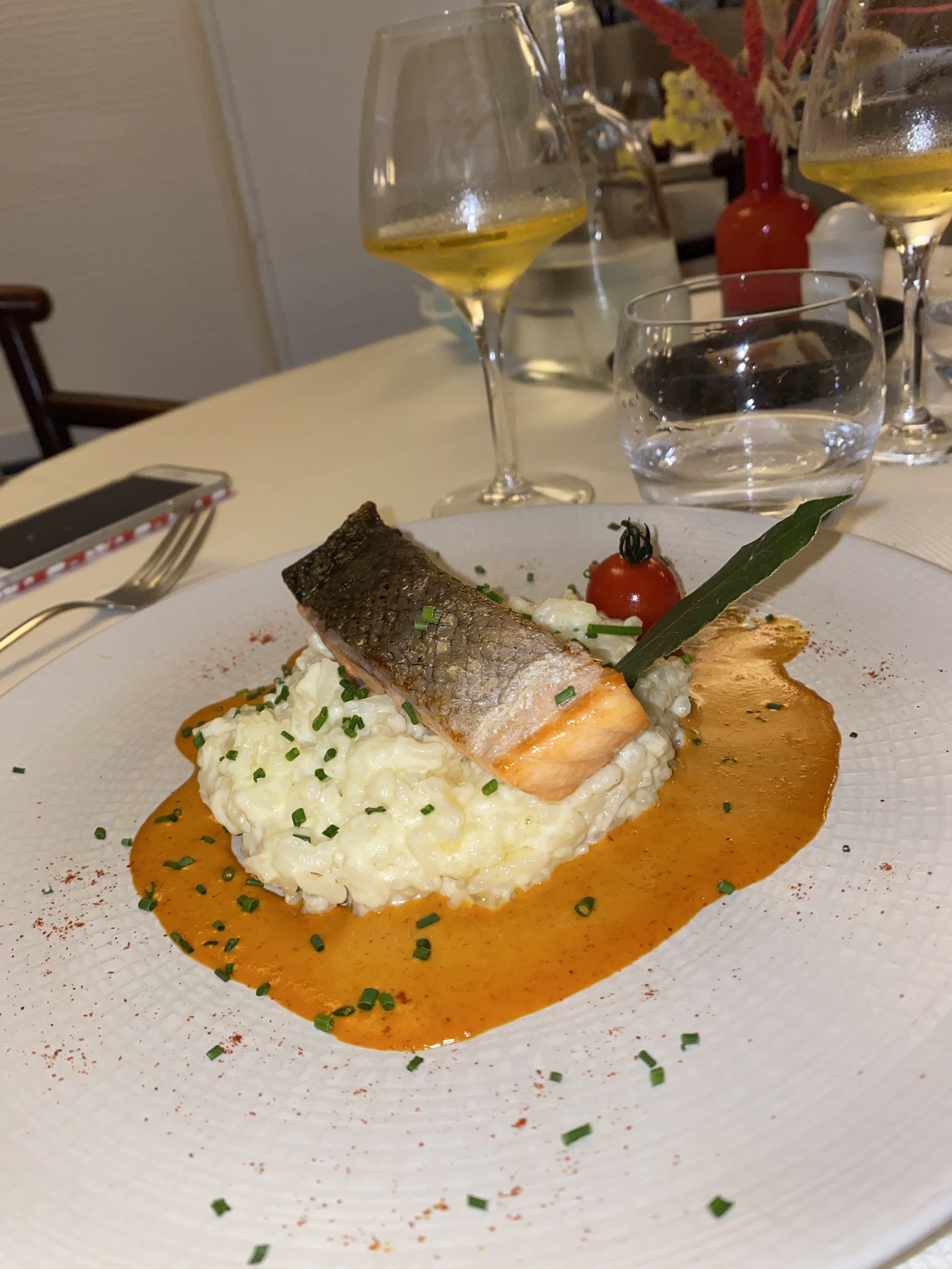 Dîner a deux, avec un coffret wonderbox. Nous avons été très bien accueillis et servis. Le repas était delicieux. Tataki de saumon en entrée, filet de bar et magret de canard en plat, et cheesecake en dessert. sans oublier une.bouchée apéritive, et une mignardise avant le dessert. Nous nous sommes régalés.