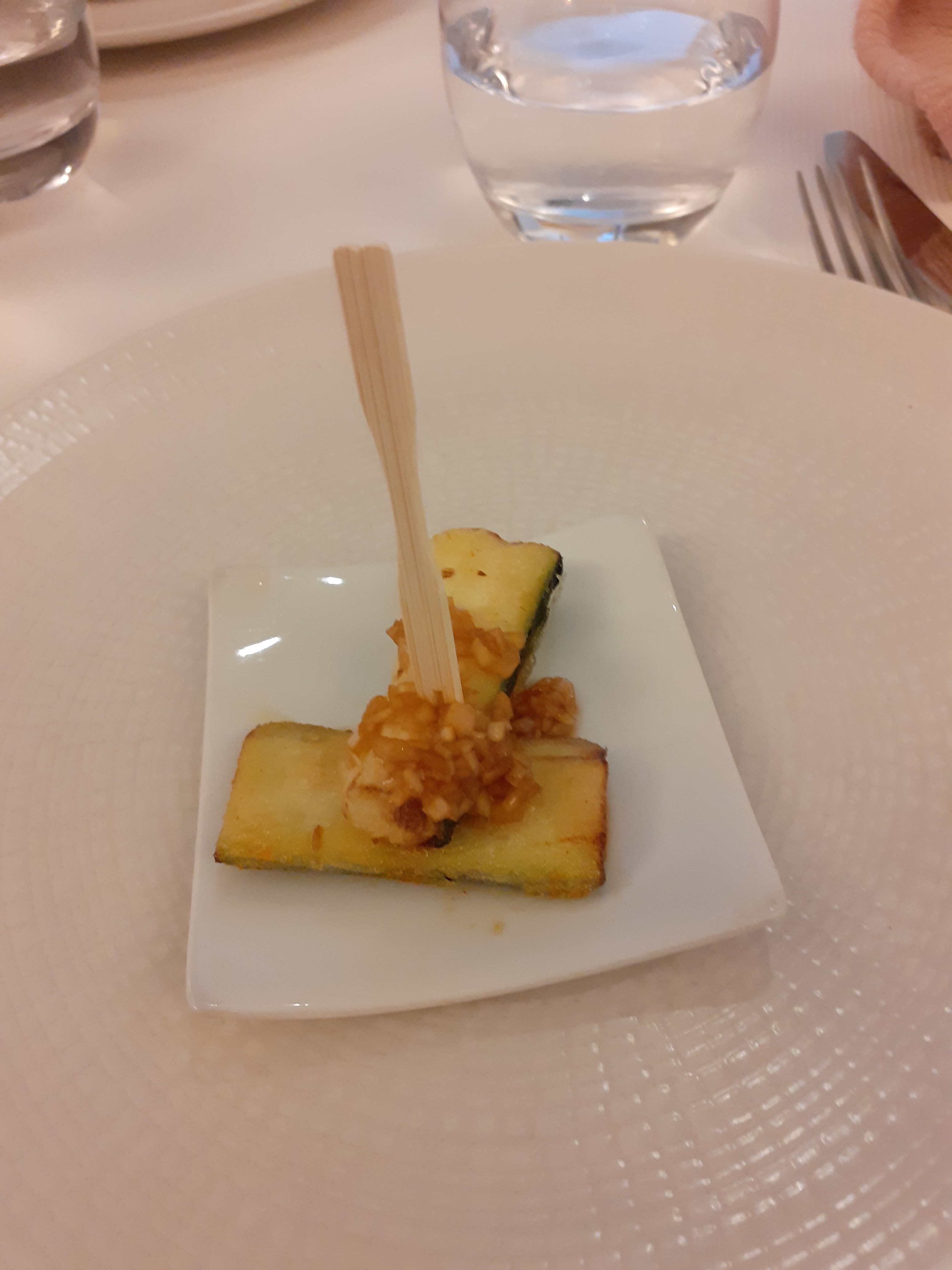 Un plat végétalien. Le petit hors d'œuvre avec de la courgette super bien moelleuse était délicieux !
