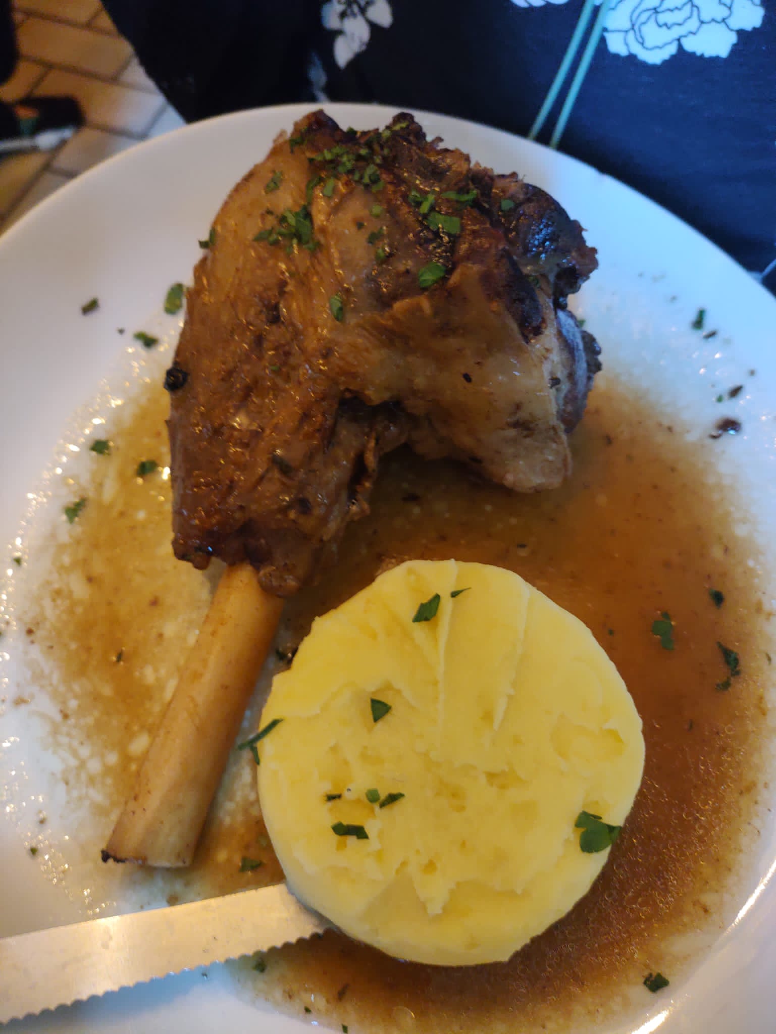 Nous avons beaucoup apprécié notre soirée ici... sans une table de dix personnes très bruyante (et ils accusent les Américains d'être trop bruyants !) qui ont poussé le reste de la maison à augmenter le volume pour converser, cela aurait été un match égal. meilleure soirée. Mon DH a trouvé son jarret d'agneau excellent. Mon steak de côtes était très gras et grizzly mais savoureux. Le chef a bien fait de ne pas trop cuire ce steak fin. C'était étonnamment rare, même si j'avais demandé une version moyennement rare (peut-être que quelque chose s'est perdu dans la traduction). Les escargots étaient énormes et délicieux ! Notre vin de Saint Emilion superbe !