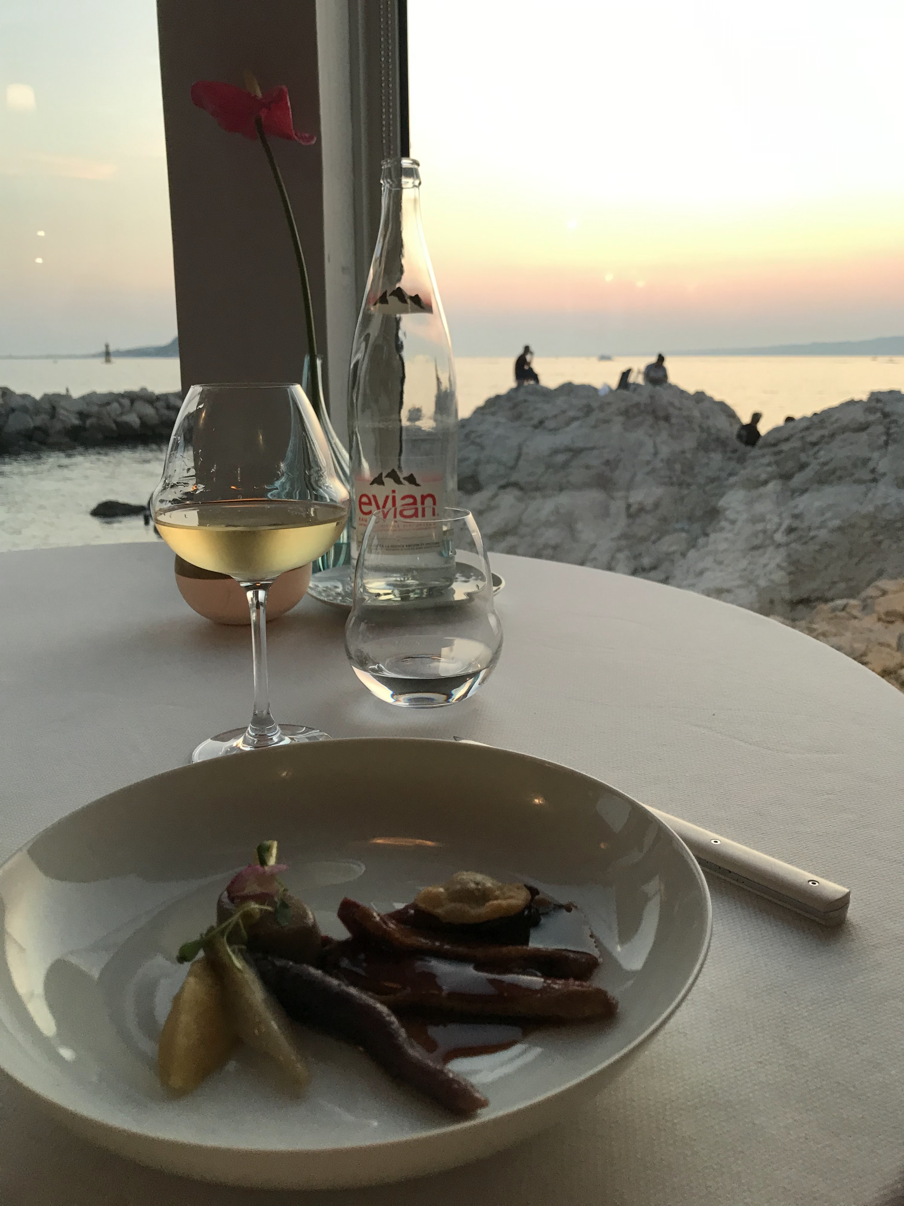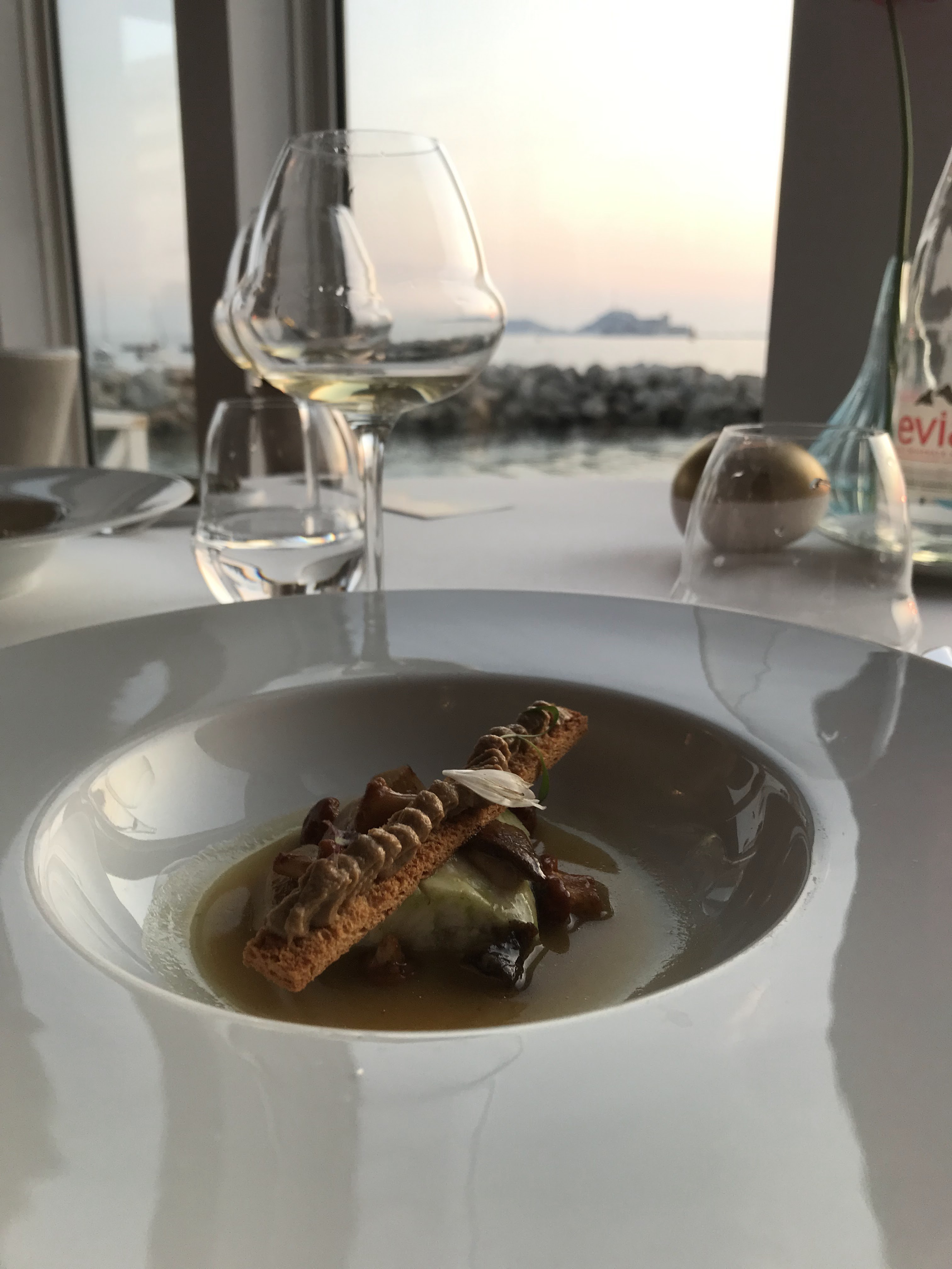 Un voyage culinaire méditerranéen, « les pieds dans l’eau », comme on les aime à Marseille. La salle est épurée, la vue sublime sur la grande bleue, et le service impeccable vous transporte de plat en plat sous la baguette du Maître d’Hôtel qui connaît son affaire. Bouchée à la crevette, aspic de bouillabaisse, poulpe à la fois croustillant et fondant, homard perdu entre pois et persil, chapon sur lit de risotto, pêche en trois façons… Laissez-vous transporter par Guillaume Sourrieu qui étale la mer à vos pieds pour le plus grand plaisir de vos papilles. Note spéciale pour le loup, incroyablement fondant et accompagné de ses légumes croquants, qui a fini d’ajouter une note magique à ce moment. Le sommelier est à votre écoute, soyez à la sienne, cela vaut le coup ! Michelin * depuis 2000, et ils nous le rendent bien. _____________________________ Take a moment to taste the finest mediterranean food, « the feet in the water », just like we like it here in Marseille. The room harbors minimal decoration, the view on the sea is sublime and the service is impeccable thanks to the Maître d’Hôtel who knows his part. A shrimp bite to begin, an aspic of bouillabaisse, a crispy but smelting shrimp, a lobster cooked between peas and parsley foam, a scorpion fish on its risotto bed, then a peach declined in three different ways. A special thanks for the wolf fish which was exceptionally soft and smelting and surrounded by its crunchy vegetables, and turned this diner into a magic culinary escapade. The sommelier is there for you, just listen to his advice and you won’t be disappointed ! Michelin 1* since 2000 and it is worth it.