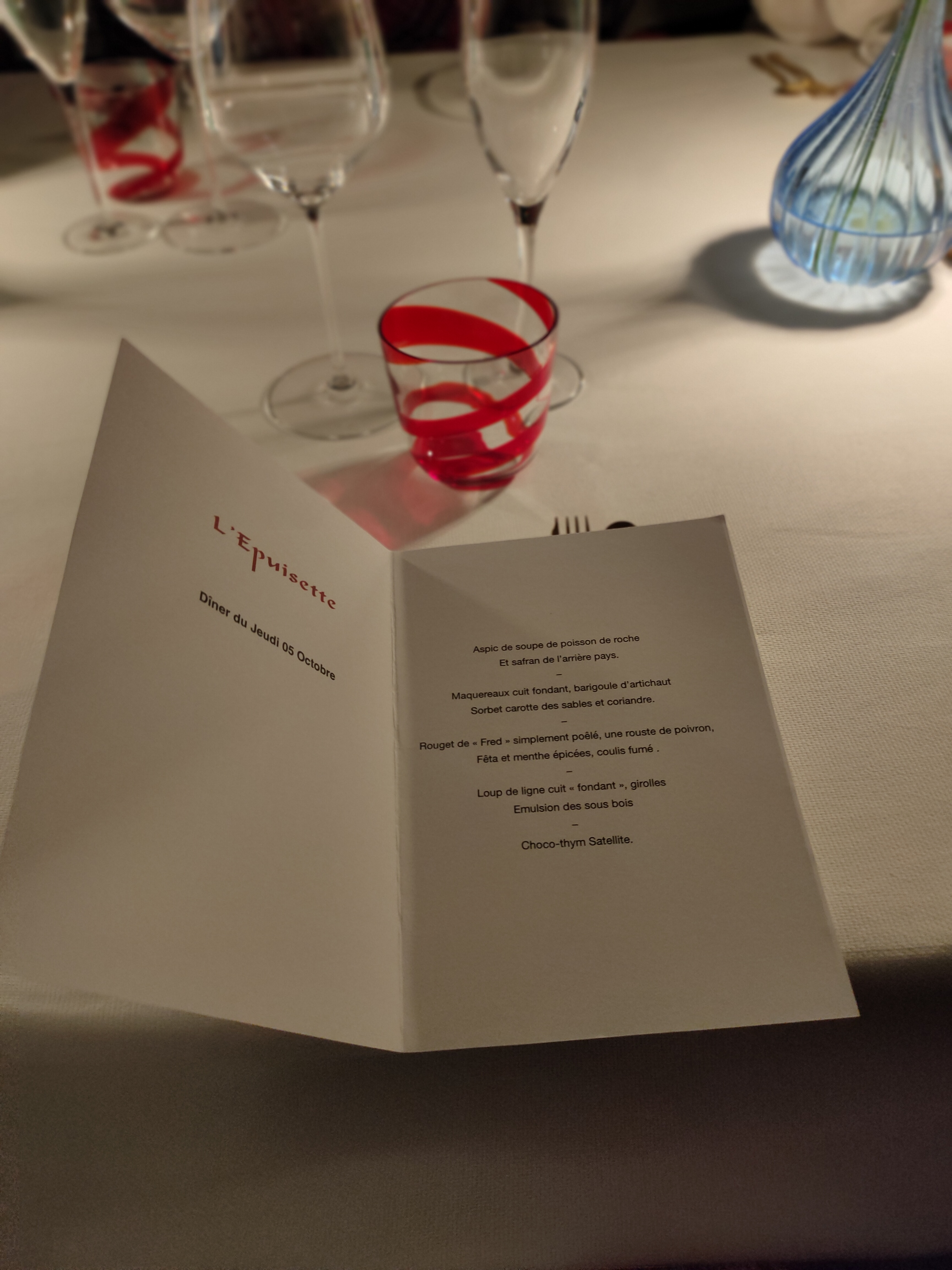 Excellent, vraiment excellent, mon épouse et moi-même avons passé un très bon moment, du pur bonheur ! Nos enfants nous ont fait un cadeau en nous invitant à l'Epuisette, et bravo au chef et à son équipe. Pour dire , j'ai dû perdre du poids depuis plus d'un an pour raison de santé, une première fois 34 kg et un deuxième 23 kg, et j'ai dû revoir complètement mon alimentation, aujourd'hui, j'ai découvert et re-découvert des saveurs des parfums... Et aujourd'hui j'en ai eu les larmes aux yeux, tellement j'ai pris du plaisir comme jamais ! Je n'ai pris aucune photo pour la simple raison que j'ai voulu profiter de ce moment, et donc plutôt que de contempler des photos, je vous invite toutes et tous à vous y rendre et d'avoir autant de plaisir que j'ai pu en avoir.
