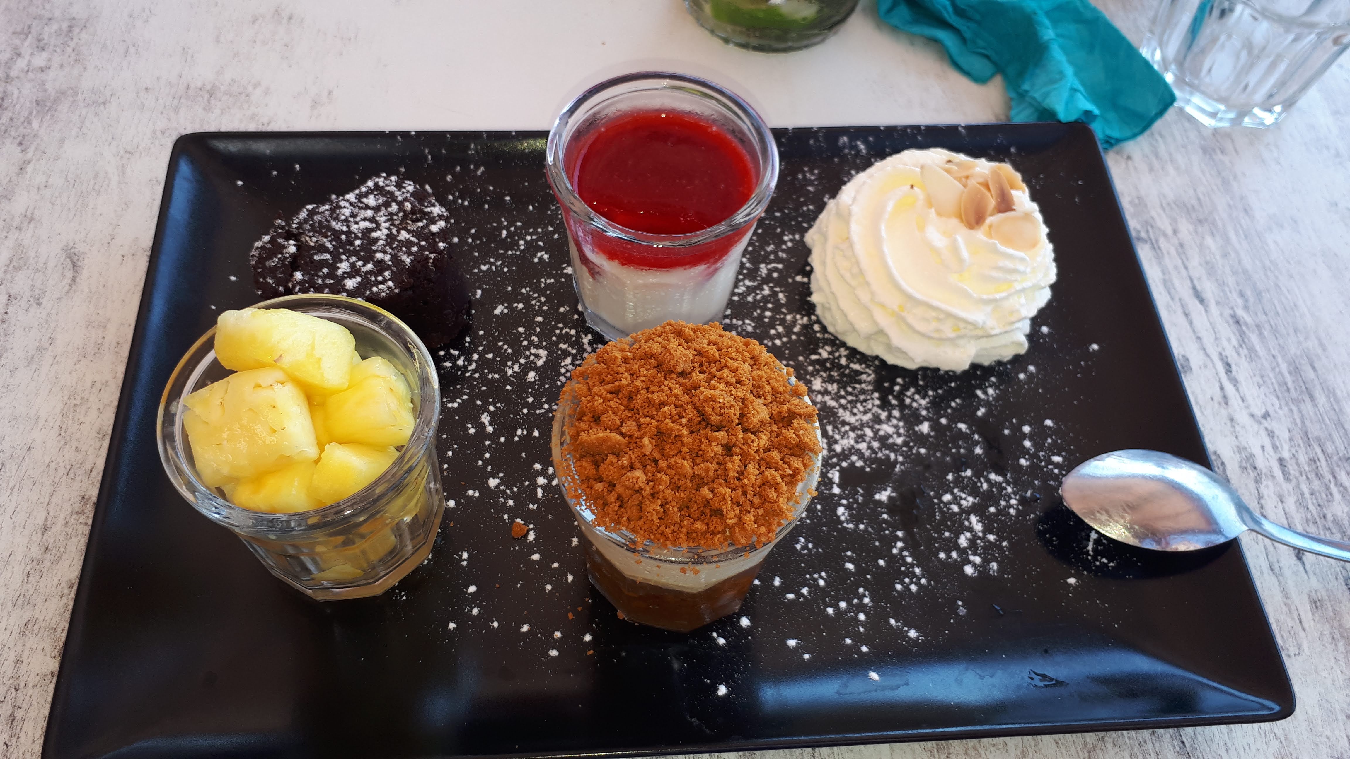 Bravo dans tous les domaines : accueil souriant, aimable, brochette thon, gambas : vrai délice, et pour un prix de 15 euros avec inclu un crumble de fruits maison à faire rêver ! Tres belle decouverte ! Allez y, les vacanciers, sans retenue . félicitations et encouragements à toute l'equipe