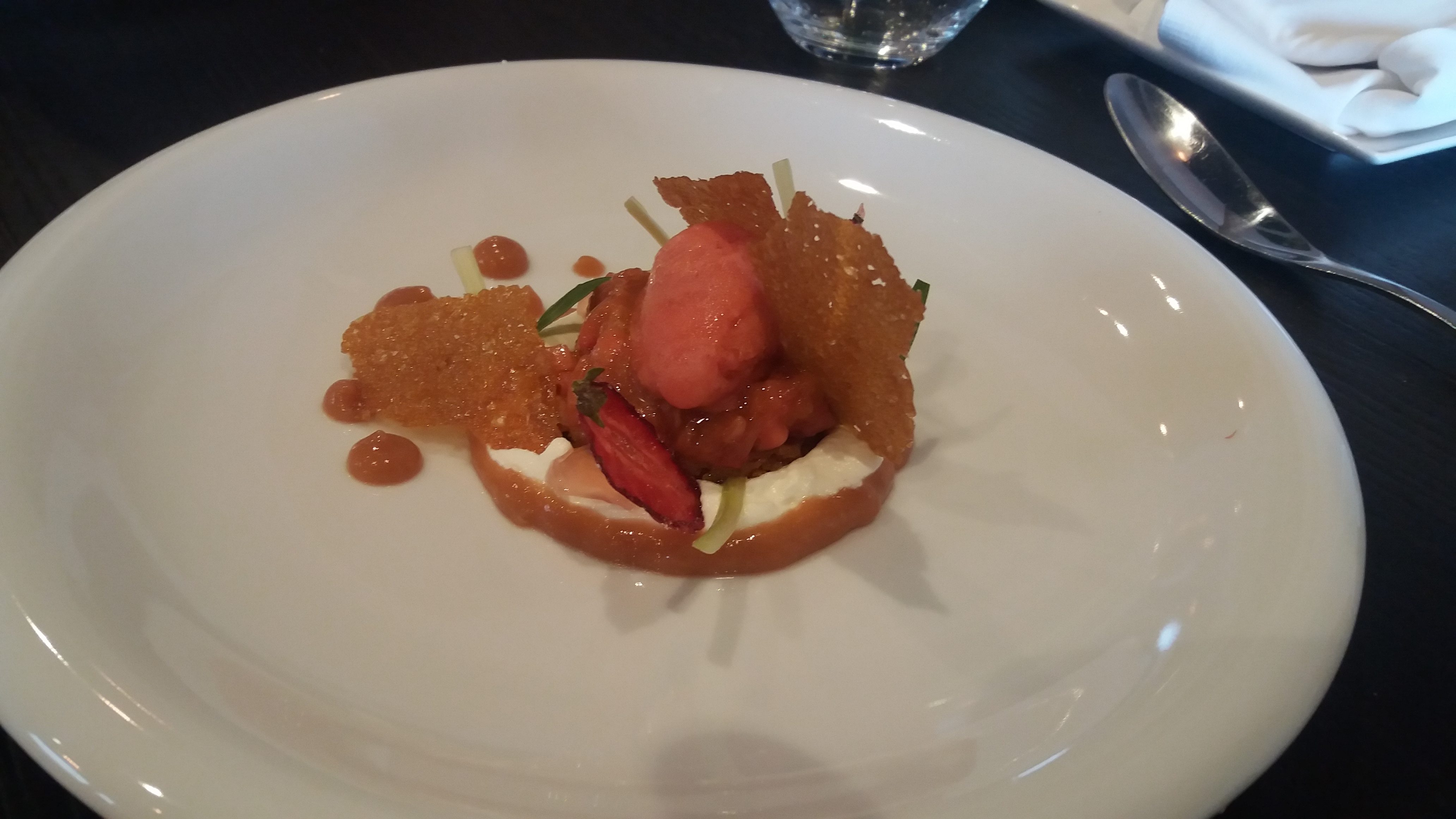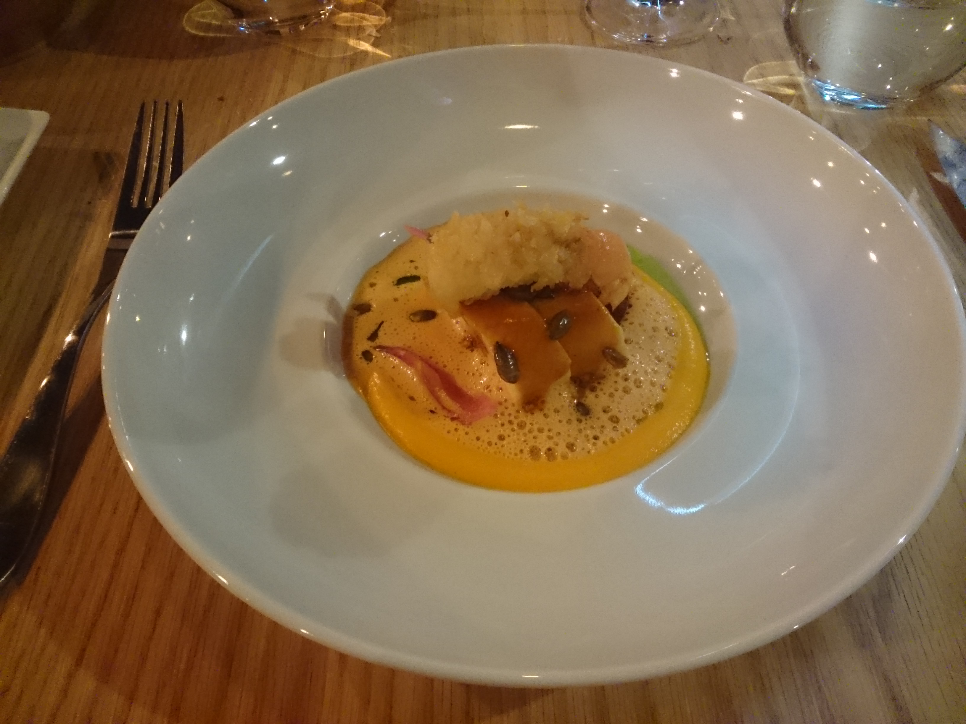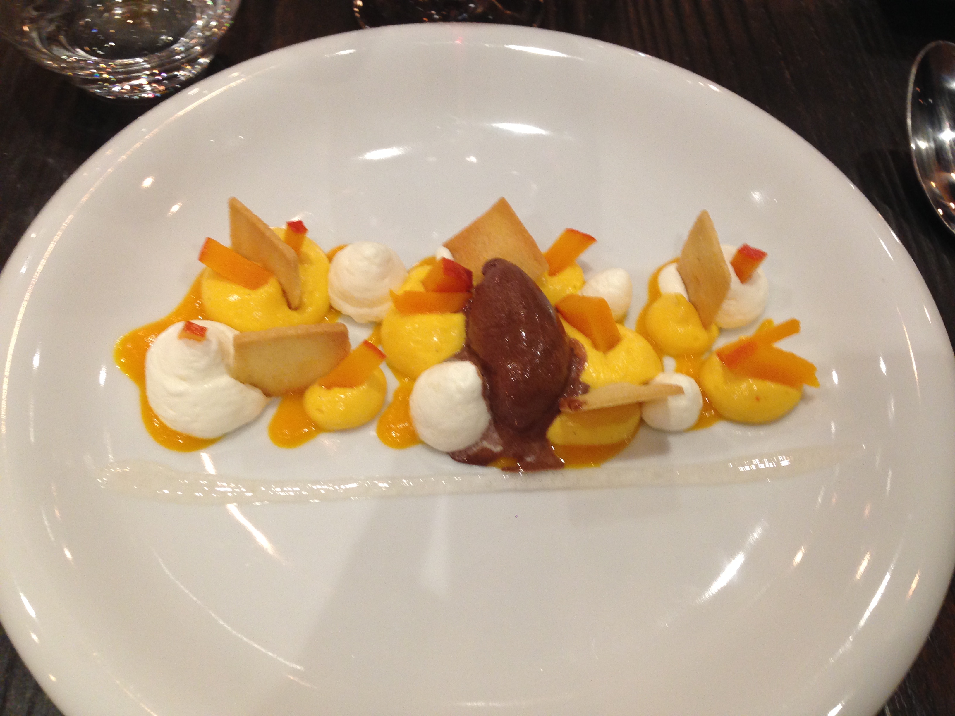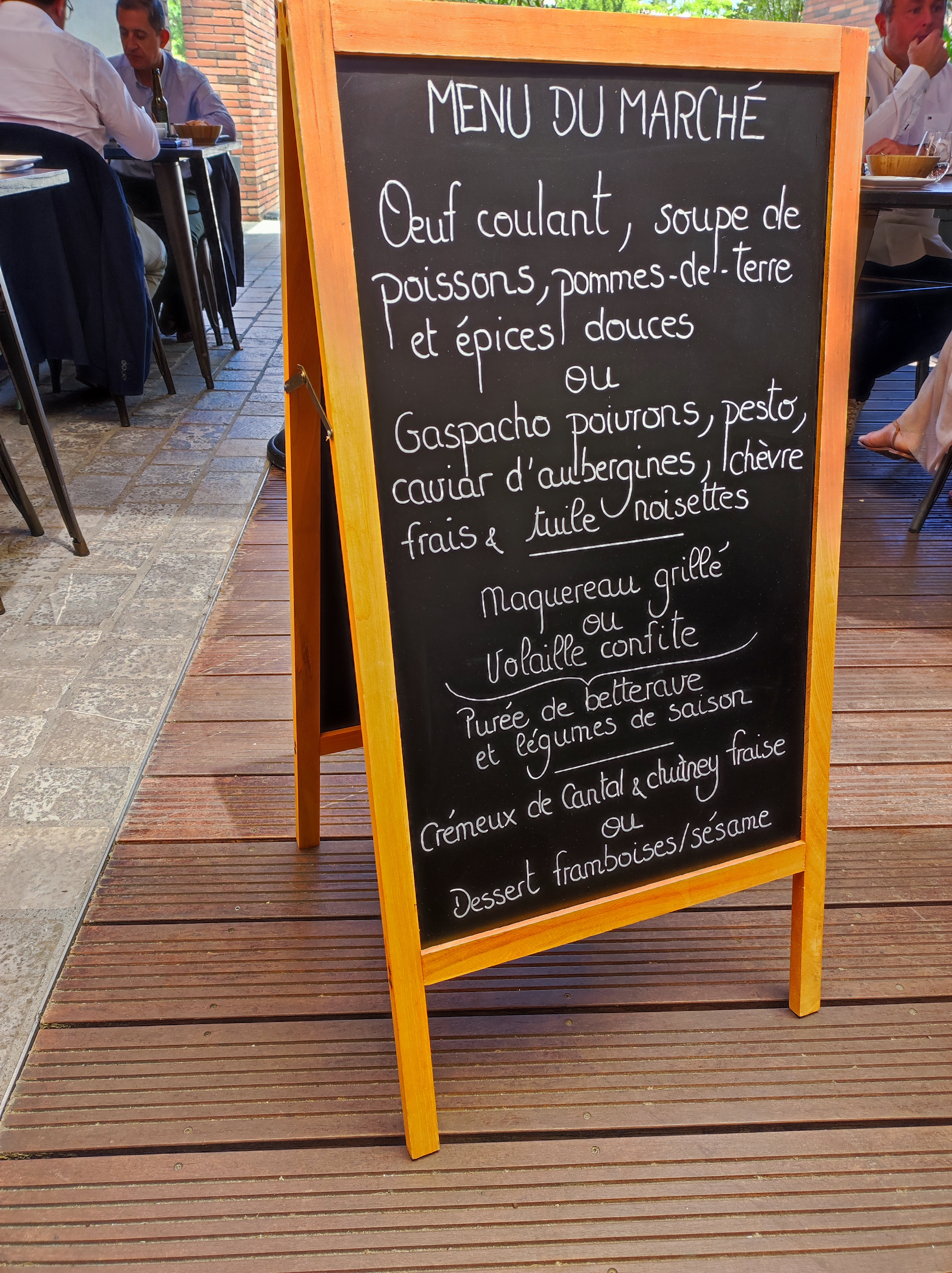 Très bon. Au menu : - Maquereau mariné aux agrumes huile d'herbe, pomme, épinard frais et croûtons - Foie gras poêlé accompagné d'une compoté et d'un sorbet de poivrons - Filet de rascasse sur purée de carottes émincé de chorizo - Poulet roux ariégeois sauce volaille crème d'ail et fondue poireaux - Fromage fondue osso eraty sur lit de confiture de cerise et poivre du Vietnam - Compotée d'abricot fromage blanc - Coulis de roquette, roquette fraîche, sorbet roquette, mousse de framboises , gâteau amande, coulis de framboises et framboises fraiches