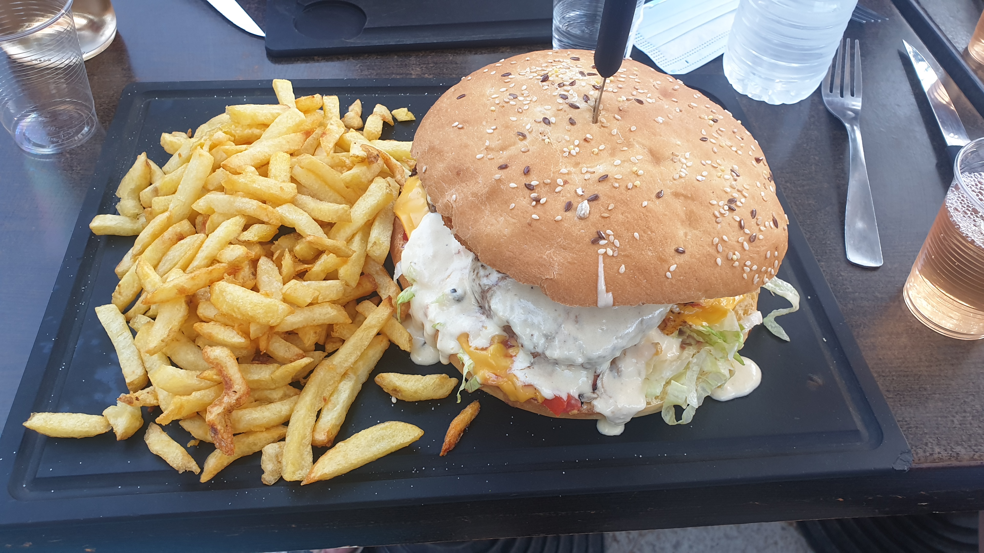 Très bon burgers et très bonnes frites, mais assez étonnée qu'aucun des cuistots ne porte de masque dans les circonstances actuelles...