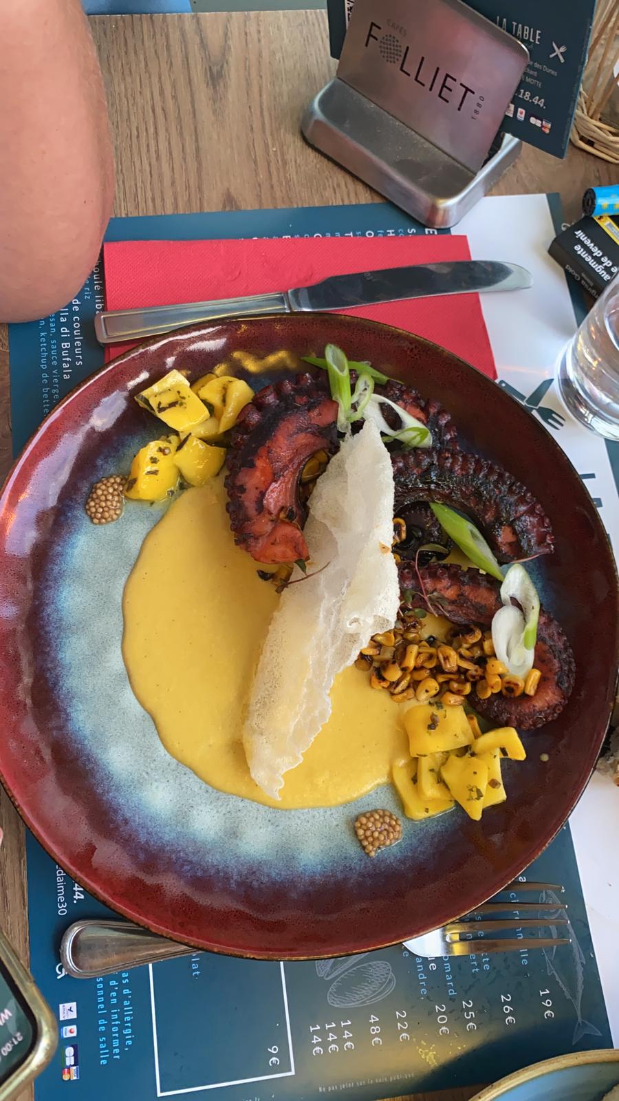 Un accueil froid, le dressage d'assiette pour le Poulpe grillé médiocre, qui n'invite pas à la dégustation. Un accompagnement inexistant et une sauce qui tient la majorité de l'assiette. Comment est-il possible d'envoyer en salle des assiettes dans cet état ??!! Le pain était bon. Très mauvais expérience et la sensation du piège à touriste....