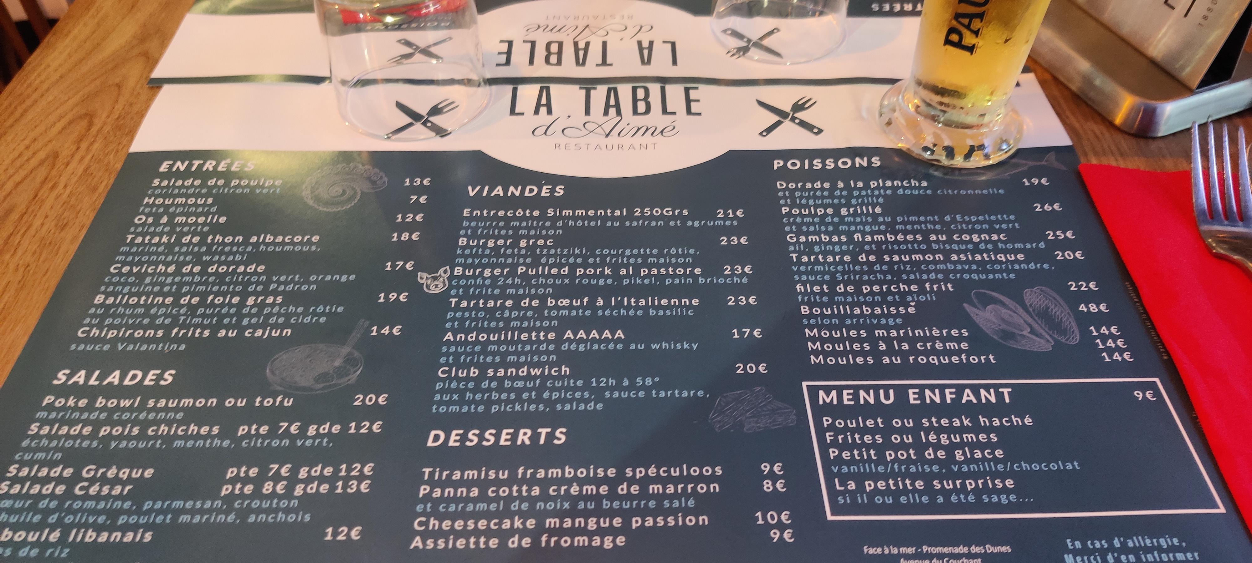 La table d'Aimé au couchant un restaurant vraiment top il en a pour tout les goûts. Les serveurs sont très bons et pour le patron il est vraiment super sympa sa femme autant agréable et le cuisinier a des c'est plats excellent et en bouche miam-miam les entrées parfait et pour la fin les douceurs un régale . Merci à vous a toute l'équipe ont va revenir ont vous lâche pas et en plus ont s'éclate bien à l'année prochaine en août