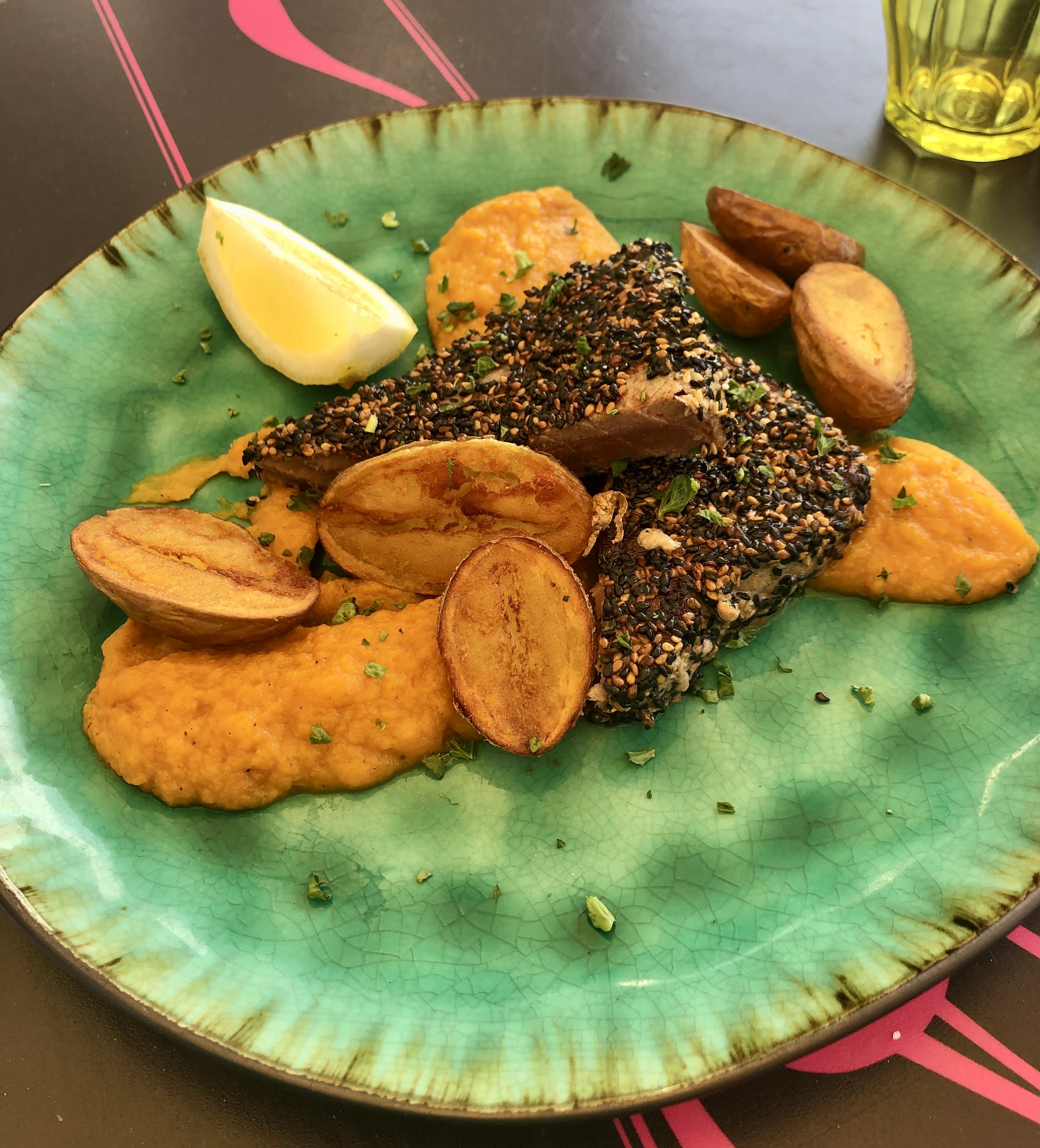 Nous avons dégusté le saumon agrume hibiscus....c'est une explosion de saveurs!!!! Un savant mélange de très bons produits et d'épices diverses et variées... Cela fait plusieurs fois que nous venons dîner. Nous sommes à chaque fois surpris et étonné par ce don du mariage des saveurs. AIMÉ Est très doué !! Félicitations à ce jeune chef!!!!! Cette petite entreprise familiale, très sympathique, mérite votre visite. NOUS VOUS CONSEILLONS FORTEMENT CETTE TABLE!!