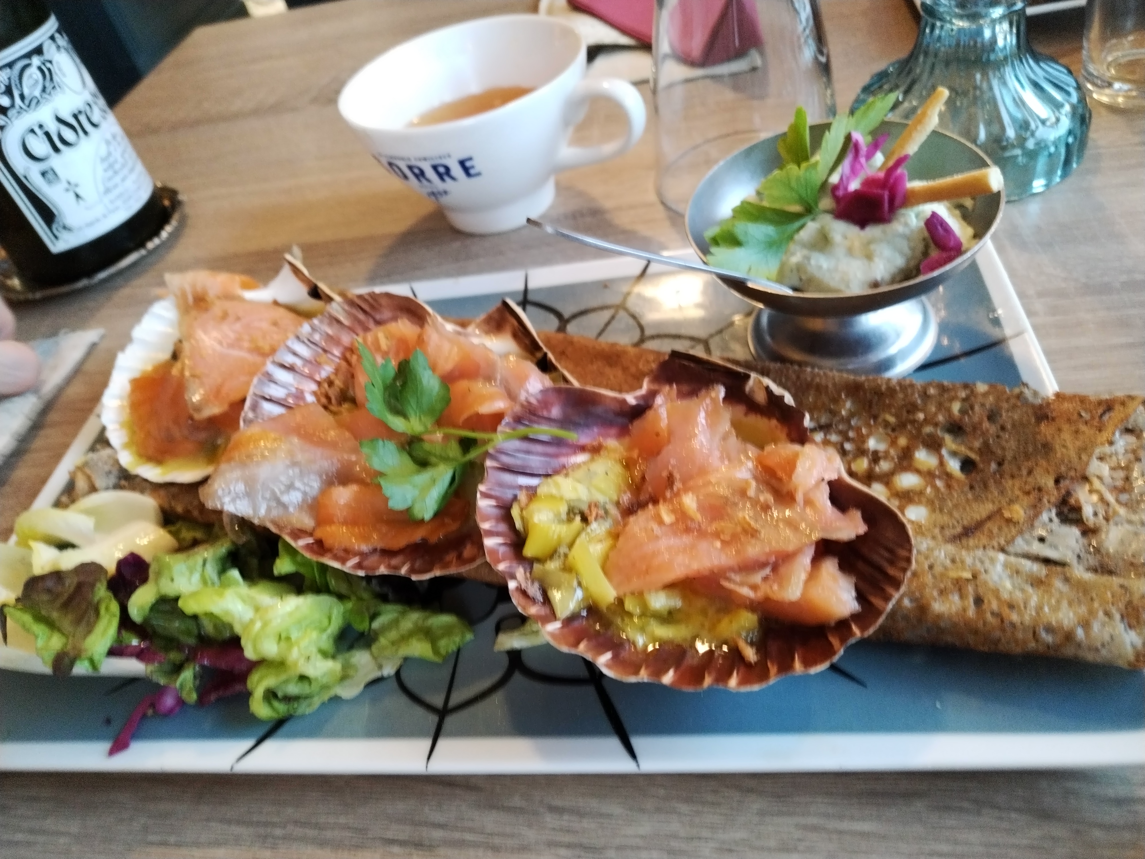 Une bonne adresse pour les galettes et crêpes bretonnes ! Galette de sarazzin et brochette de St Jacques 😋