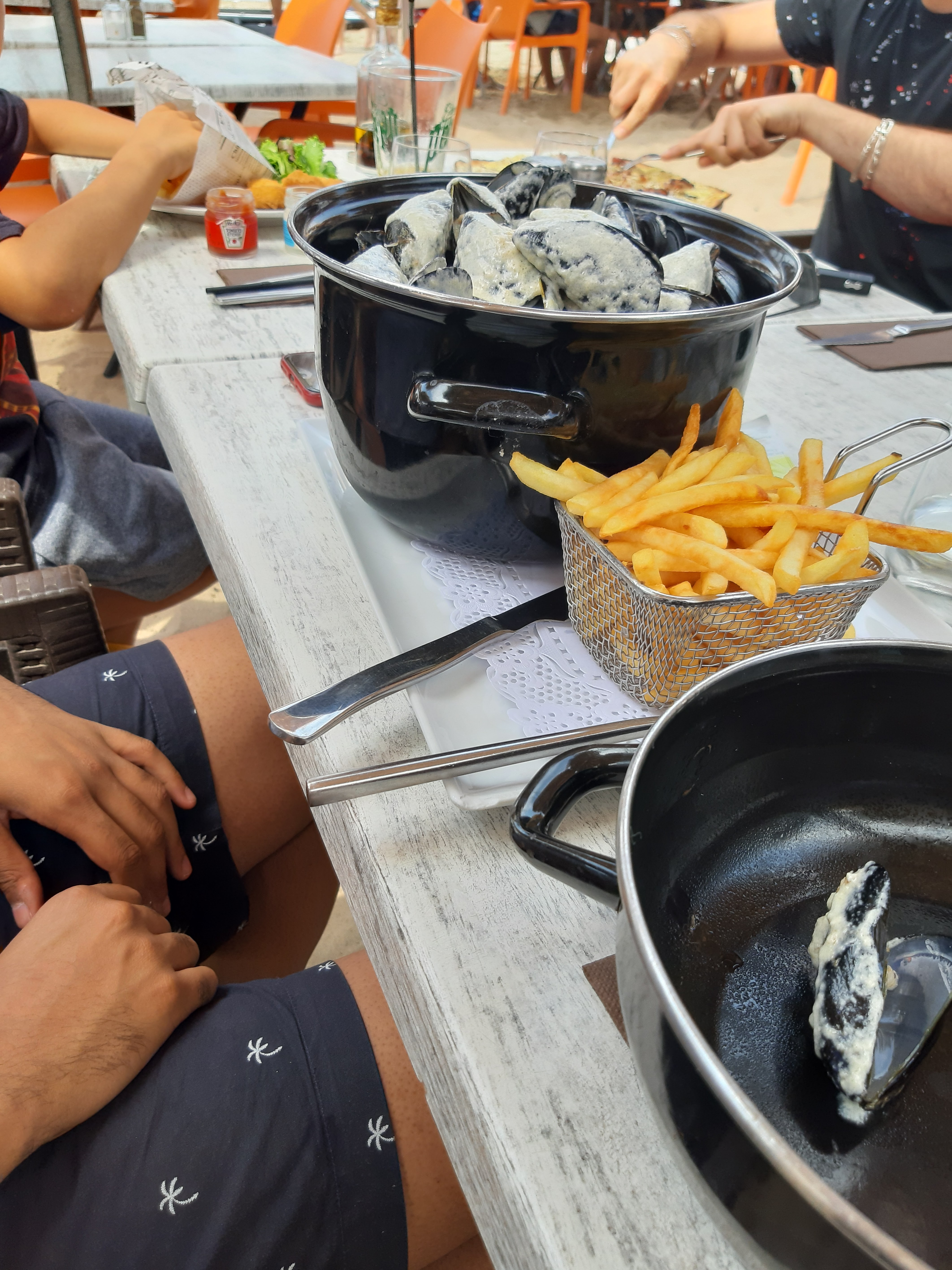 Bof bof… frites pas cuites très blanches, moules mal nettoyées (filaments toujours présents), serveurs pas franchement très aimables (à part la jeune femme) par contre personne ne débarrasse notre table, on a du dire au serveur plusieurs fois « pouvez-vous enlever nos verres d’apéritif? » Point positif: assiette copieuse. Et pour le cadre de la plage: La plage en chantier juste à côté avec les plots et tout le bordel rien est rangé …. Et pourtant c’est blindé le week-end …