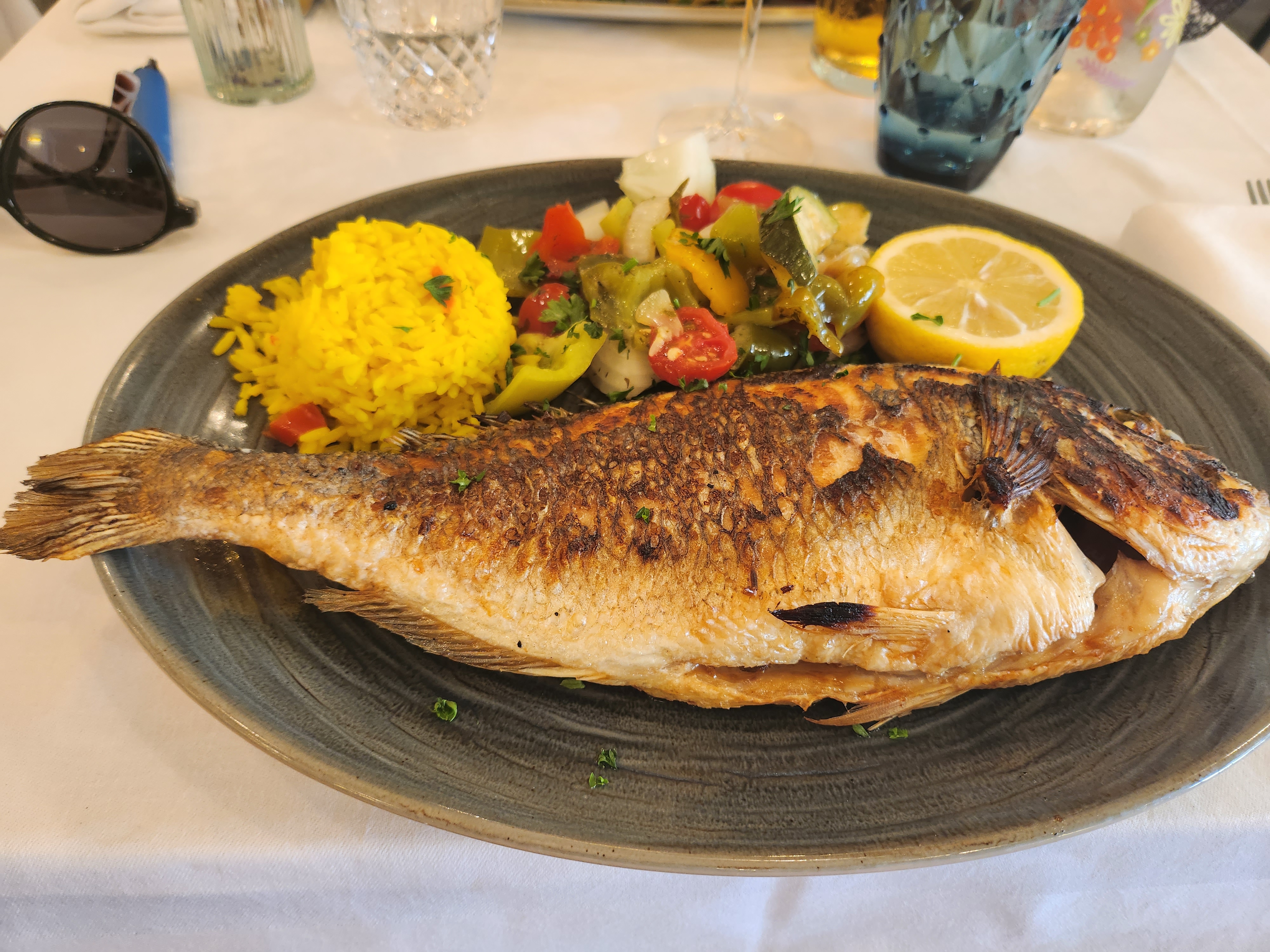 Bon accueil, menu à 28 € plat et dessert. Loup grillė cuit à pointpoint avec accompagnement adéquat. Très bien situé, à la fin un petit verre pour la digestion. Une bonne adresse.