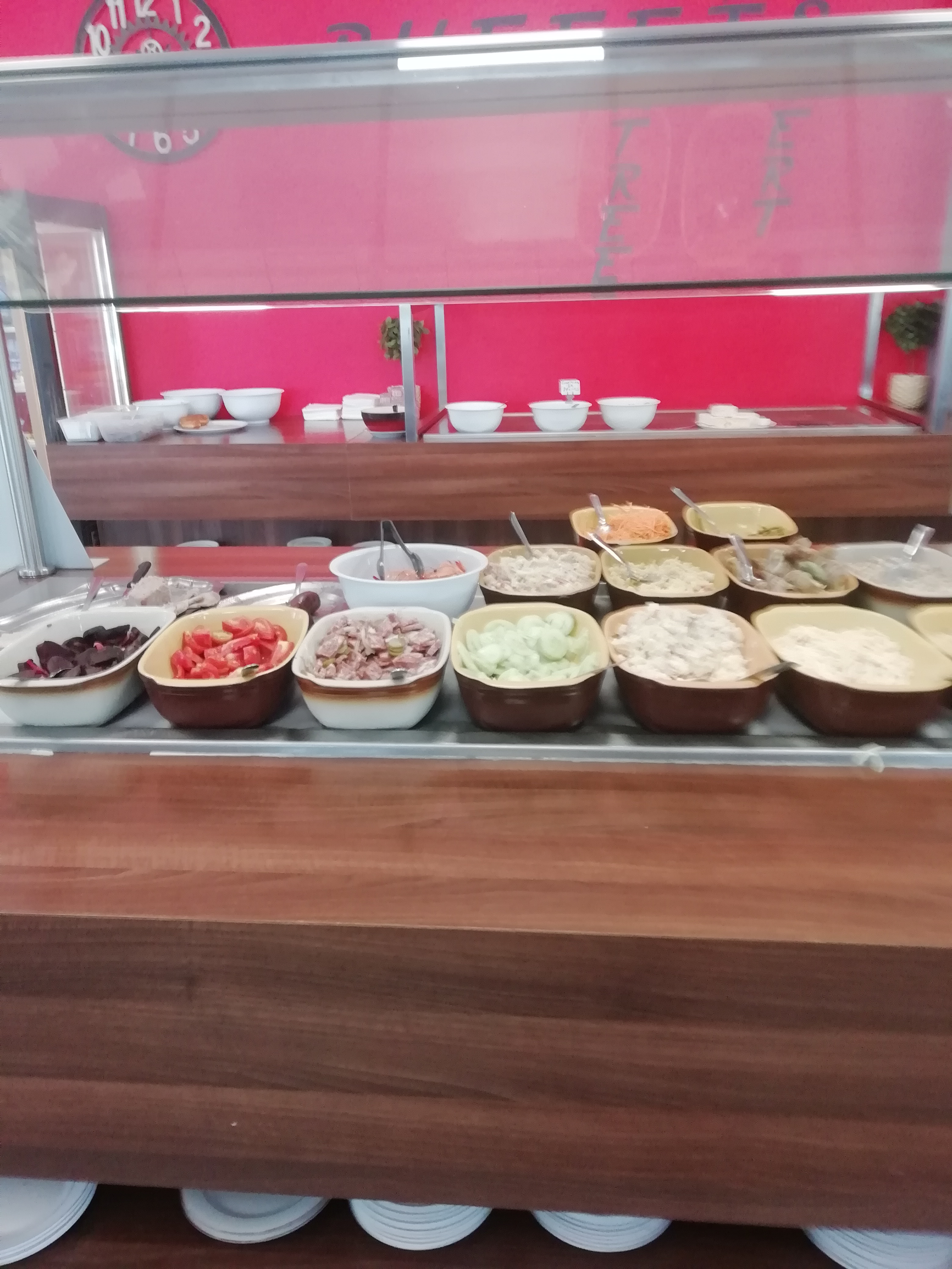 On est arrivé mon fils et moi vers 13h, presque plus de choix dans les plats cuisinés, il ne restait qu'1 fifteak dans un plat, quelques morceaux de saumon et saucisses... Et plus de frites.. Quand au dessert, plus de fruit, que du fromage blanc sur ce grand présentoir, c'est assez décevant...