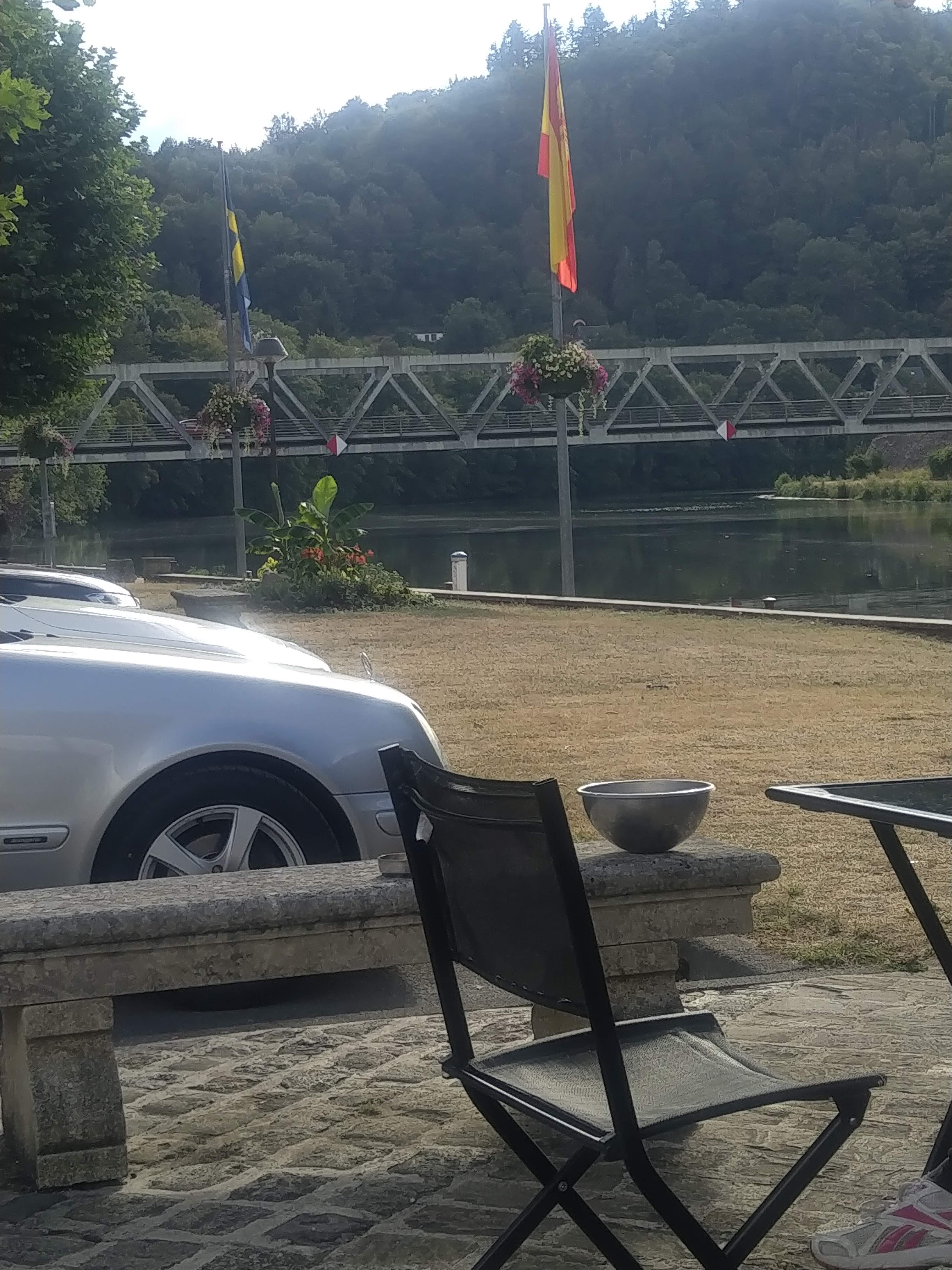 France, village appelé Fumay, terrasse près de la Meuse. La nourriture est très bonne et abordable, le service sympathique, marché le mercredi
