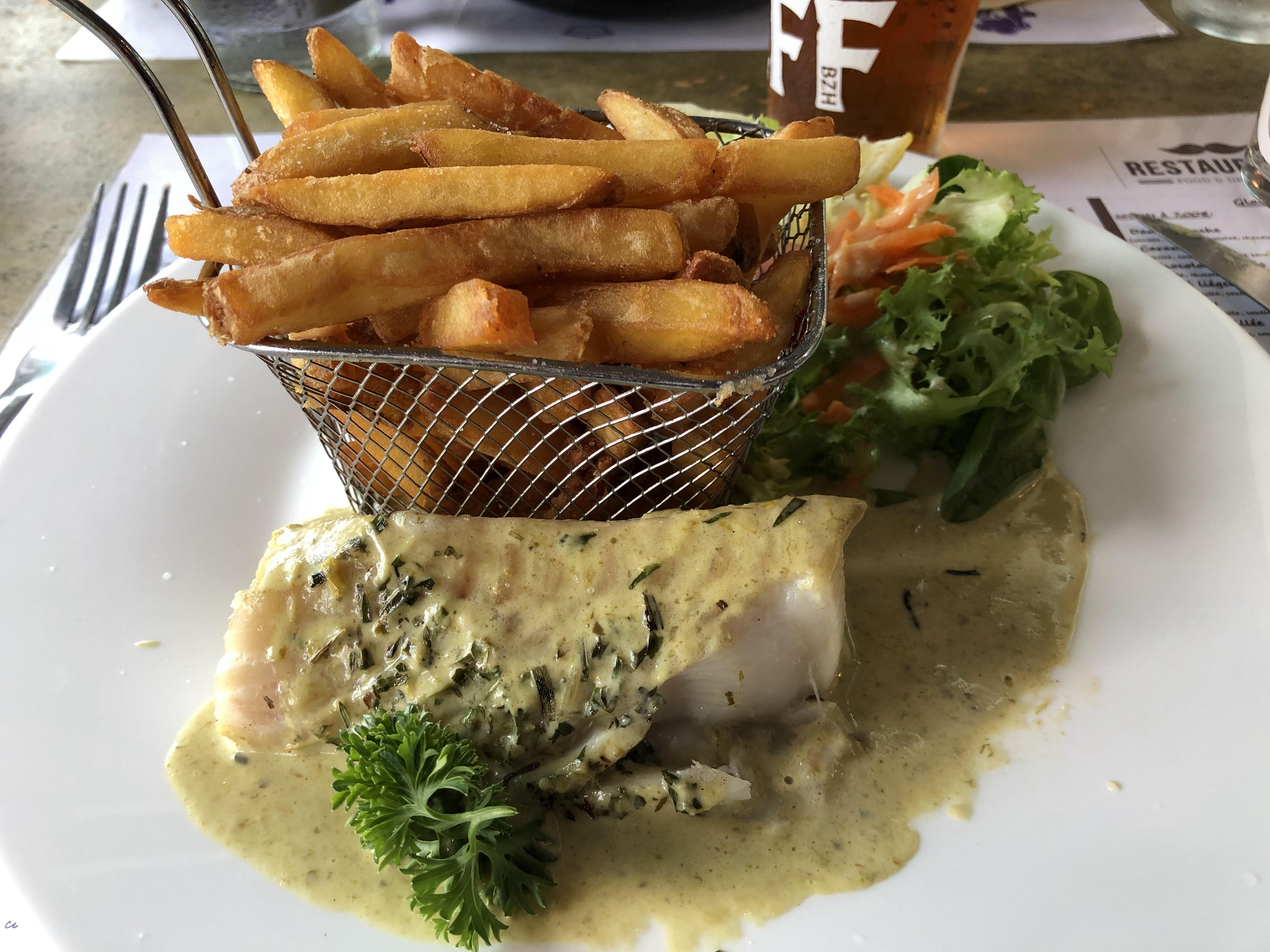 Un morceau de cabillaud sec, tiède, fade avec, je pense une St Jacques minuscule et une crevette aussi minuscule, quelques légumes que je n’ai pas pu identifier, du riz mal égoutté et fade et, sous tout cela, une tache liquide rougeâtre. On nous avait prévenu que la sauce au beurre blanc avec du vin rouge. Cette sauce n’avait rien à voir avec une sauce au beurre blanc. J’aurais aussi pensé qu’un cuisinier savait qu’une sauce nappe le poisson ou la viande.Les choux étaient de fabrication industrielle. Le vin ordinaire et le café acceptable. Nous avons payé cher pour voir des bateaux amarrés pendant que nous mangions.