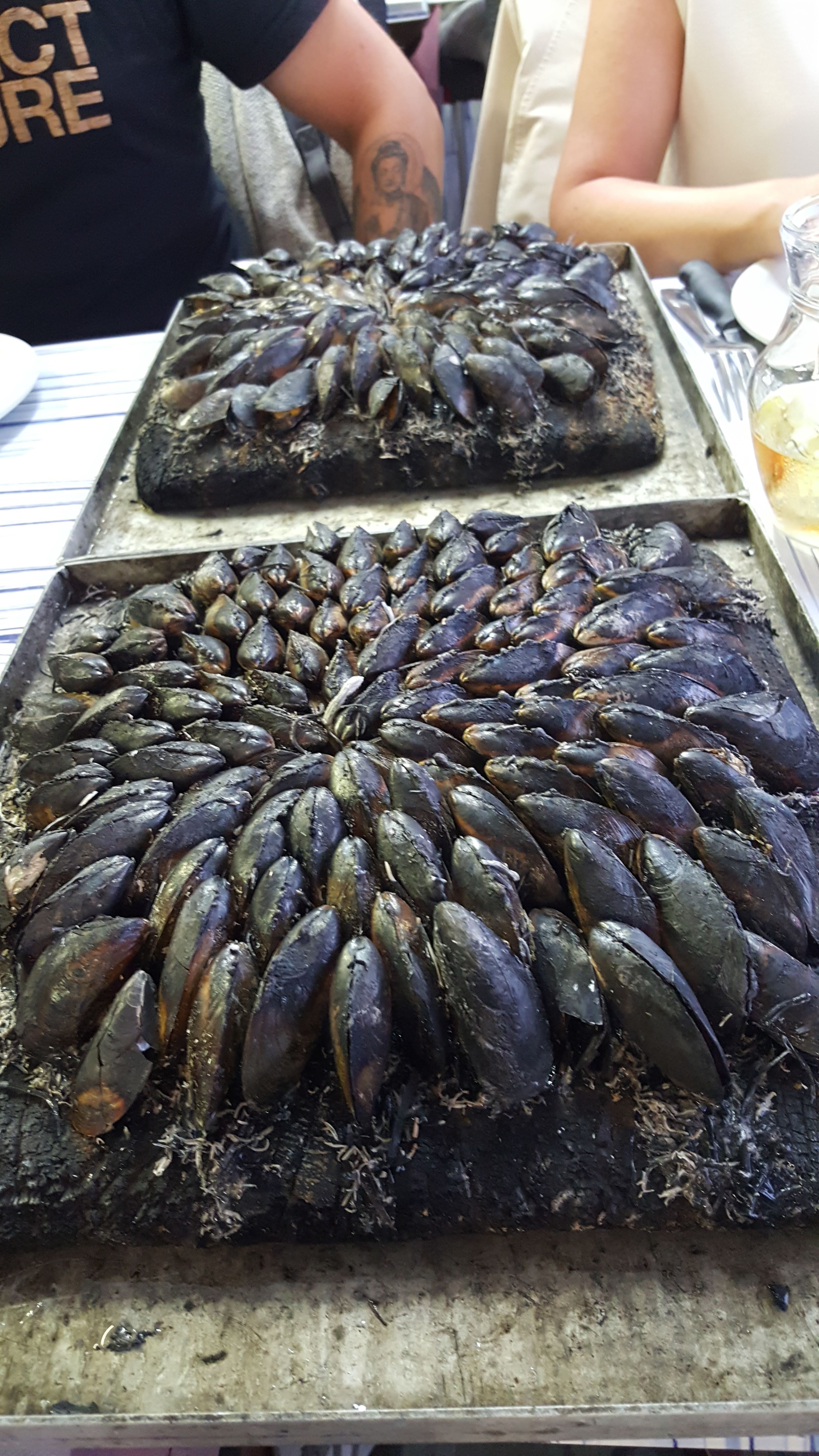 Eclade de moules. Spécialités du 17. Feux en bordure de l eau face resto ,joli , moules excellentes, doigts un peu sales mais lingettes fournies Bien.