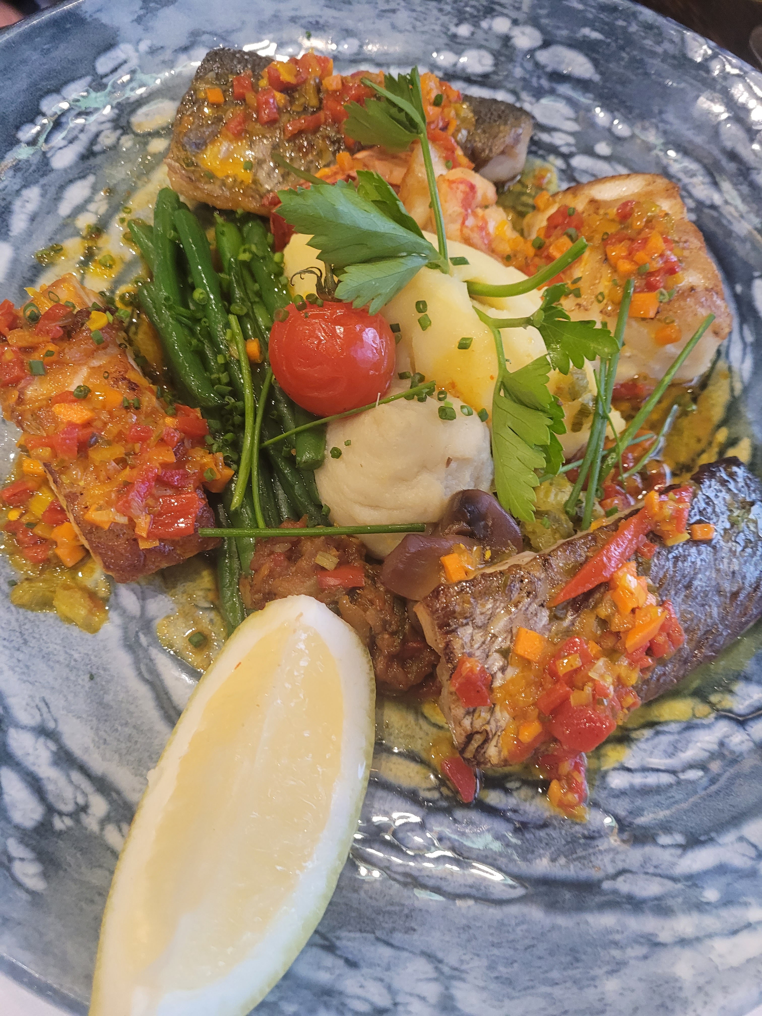 Les fruits de mer sont très bon, ce qui est dans l'assiette en général l'est aussi, juste un petit bémol sur la propreté de l'assiette (l'objet) nous avons eu plusieurs assiettes avec des traces indéterminées sur un service de 3 couverts.