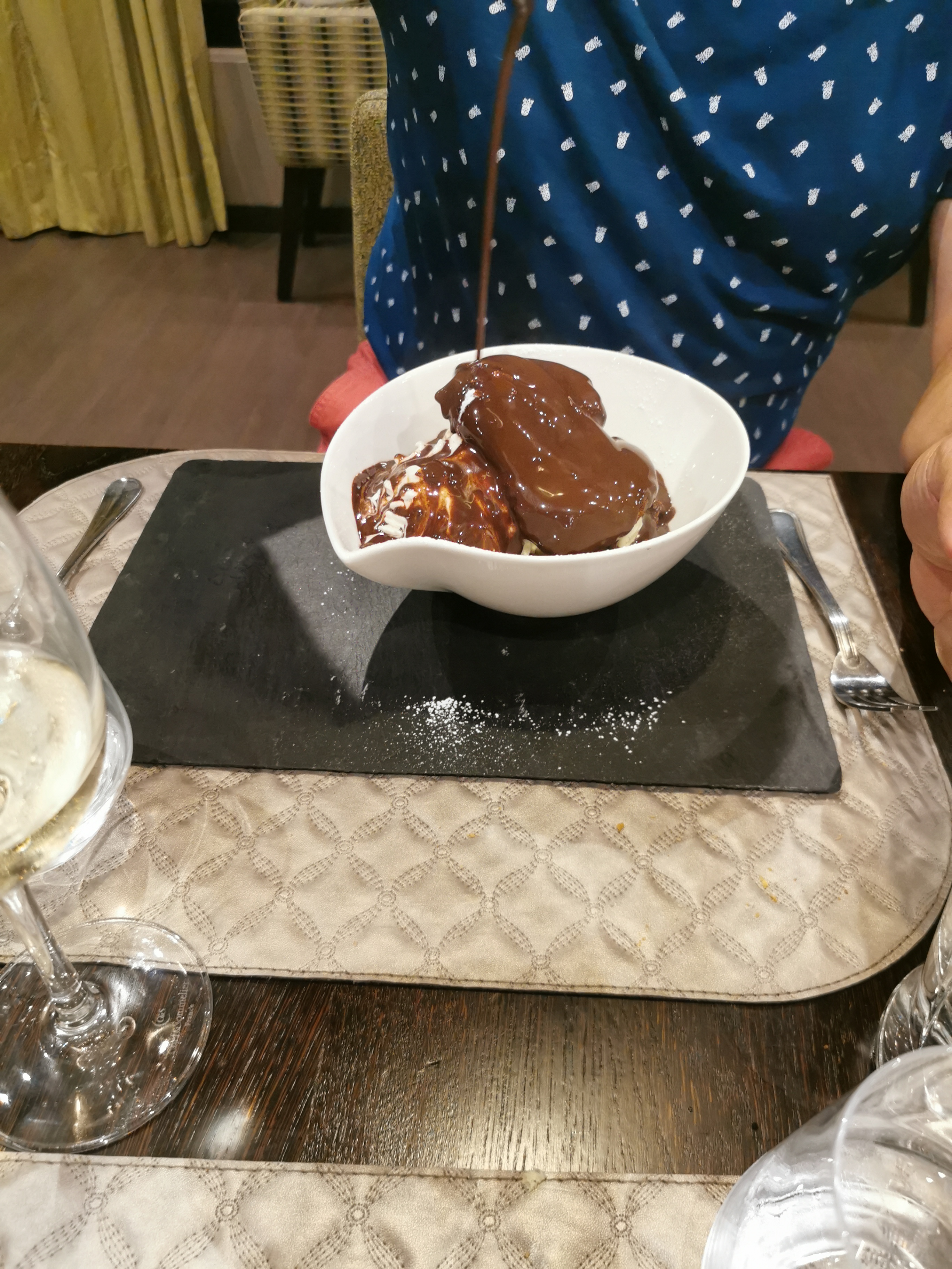 Service et cuisine de qualité, on s’est régalés ! 😋 Entrée : lasagnes de cèpes Plat (ardoise) : poêlée de st Jacques, purée de patates douces Dessert : Profiteroles, et baba au rhum pour mon grand-père