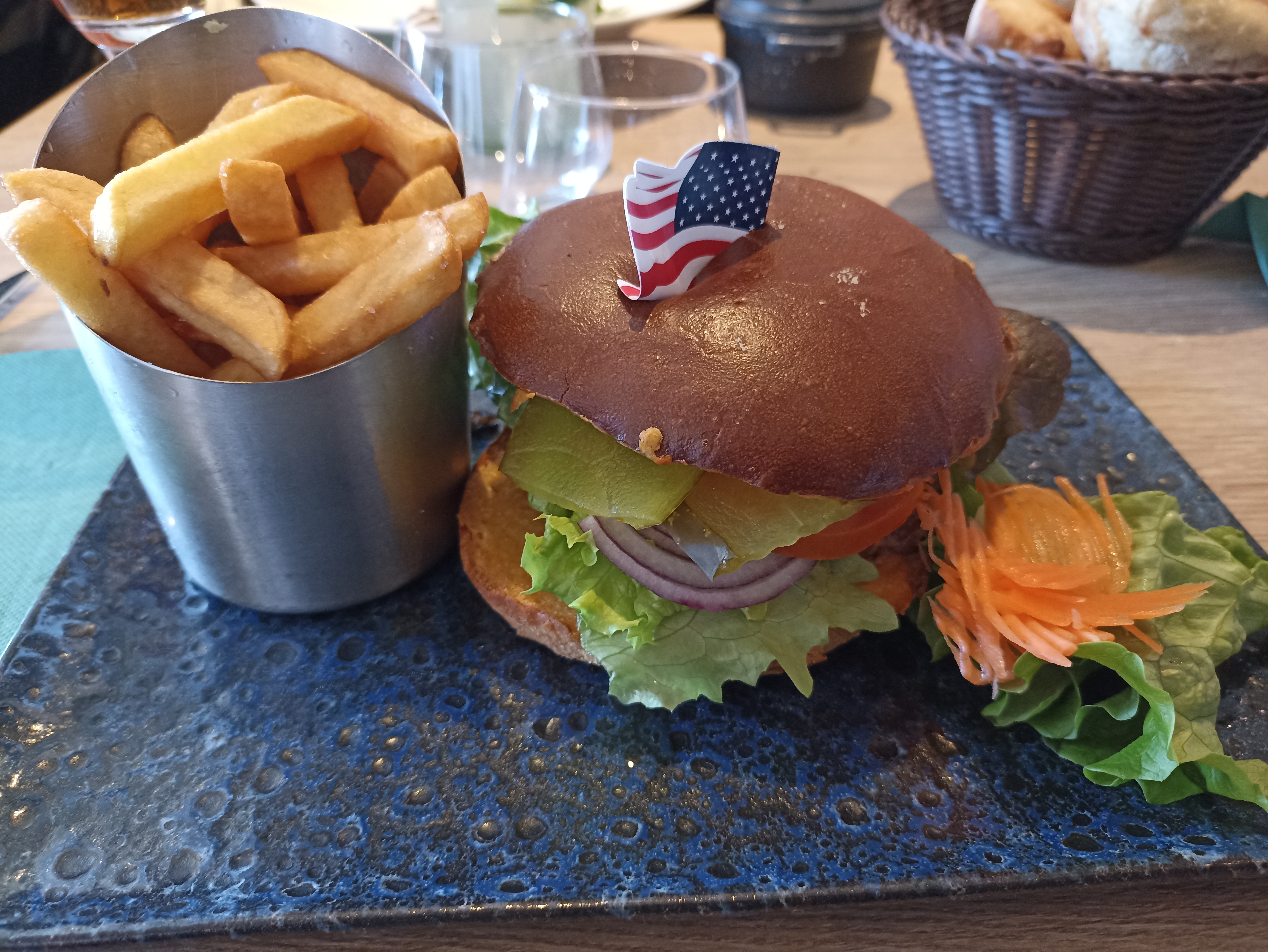 Beaux plateaux de fruits de mer. Par contre, c'est le plus mauvais hamburger que j'ai jamais mangé ! Je suis tombé sur un morceau impossible à mâcher ( nerfs) que j'ai laissé au bord de l'assiette. Pas suffisamment de sauce, c'était sec. Le pain brioché industriel, fadasse. Des frites debout dans un petit godet. Ça pour 17,50 € - cela ne les vaut pas. Confit de queue de porc, banal, petite portion aussi, comme les frites ! Glace américaine : décevante aussi - très petite portion pour le prix. Accueil expéditif : quand vous avez terminé, on vous débarrasse ostensiblement, puis si vous restez à discuter, on vous amène l'addition - histoire de bien vous faire comprendre qu'il faut libérer la table. Je ne reviendrai pas dans cet établissement.