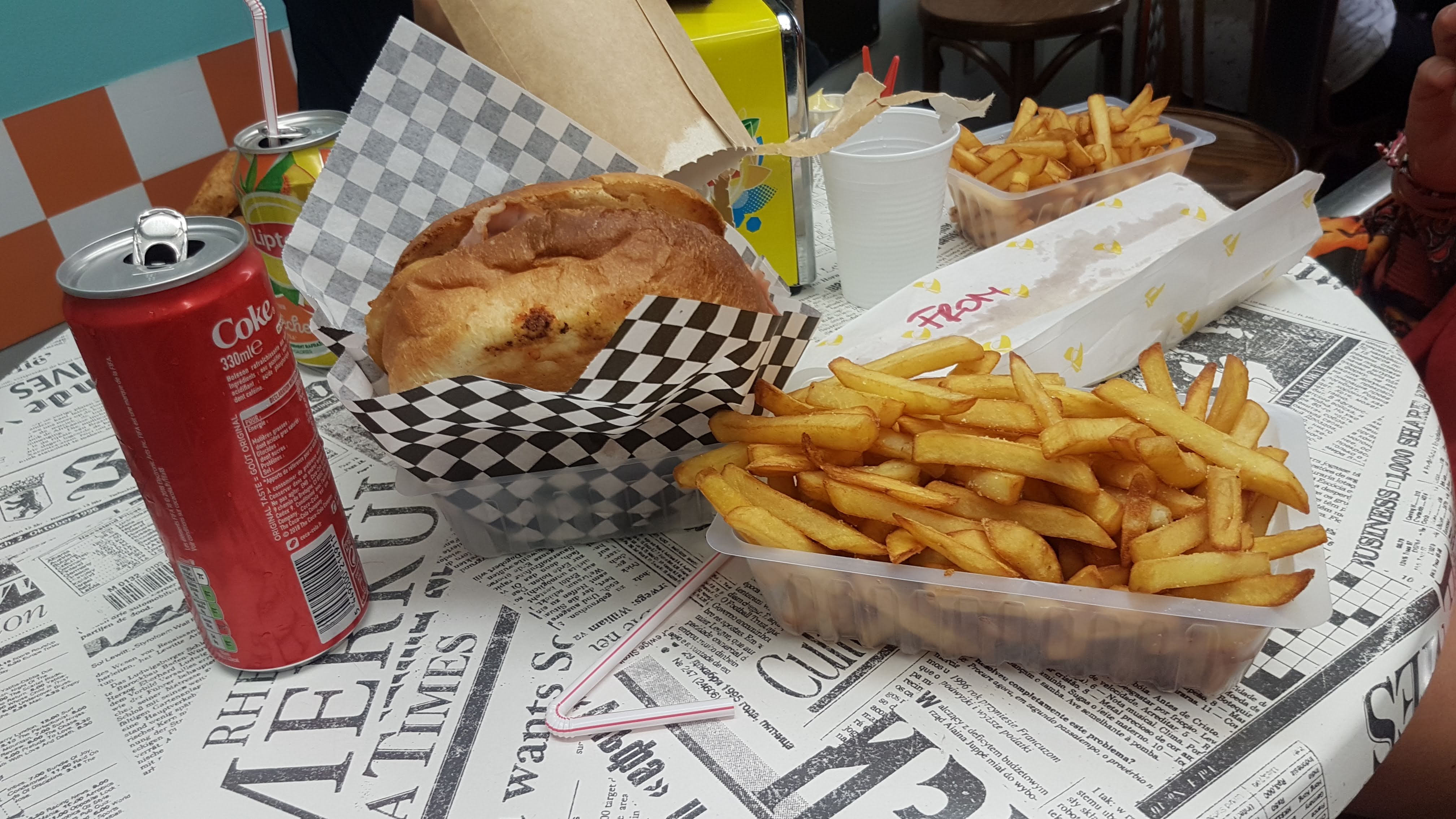 Américain merguez frites « merguez cramée, sauce grattée sur le pain et frites trop cuites »