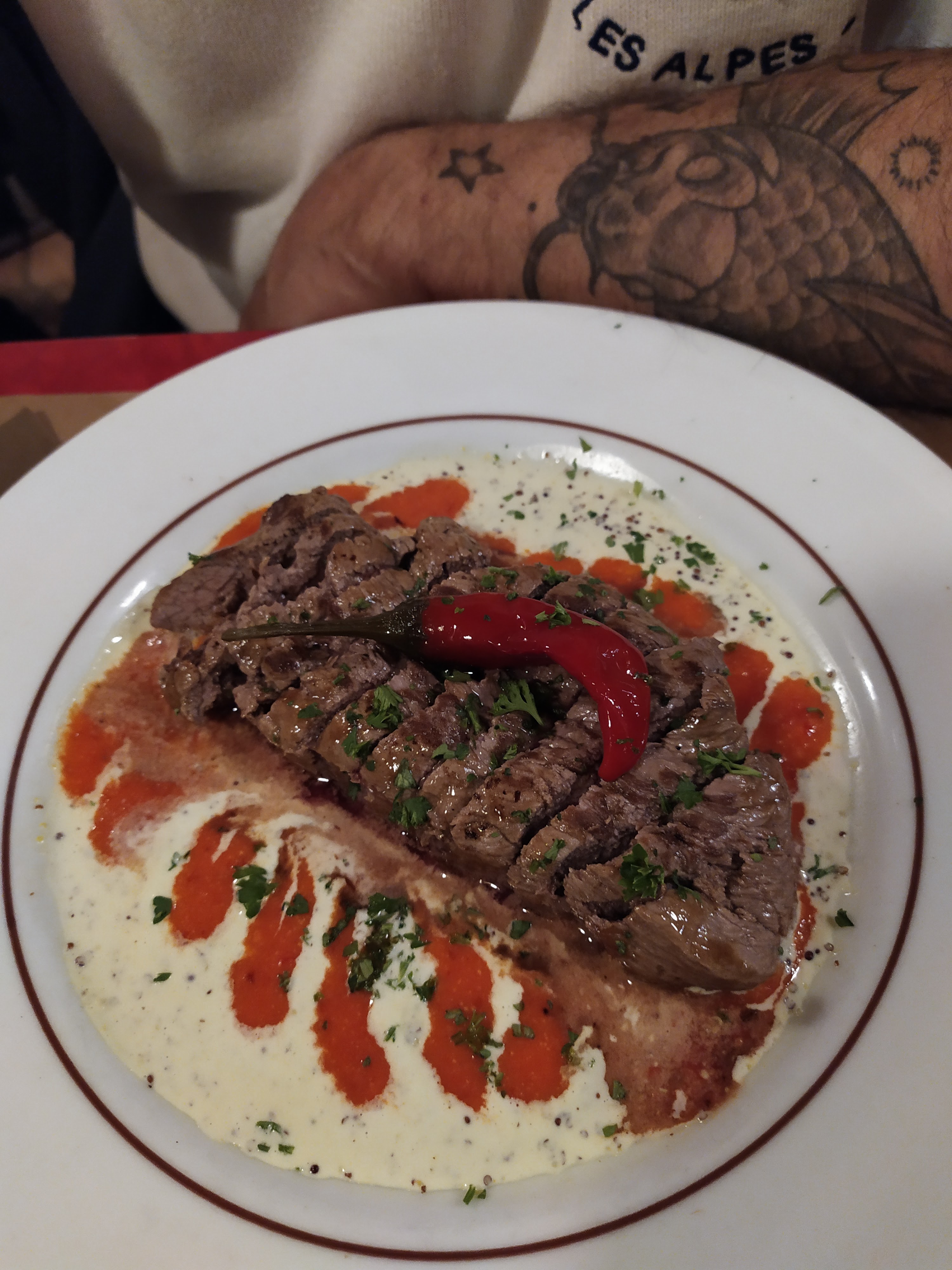 Une piètre copie du restaurant « l’assiette au bœuf »… En ce qui concerne la nourriture, rien de particulier à signaler. Ce n'était pas exceptionnel, mais cela convenait. Cependant, nous avons trouvé que l'absence de carte pour les boissons rendait le choix peu pratique. De plus, le vin était servi un peu trop chaud. En revanche, nous avons été déçus par le service. Nous avons assisté à un conflit entre le personnel et le comportement du serveur incluait des blagues plutôt gênantes. Les frites étaient servies dans de très petits contenants, et lorsque nous avons demandé d'en avoir plus, nous avons eu l'impression de déranger. Finalement, nous avons décidé de quitter le restaurant après le plat principal et d'aller prendre le dessert ailleurs. Nous ne voulions pas déranger davantage.