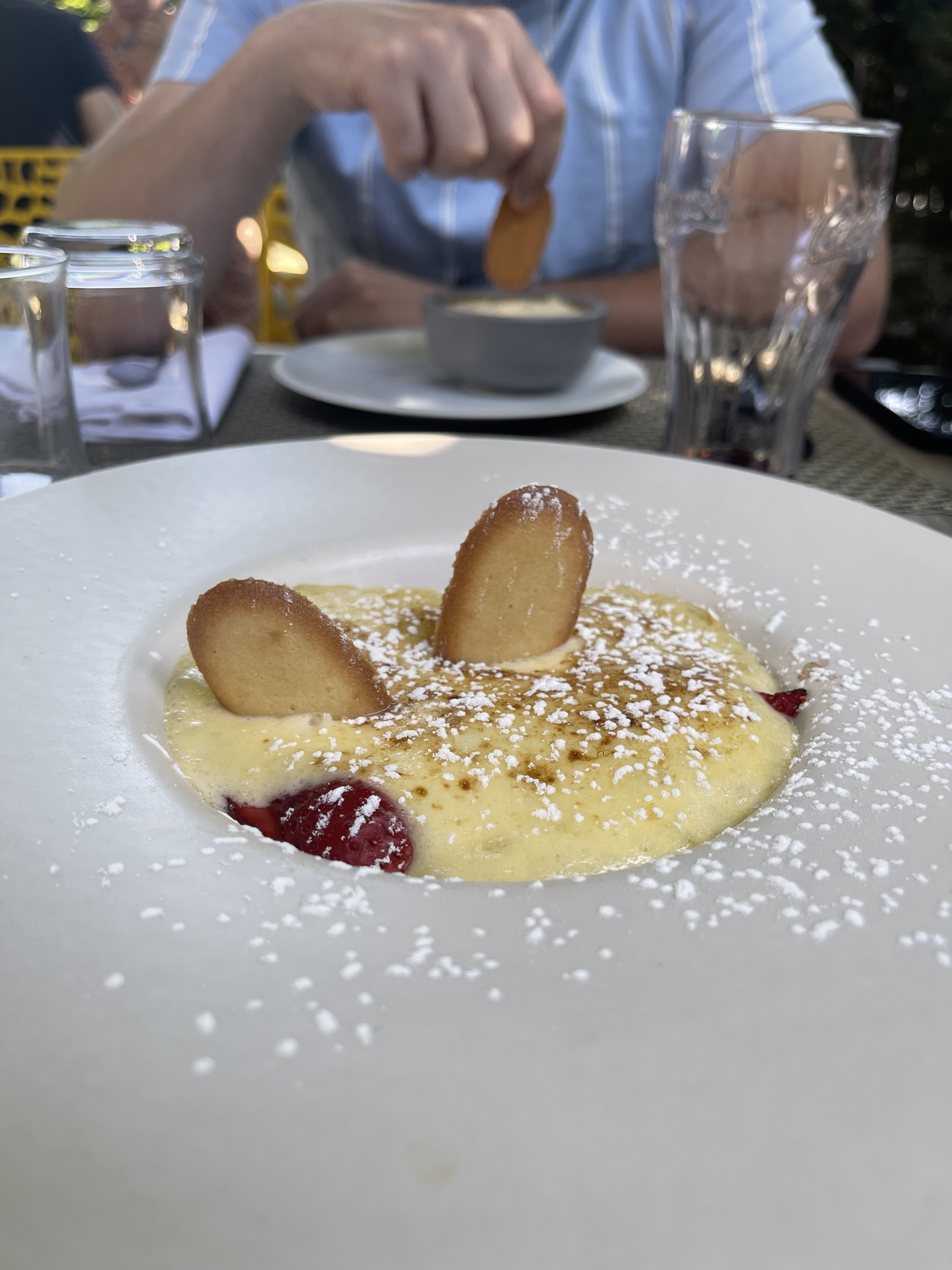 Terrasse agréable sous les arbres. Accueil jovial et service impeccable et surtout très à l'écoute des demandes. Cuisine recherchée avec des produits frais. Entrées et plats bien maîtrisés mais les desserts ne sont pas réussis et surtout bien moins goûteux que les plats .Dommage ...