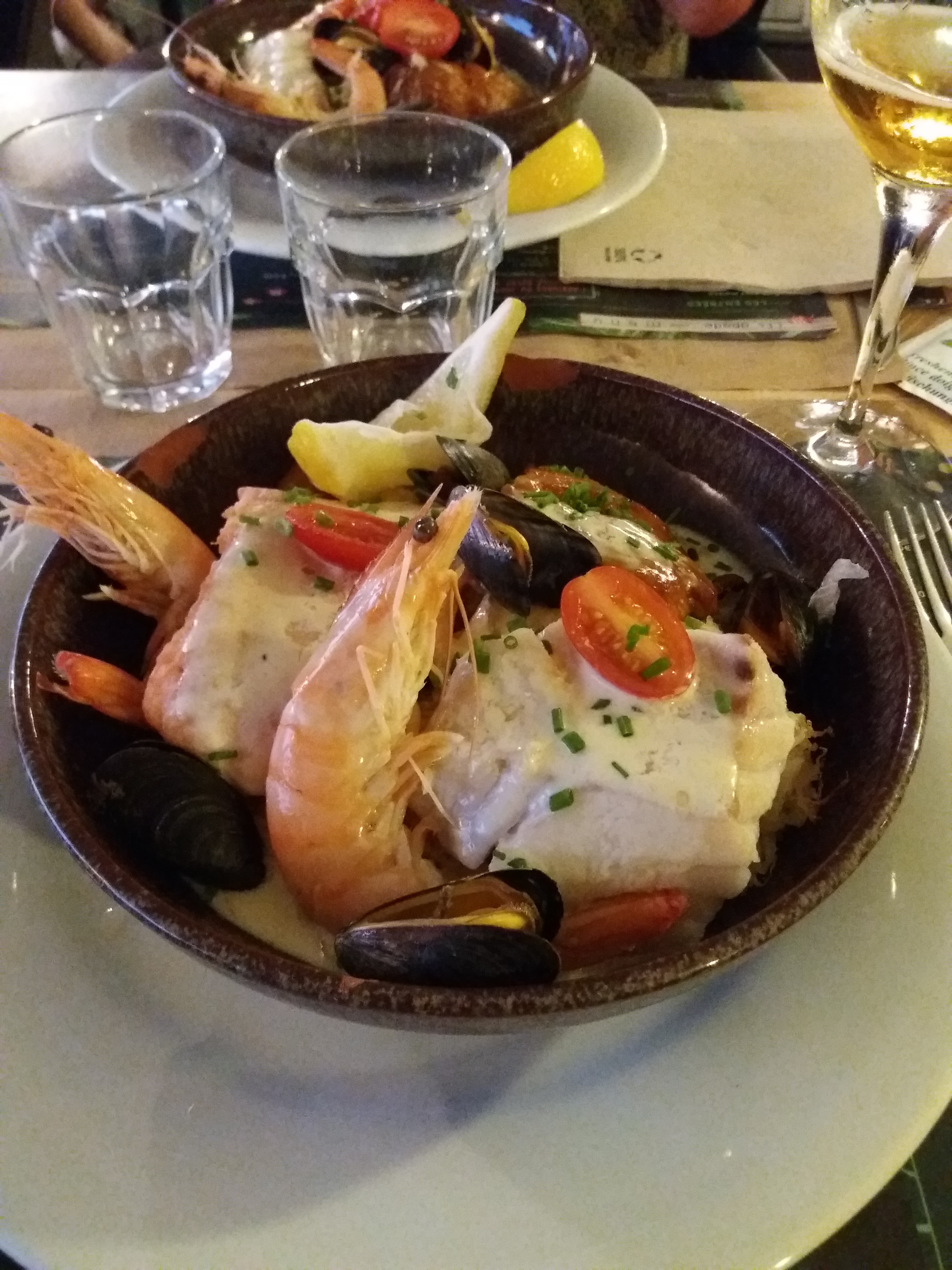 La plus part on pris des moules (moi y compris), il y a rien à dire elles sont très bonnes mais je dirait légèrement chère pour la quantité qu’il y a. Une amie a pris le camembert au four et pareil très bon mais trop cher pour ce qu’il y a dans l’assiette (même pas une pomme de terre). Donc c’est pour ça que j’enlève uniquement 1 étoile parce que le cadre ainsi que le service était très correct.